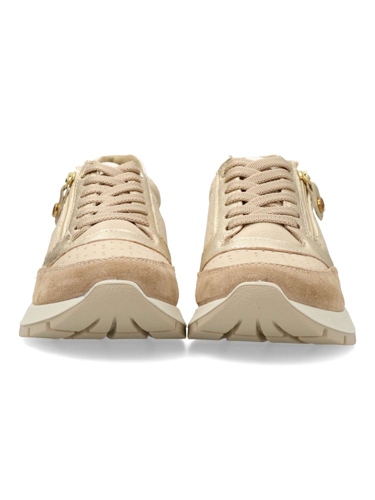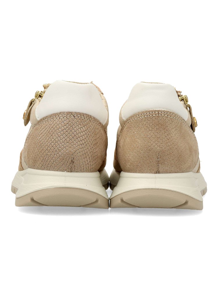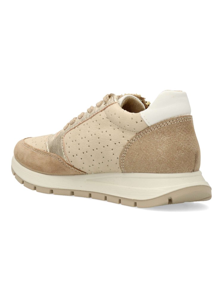 Zapato cómodo de mujer, estilo casual. Cierre de cordones y cremallera. Sneakers ligero, flexible y transpirable. Fabricado en piel natural. Plantilla extraíble de piel. Color beige-taupe. Diseño versátil y confort en tu día a día.