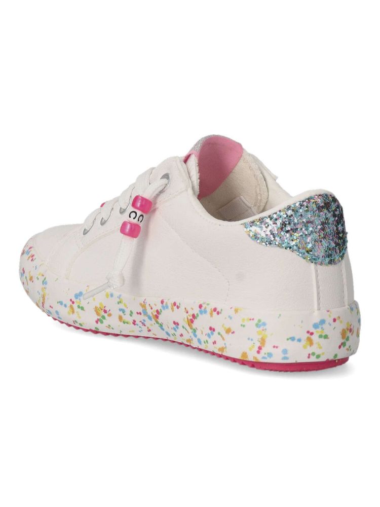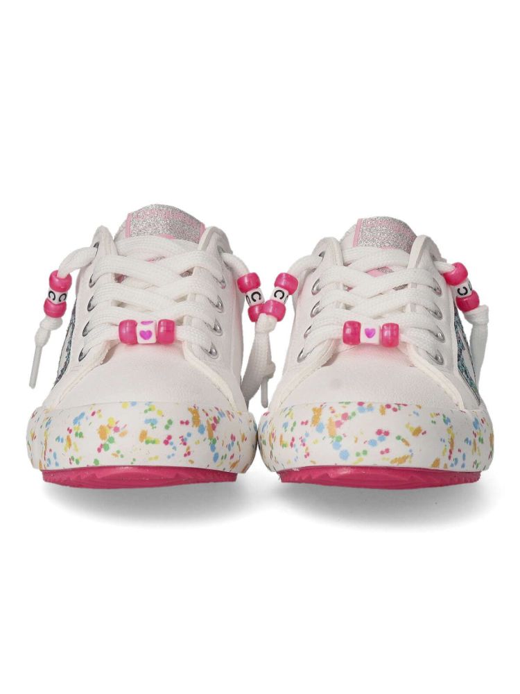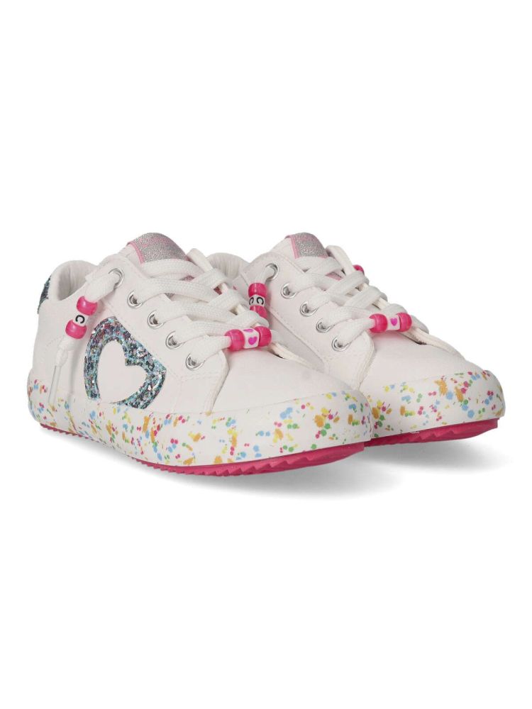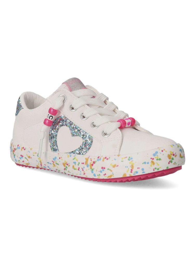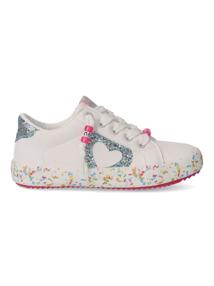 Zapatillas deportivas de niña, estilo casual. Cierre de cordones. Fabricadas en piel sintética con suela de goma. Plantilla acolchada. Color blanco. Detalle corazon de glitter. Sneakers llenas de amor. Una fiesta en cada paso de tus peques.