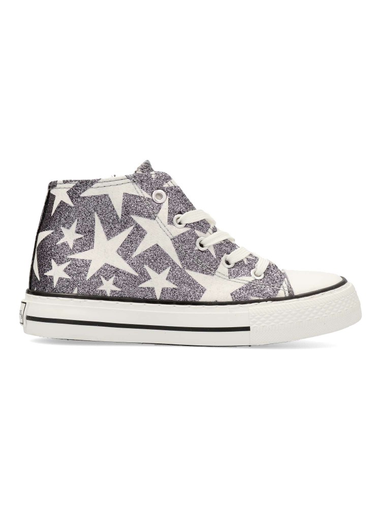 Deportiva alta de niña. Su diseño de caña alta, con un estampado estrellas y acabado brillante, las convierte en un calzado único y lleno de encanto. Cierre de cordones y cremallera. Plantilla textil transpirable. ¡Brilla en la oscuridad!.