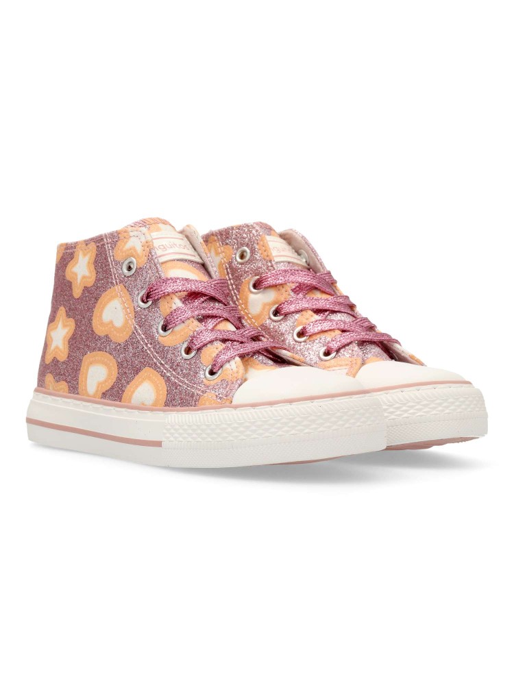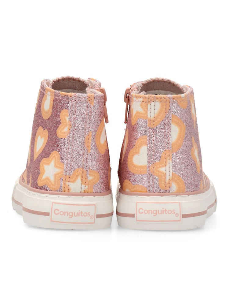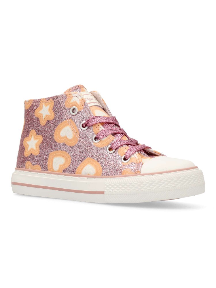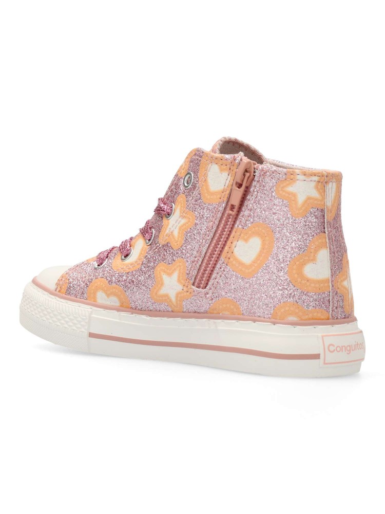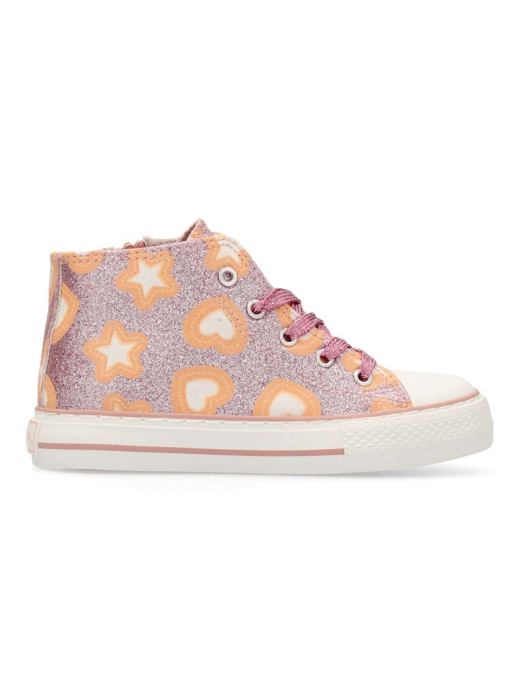 Deportiva alta de niña. Su diseño de caña alta, con un estampado de corazones y estrellas y acabado brillante, las convierte en un calzado único y lleno de encanto. Cierre de cordones y cremallera. Plantilla textil transpirable. Brilla en la oscuridad.