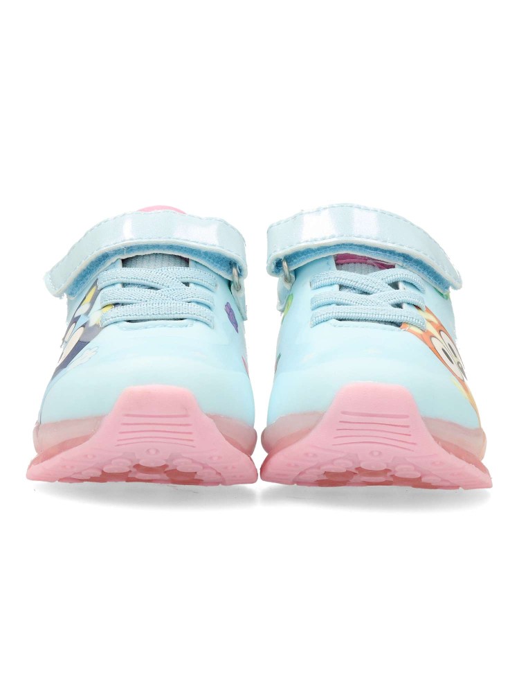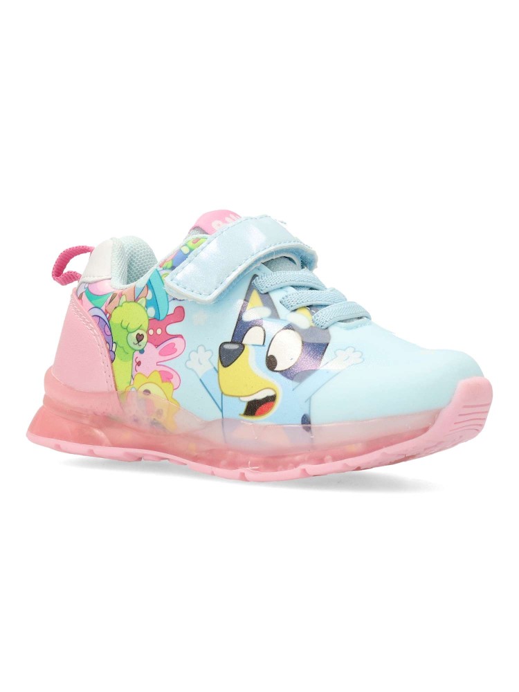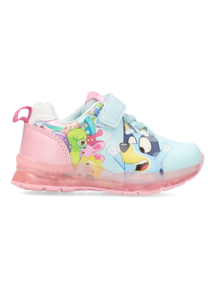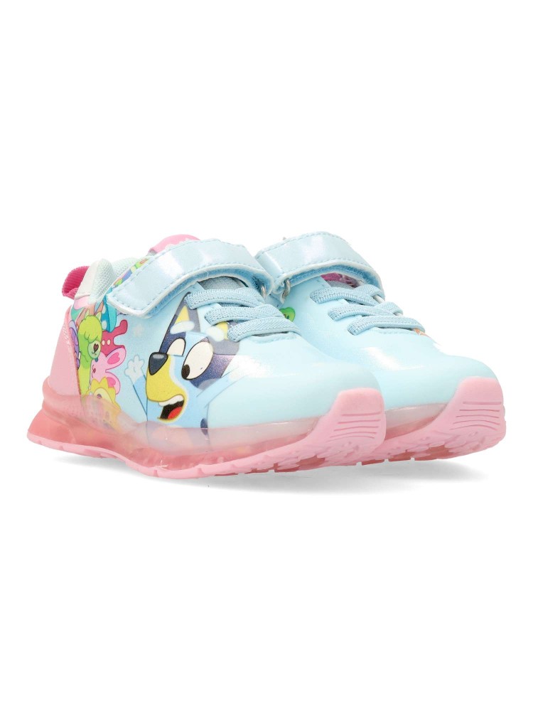 Zapatillas deportivas Infantiles Bluey. Estilo casual para niño con cierre adherente y cordones elásticos. Fabricado en material sintético y textil. Detalle de luces en la suela. Color celeste. Diseñado para el disfrute y confort de los peques.
