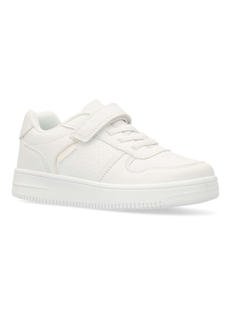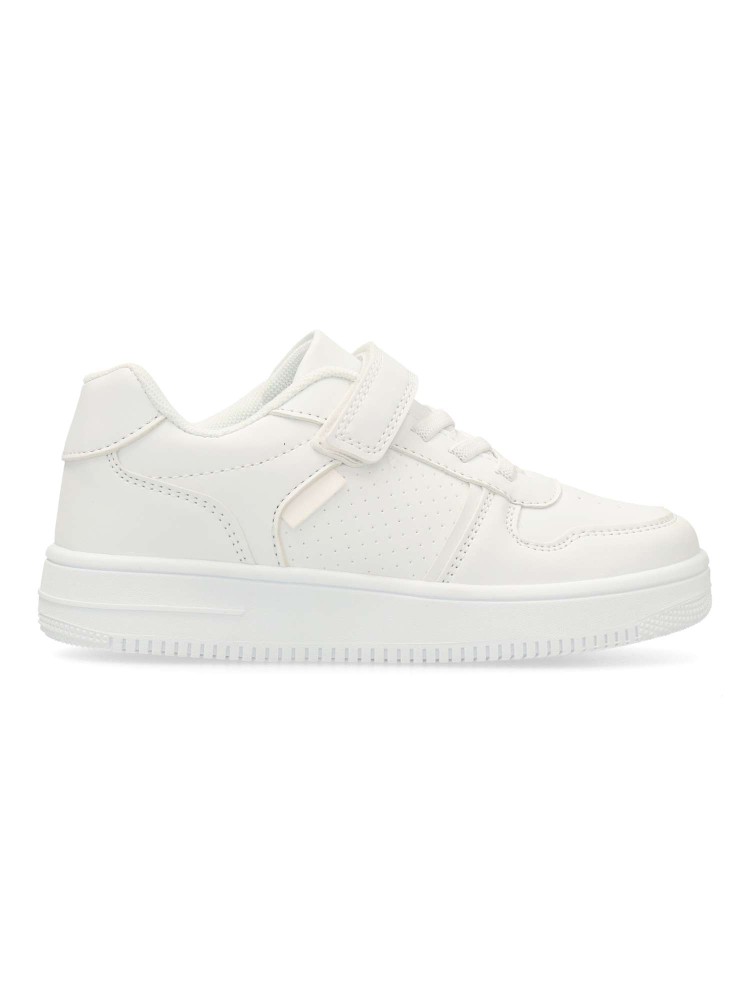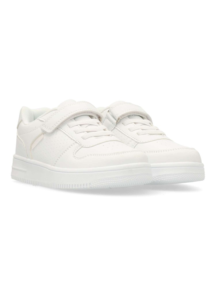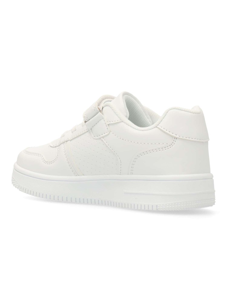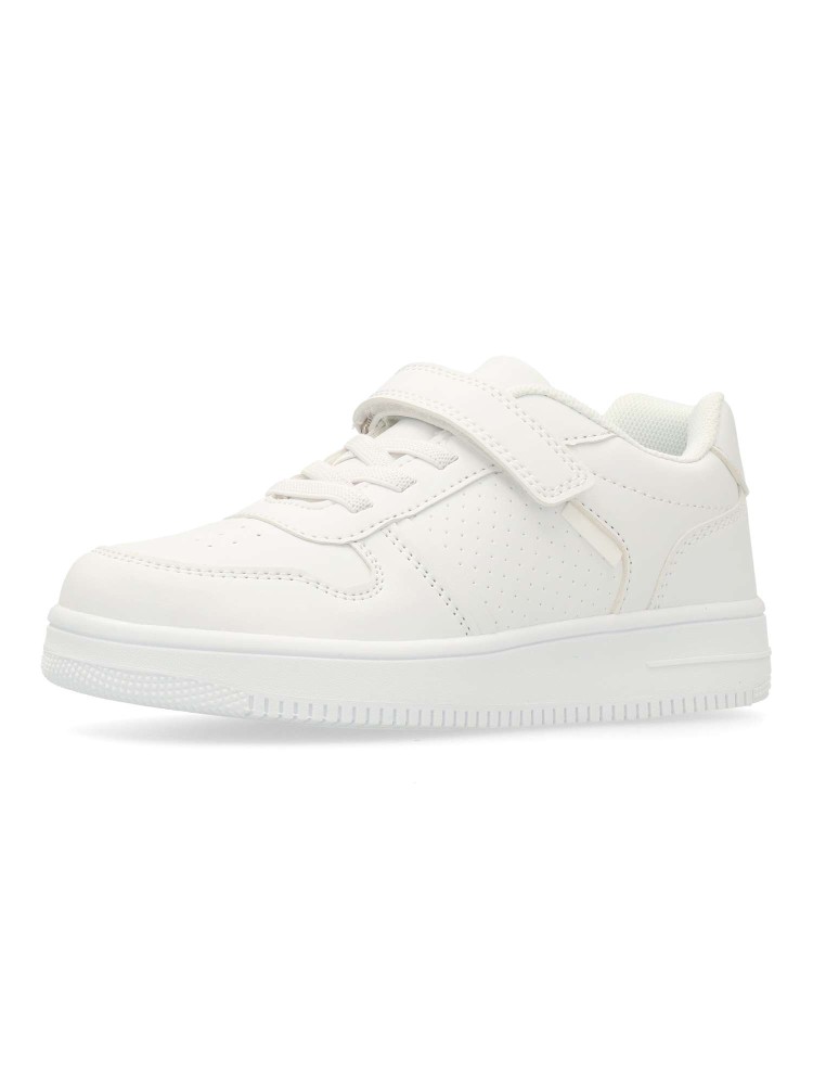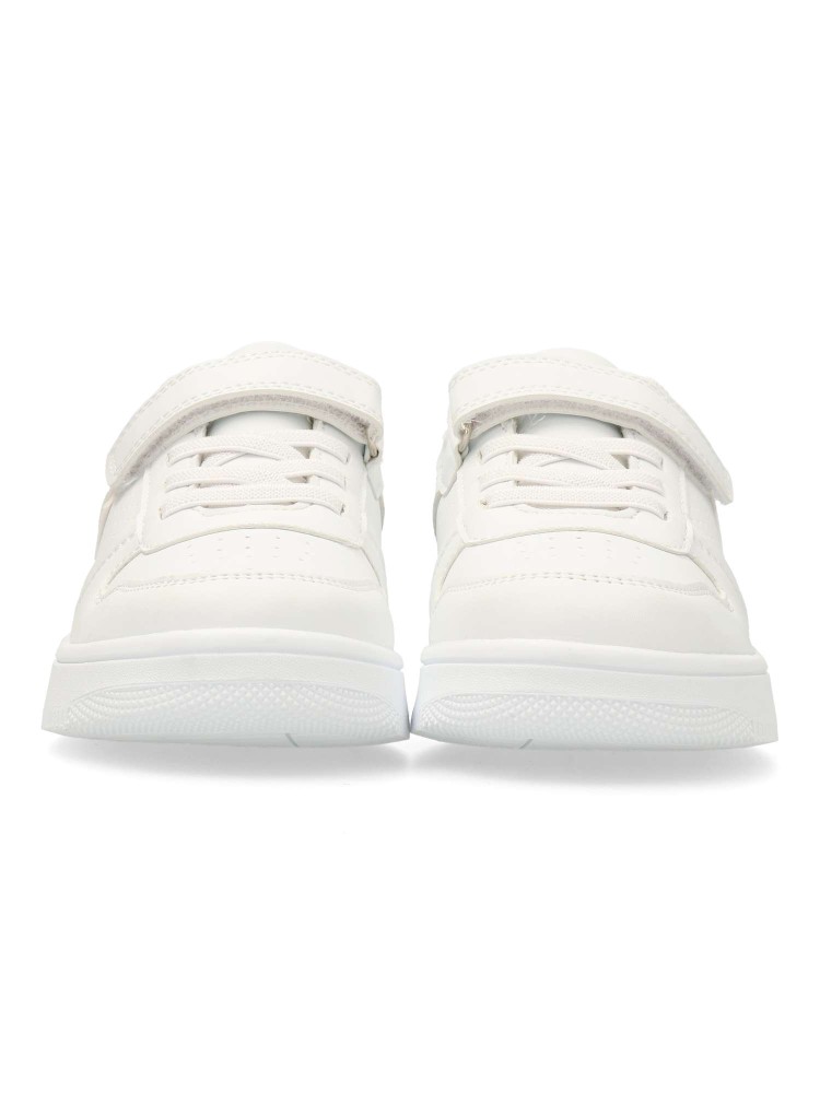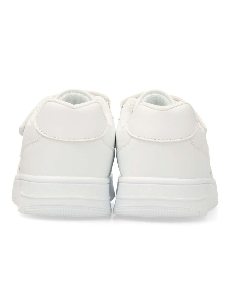Zapatilla deportiva unisex, estilo casual. Cierre de tira adherente y codón elástico. Sneakers fabricado en piel sintética con suela de goma. Color blanco. Ideal tanto para el día a día de los peques, como para uniformes deportivos colegiales.