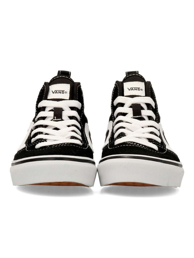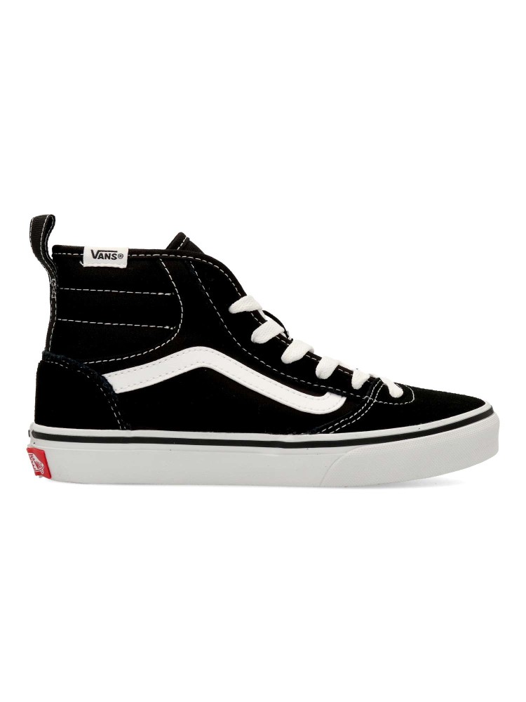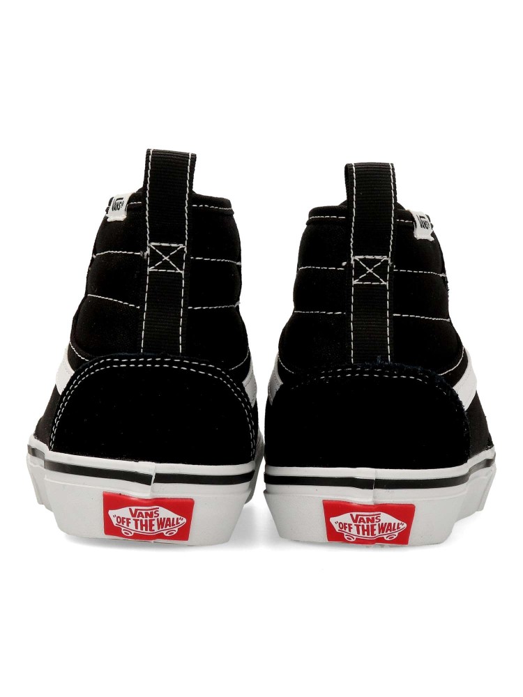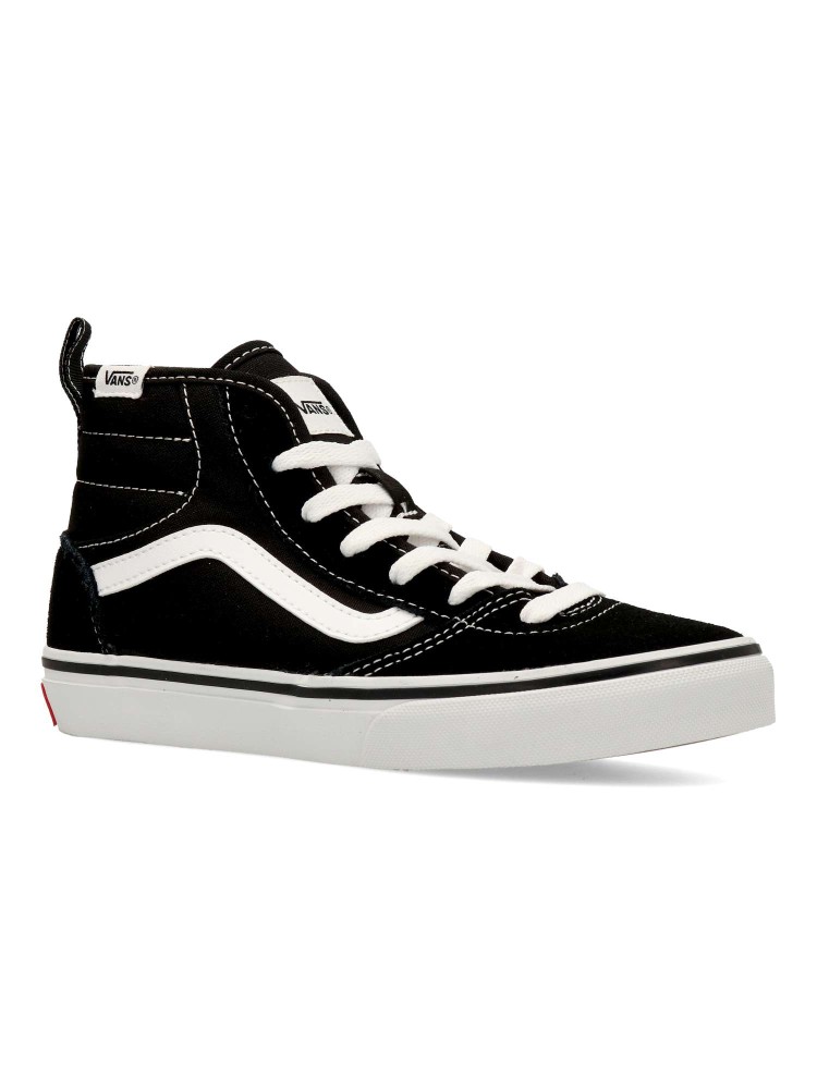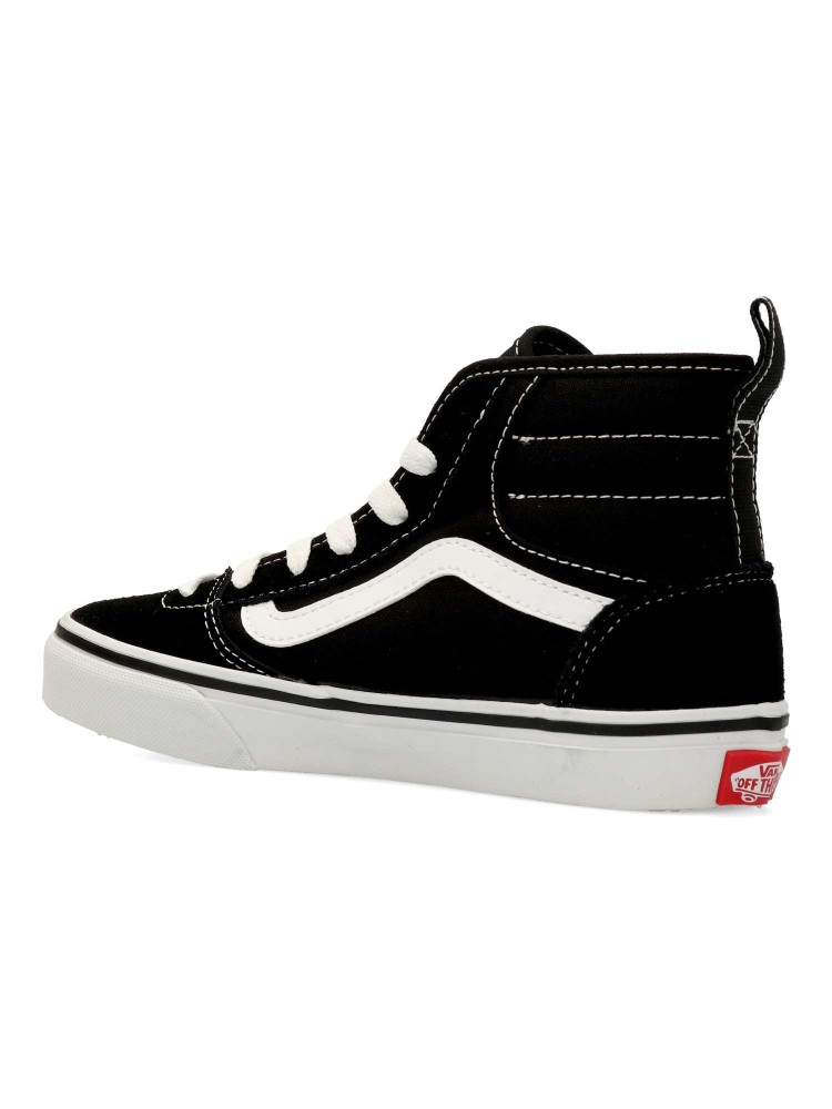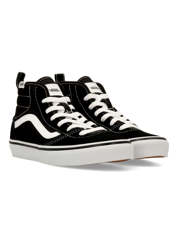 Las Vans Ashwood HI son unas zapatillas de caña alta para niño con cierre de cordones y cremallera lateral. Fabricadas en piel y textil con suela waffle para una tracción duradera. Cuello acolchado. Color negro-blanco. Diseño cómodo y versátil.