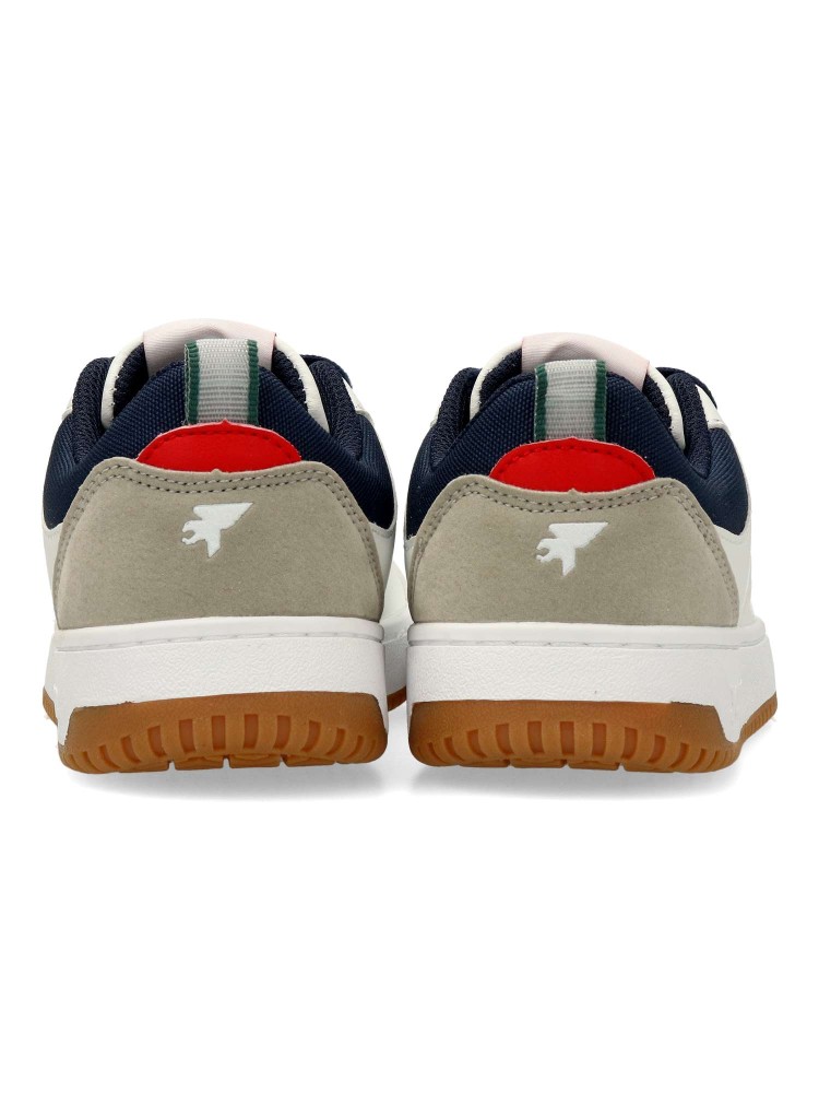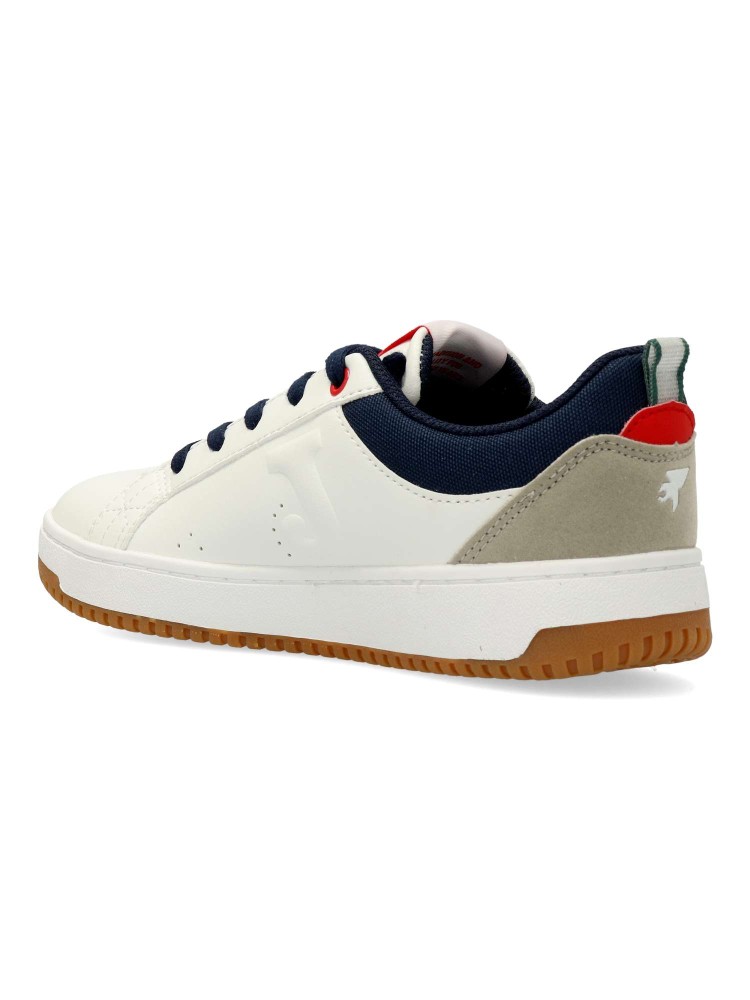 Deportiva de niño, para uso diario y escolar. Cierre de cordones. Sneakers fabricado en piel sintética, con suela de goma. Plantilla acolchada. Color blanco-marino. Diseño sport clásico y versátil, ideal tanto con ropa urbana, como más arreglada.