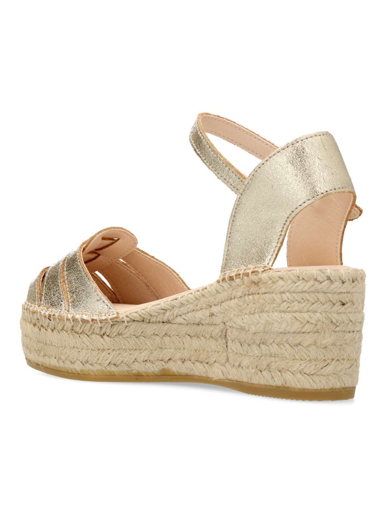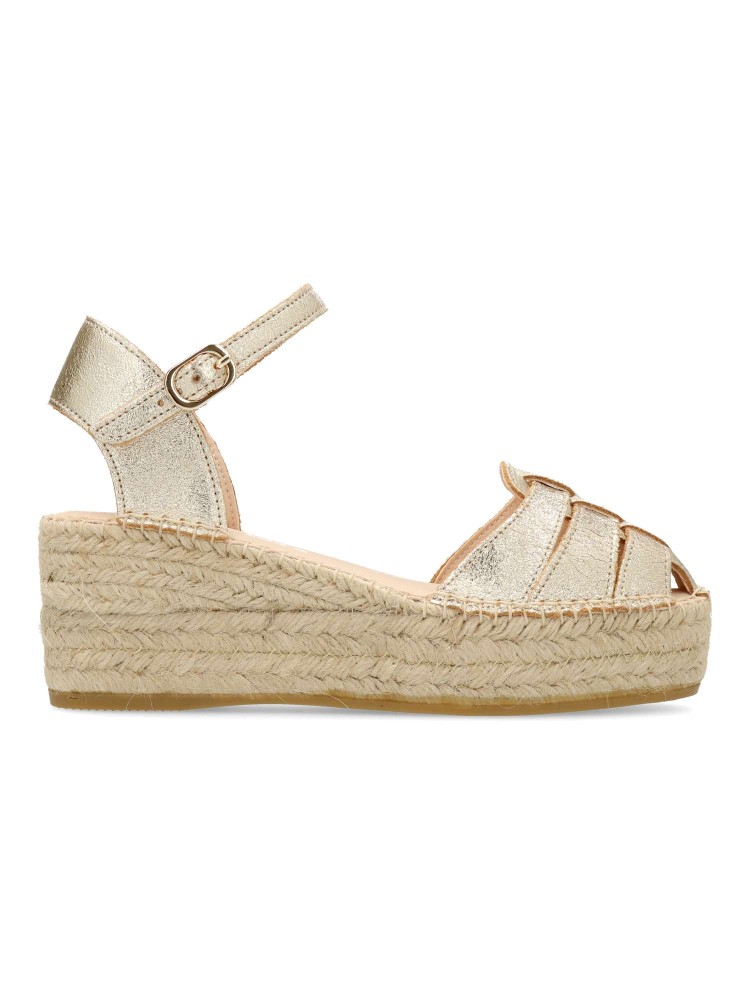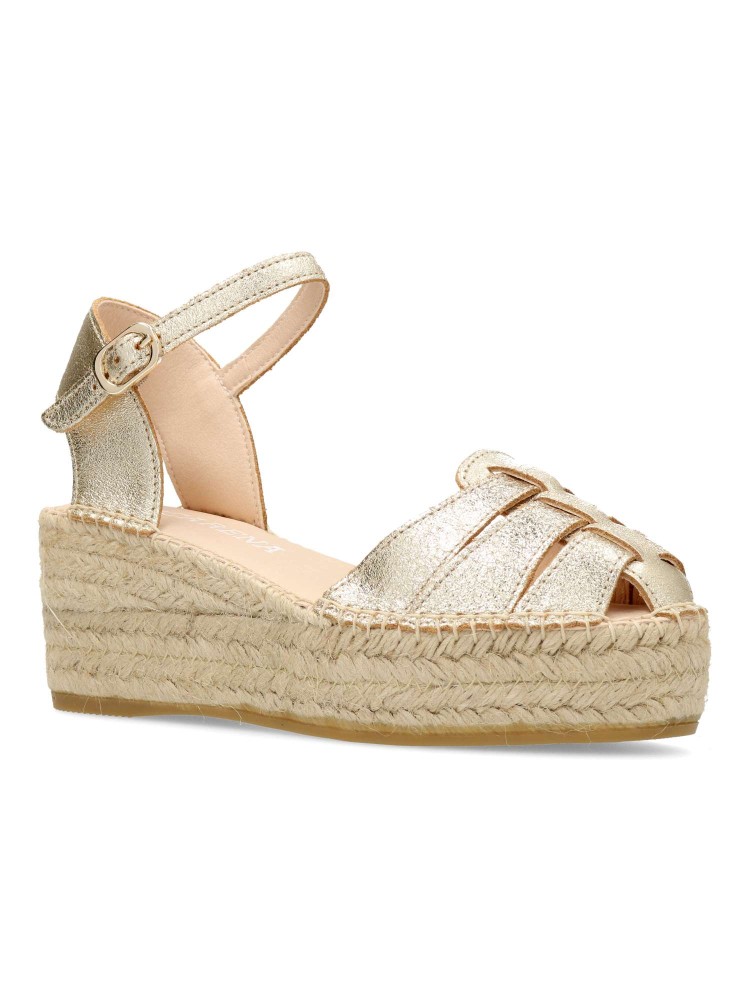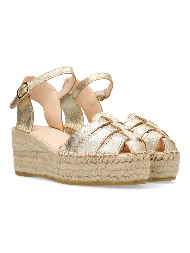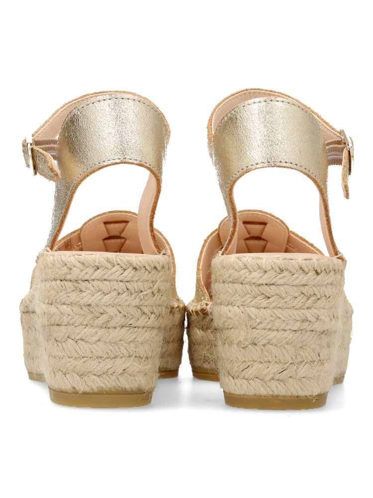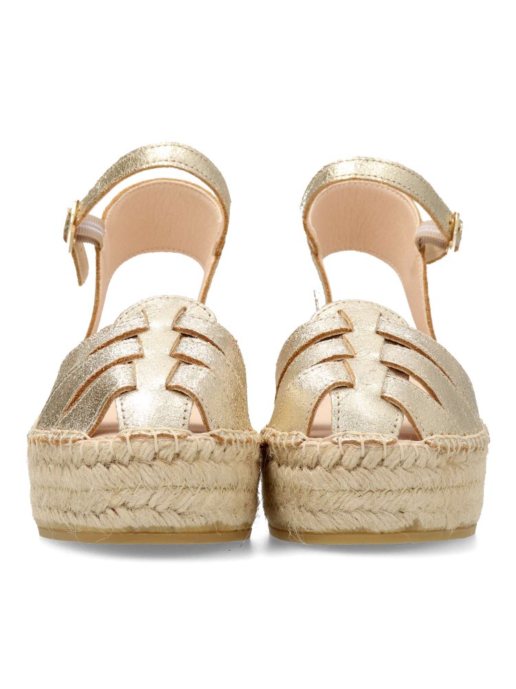 Alpargata elaborada en piel metalizada. Suela de yute natural sobre goma. Planta acolchada. Pulsera al tobillo con cierre de hebilla. Plataforma con cuña de 6 cm. de altura. Esparteñas ideales con tus outfits de verano. Hechas a mano en España.
