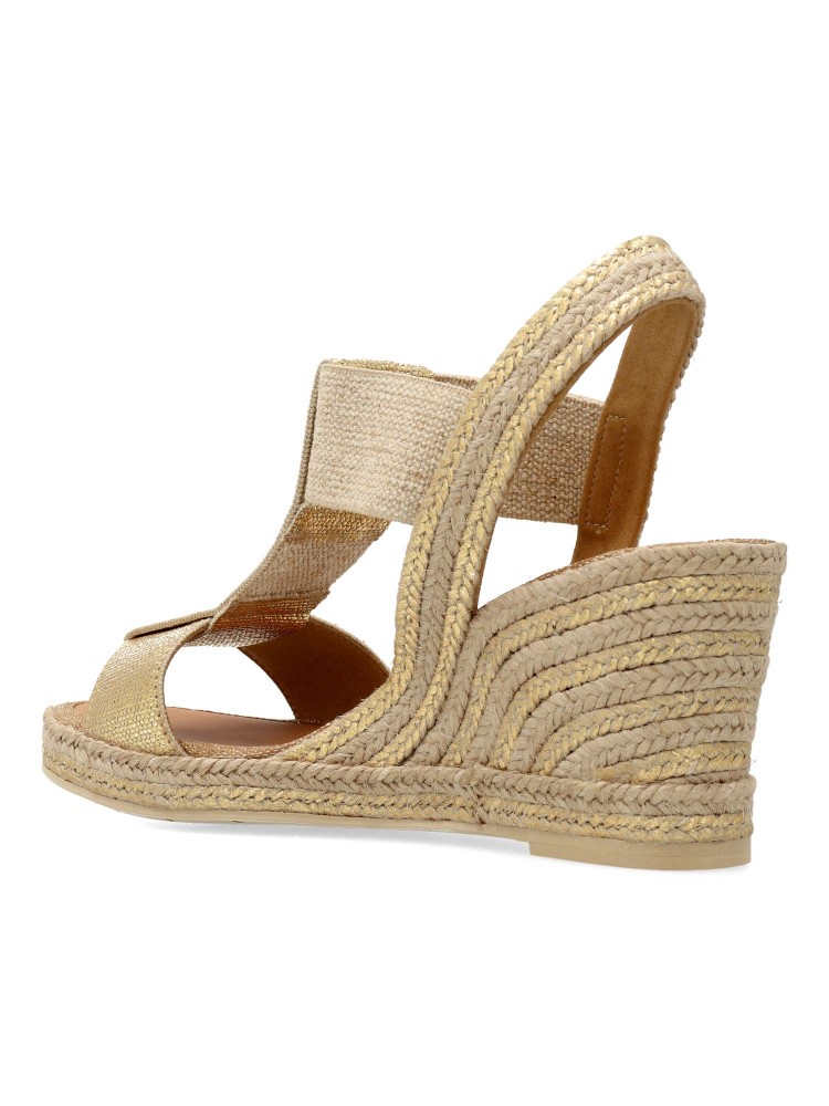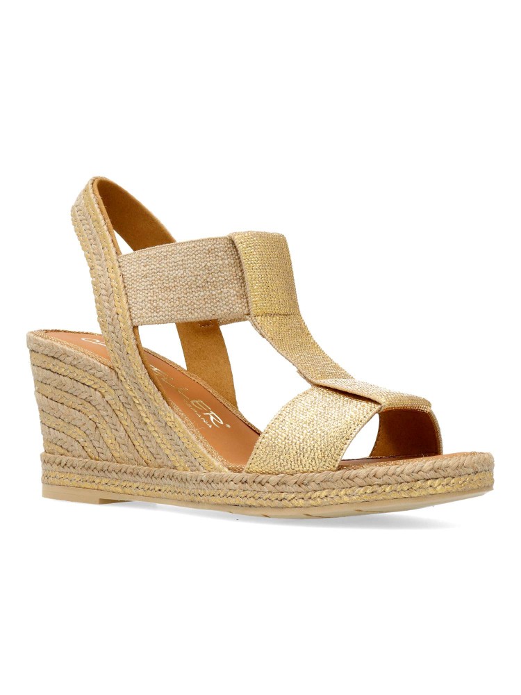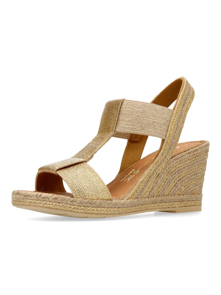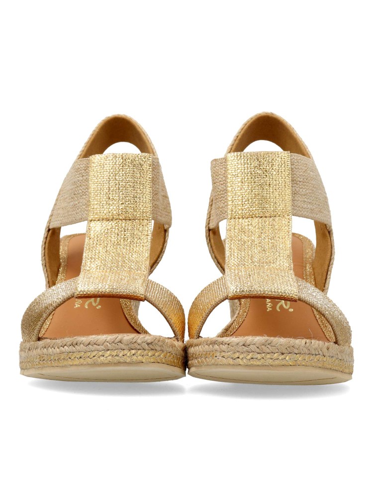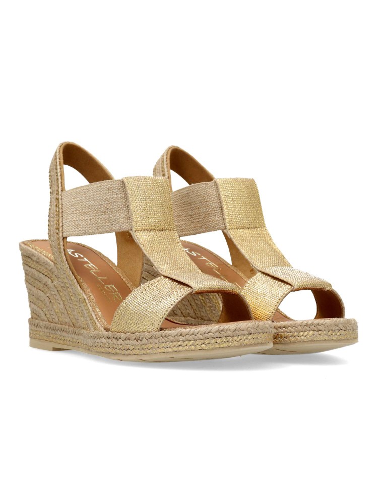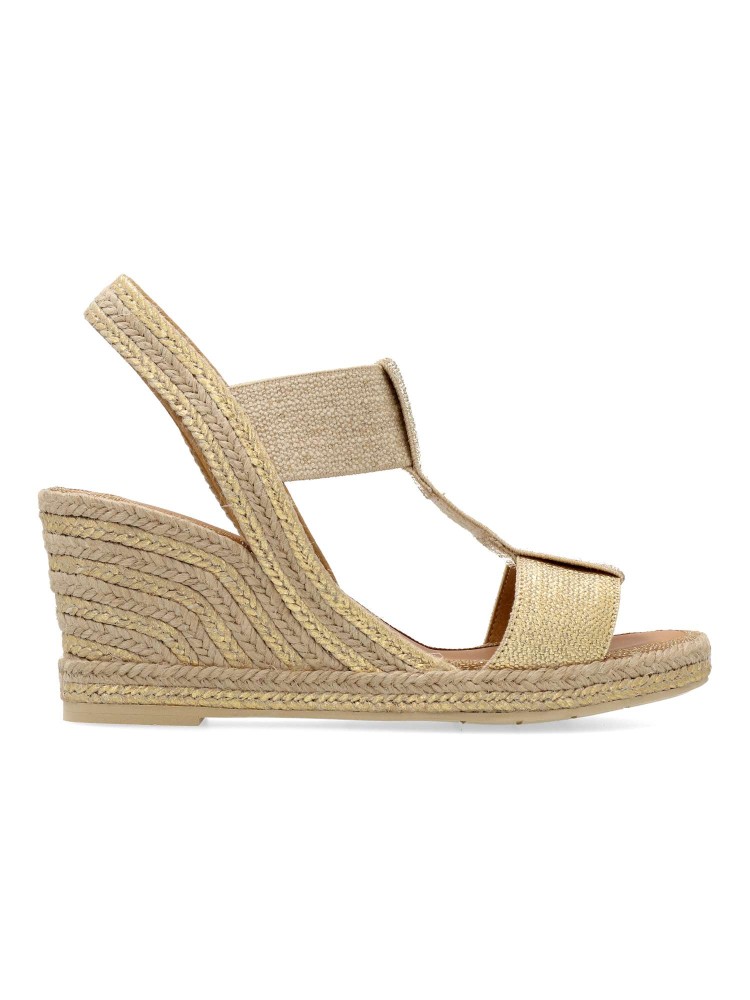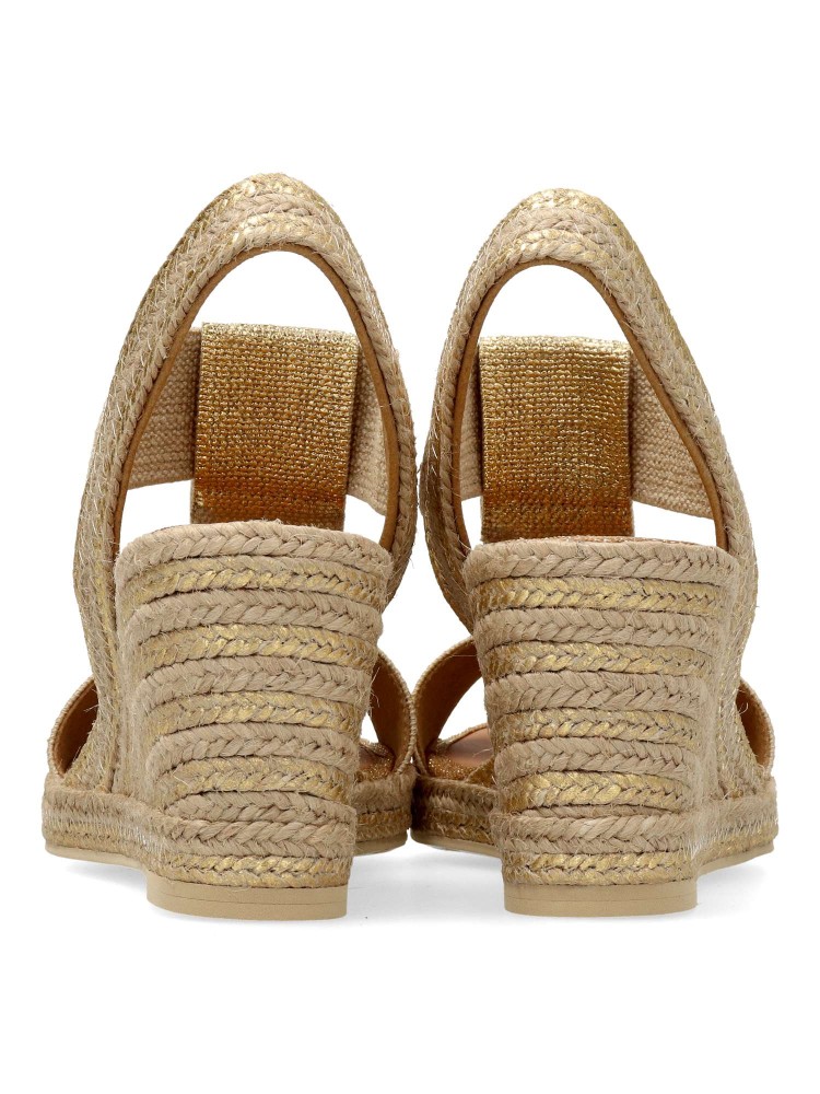 Alpargata de mujer, con tiras de elástico metalizadas. Esparteña cómoda, fabricada en textil, con suela de yute sobre goma. Planta acolchada. Color oro. Altura cuña 7,5 cm. 100% artesanal. Facil de combinar con tus looks de verano. Fabricado en España.