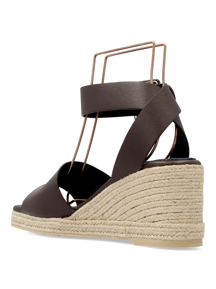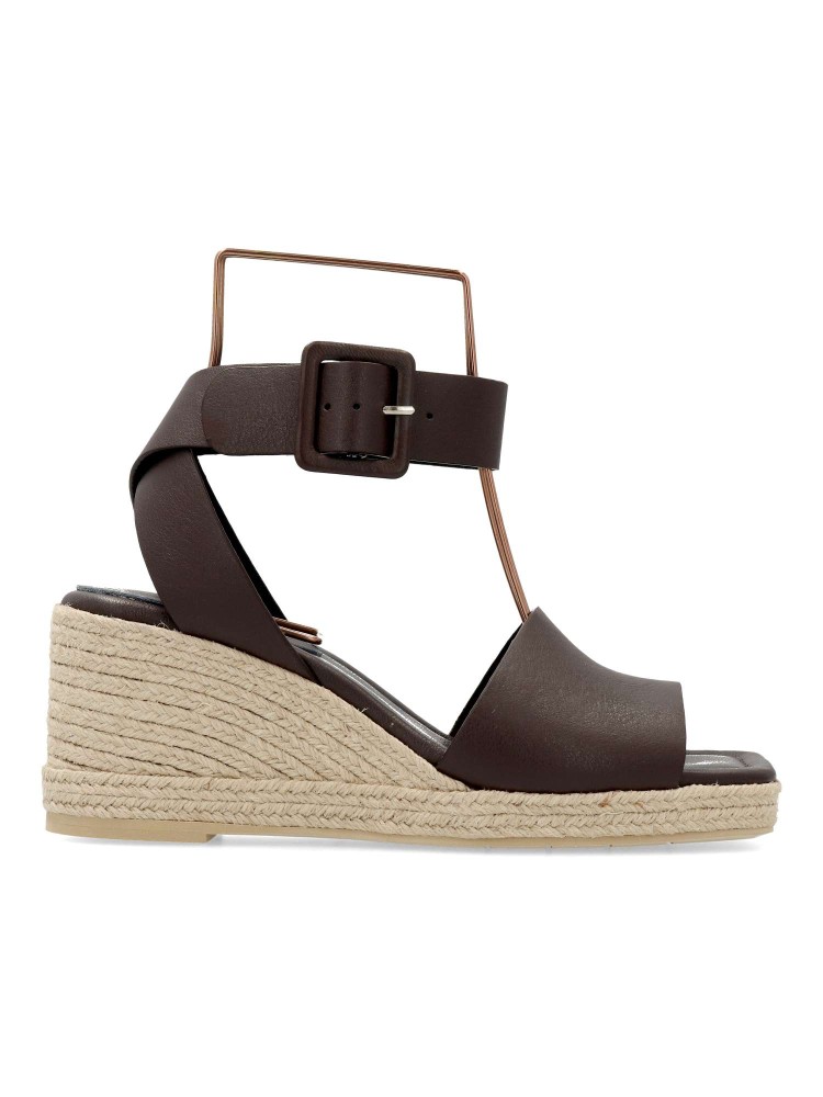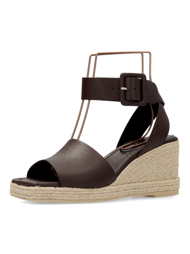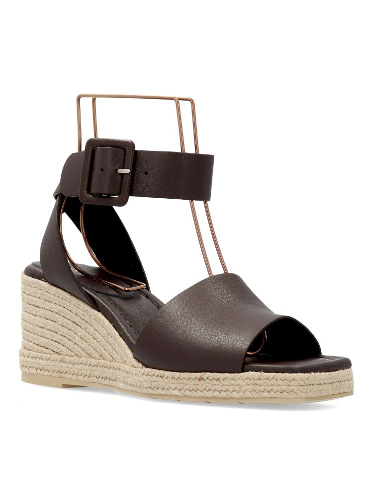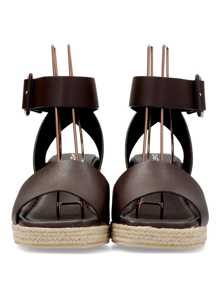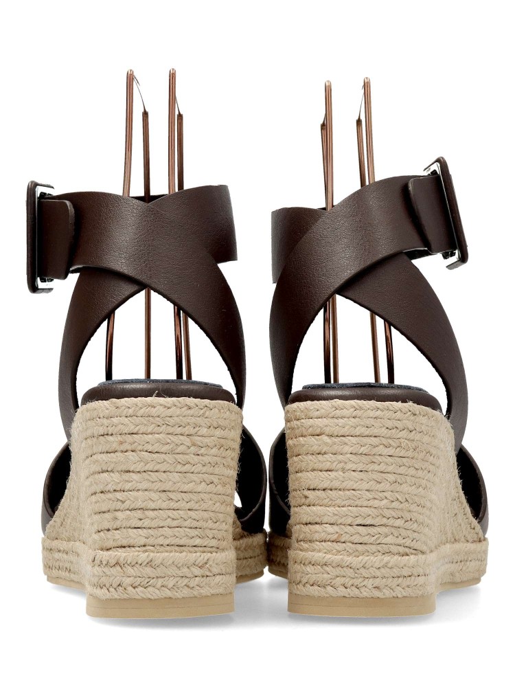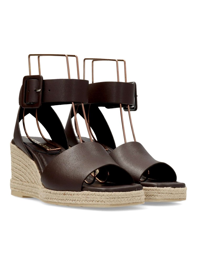 Sandalia alpargata con cierre de hebilla. Esparteña cómoda, fabricada en piel. Planta acolchada. Suela de yute sobre goma. Color chocolate. Cuña de 7 cm. 100% artesanal. Diseño y confort, fácil de combinar con tus looks de verano. Hecho en España.