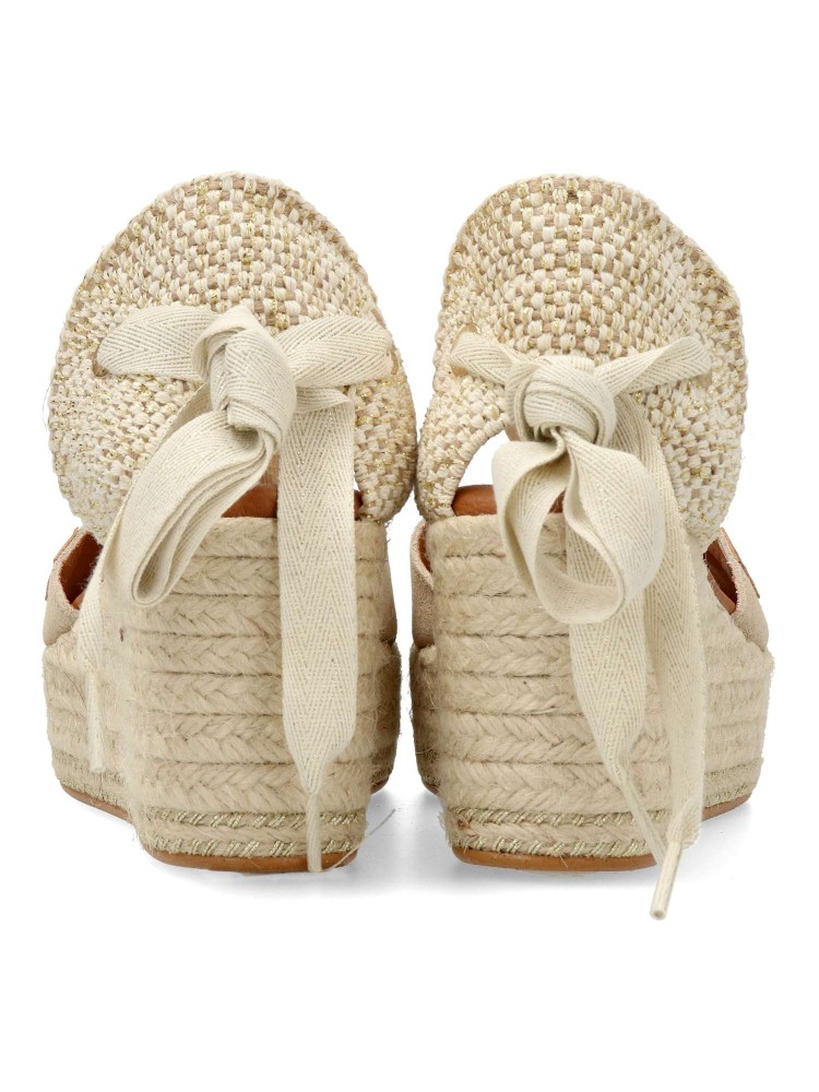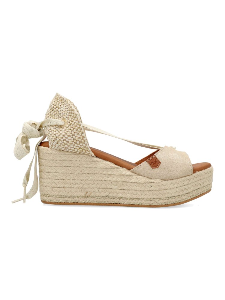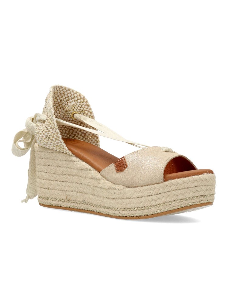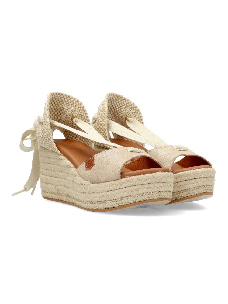 Sandalia alpargata con cuña y atada al tobillo con lazada, de material boreal brillo. Suela de esparto sobre cuero. Altura cuña 7 cm. Plataforma de 3,5 cm. Será tu mejor opción para ocasiones más especiales.