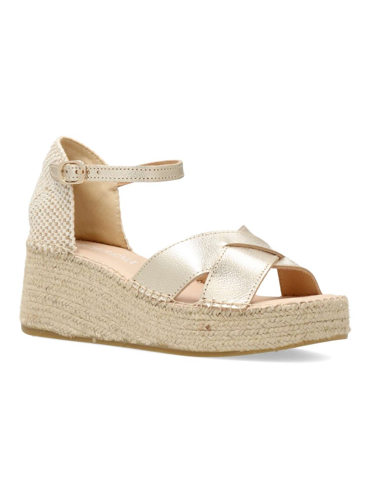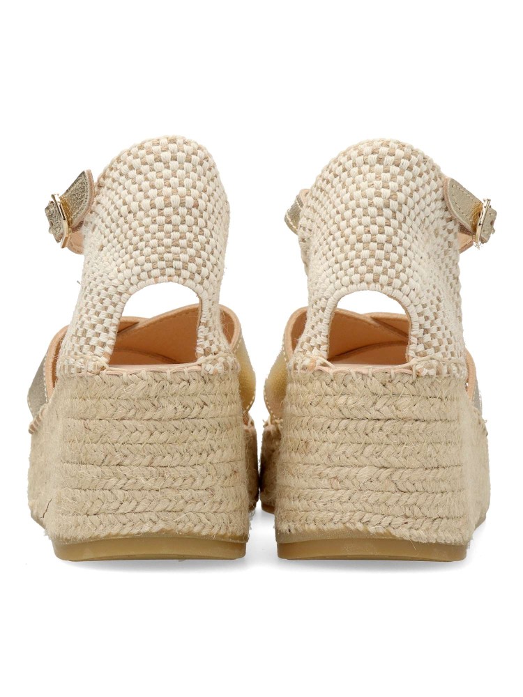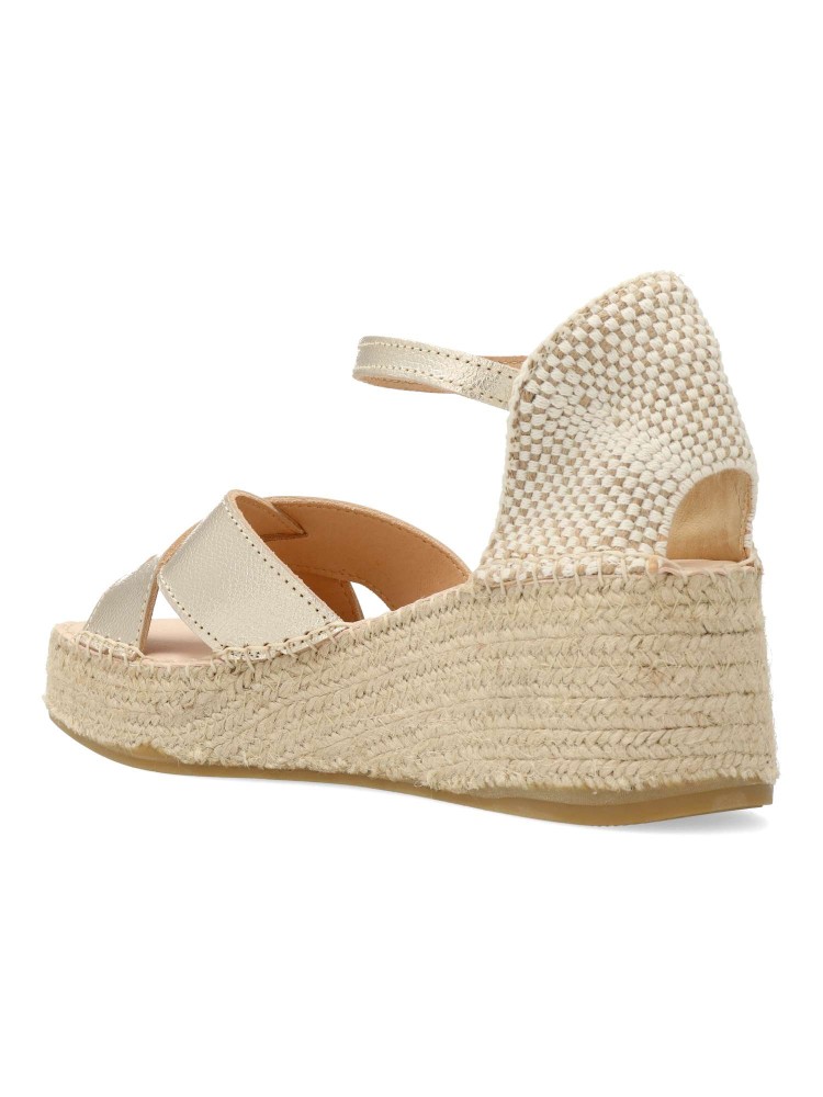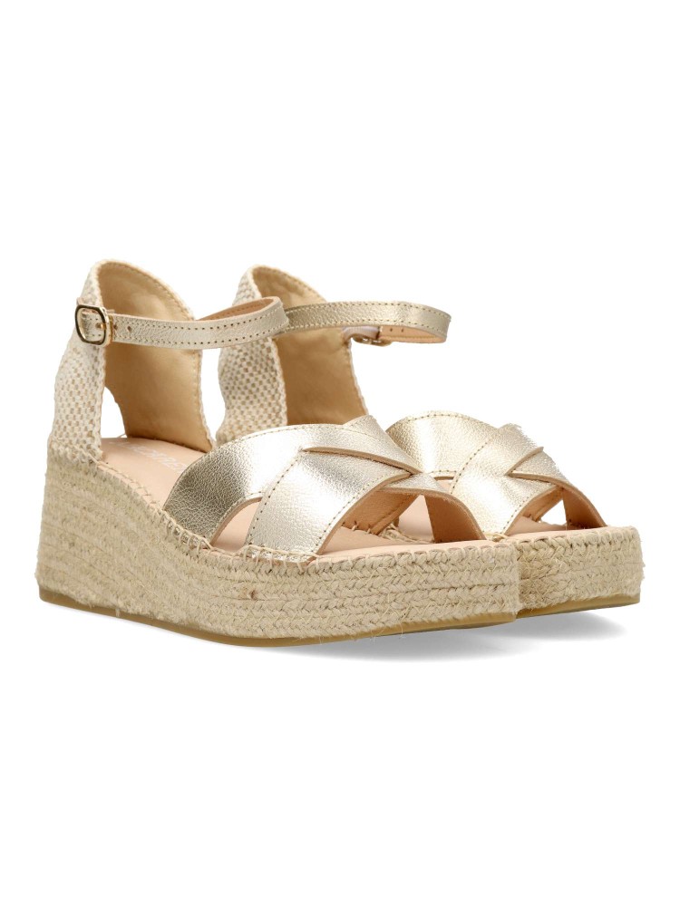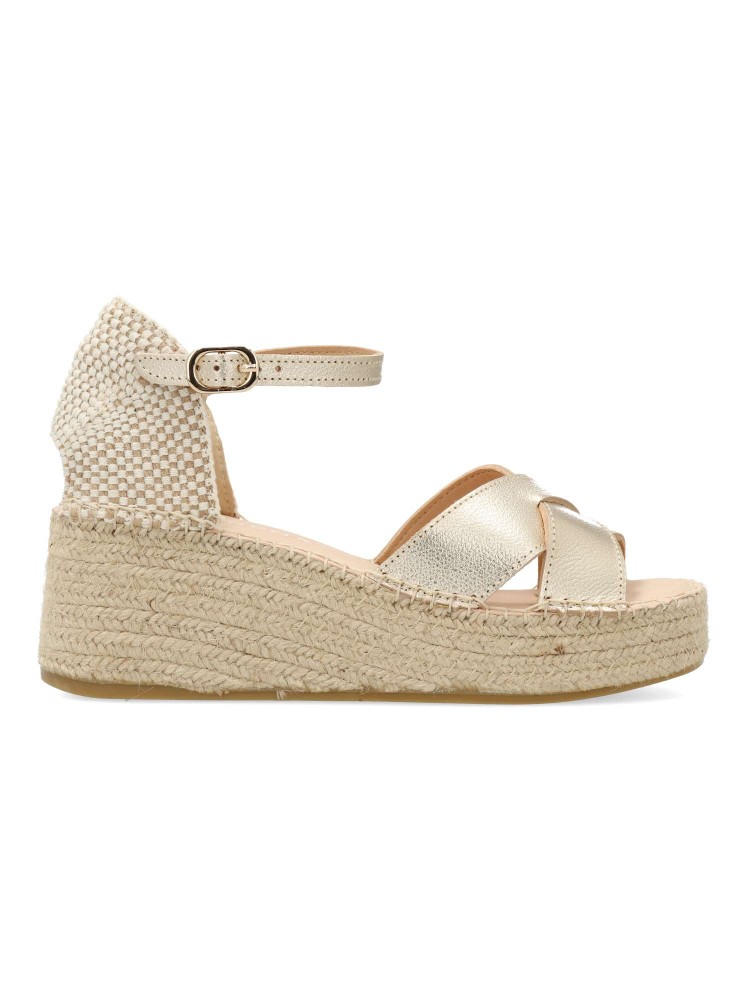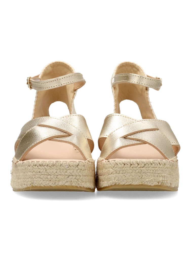 Alpargata elaborada en piel metalizada. Suela de yute natural sobre goma. Planta acolchada. Pulsera al tobillo con cierre de hebilla. Plataforma con cuña de 6 cm. de altura. Esparteñas ideales con tus outfits de verano. Hechas a mano en España.