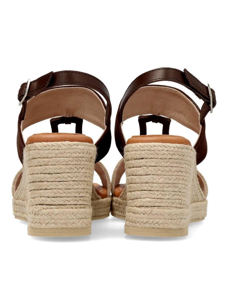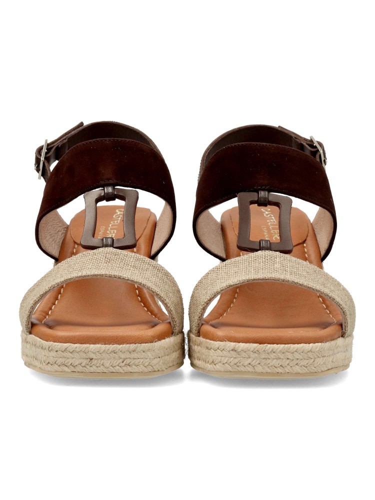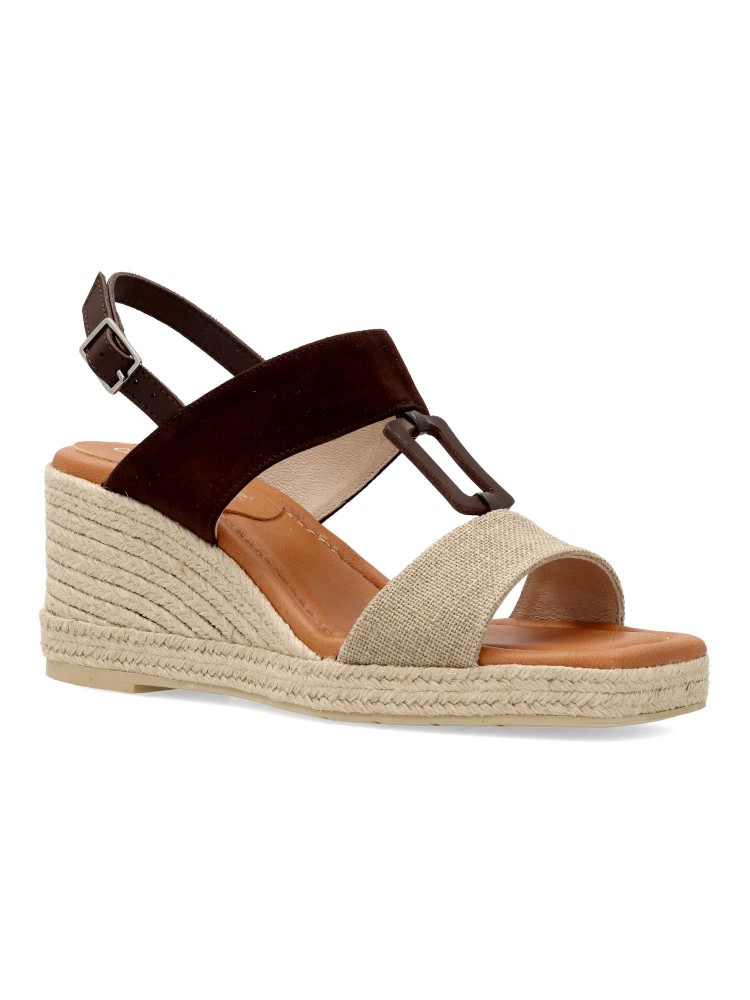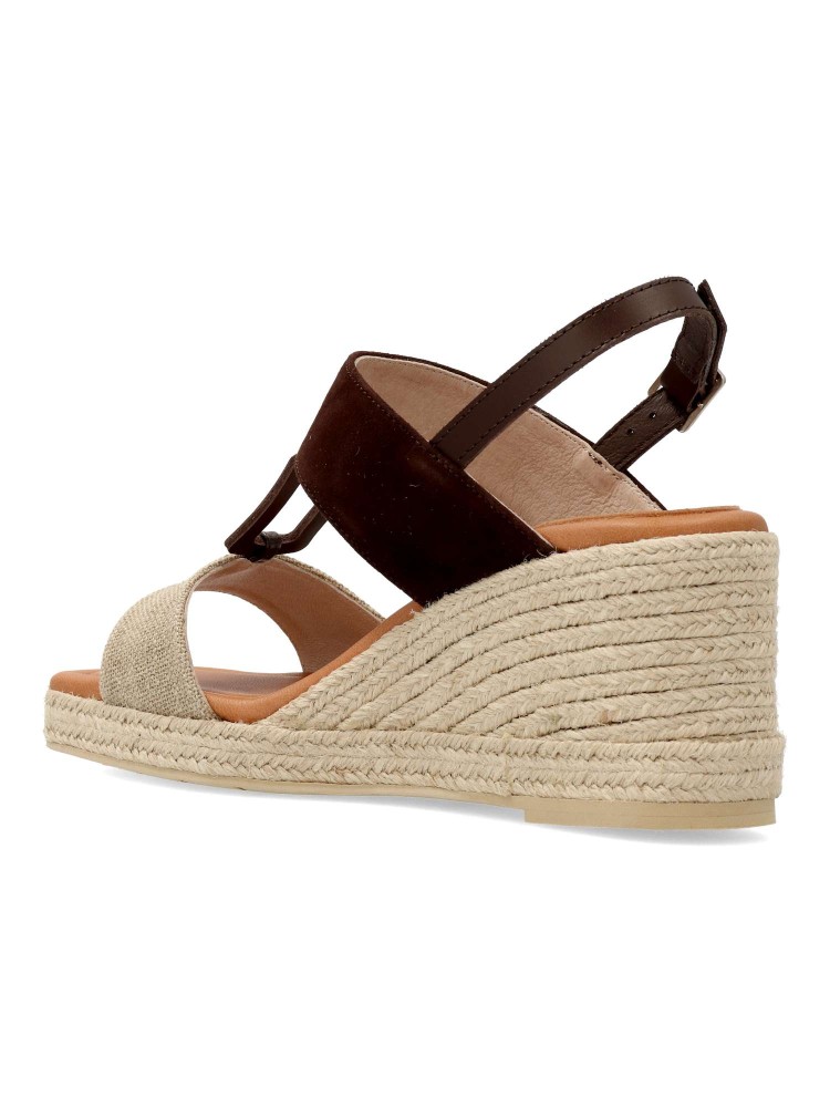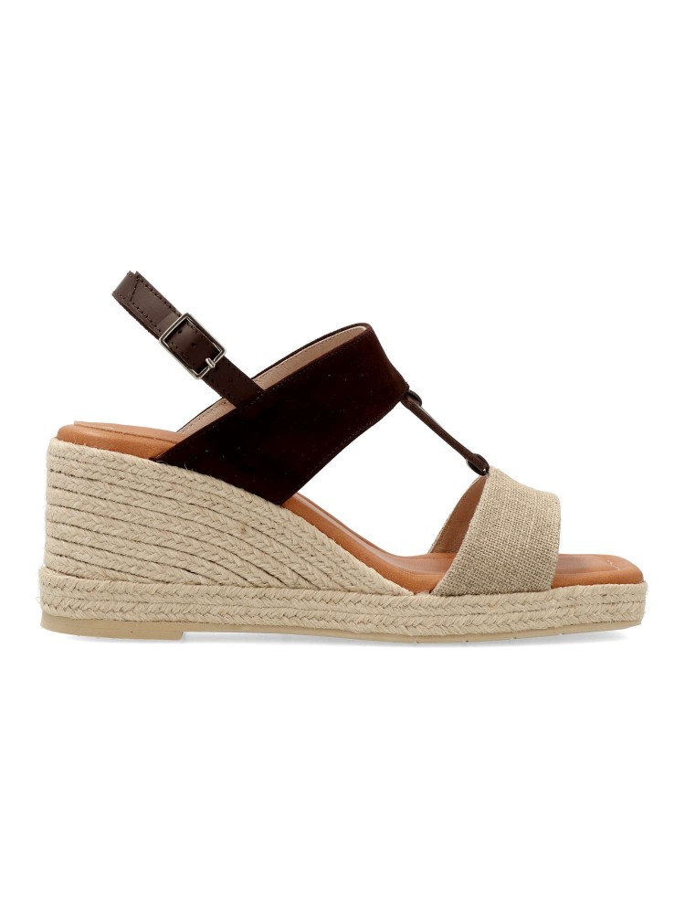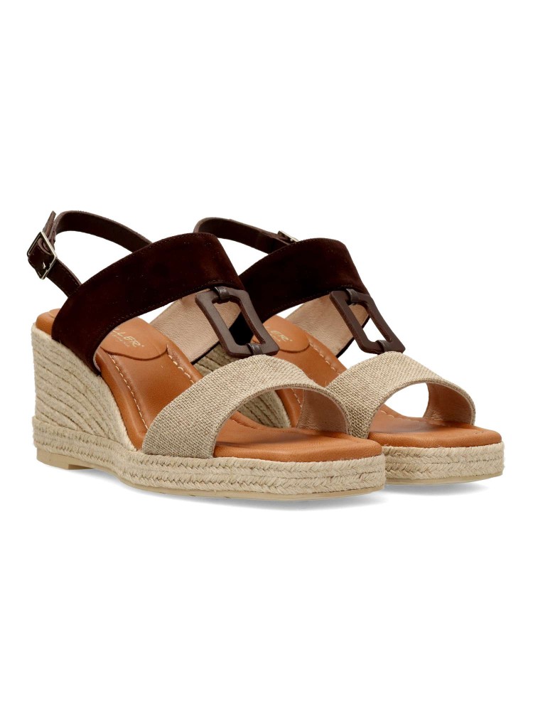 Sandalia alpargata con cierre de hebilla. Esparteña cómoda, fabricada en piel ante y lino. Planta acolchada. Suela de yute sobre goma. Color natural-chocolate. Altura cuña 7 cm. 100% artesanal. Fácil de combinar con tus outfits de verano. Hecho en España