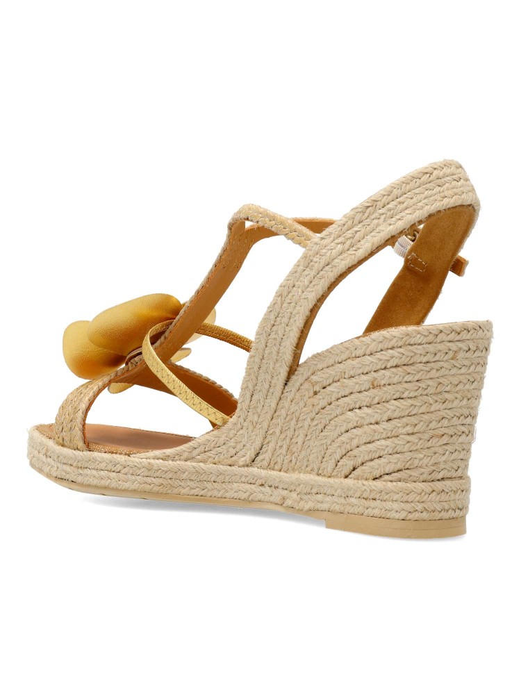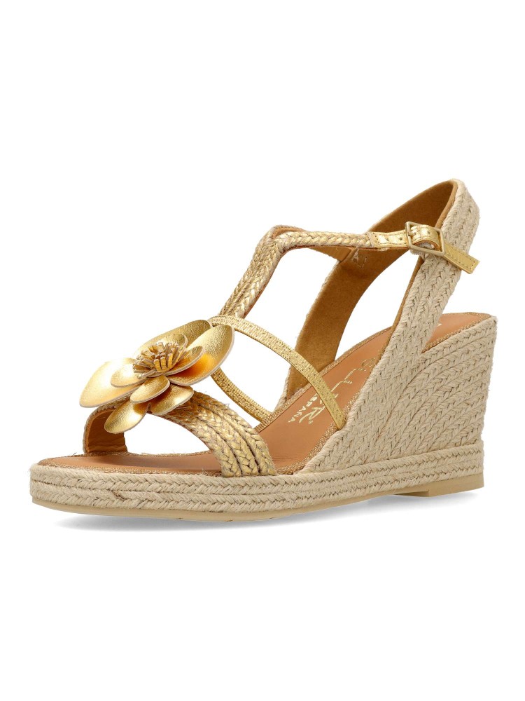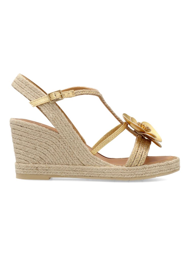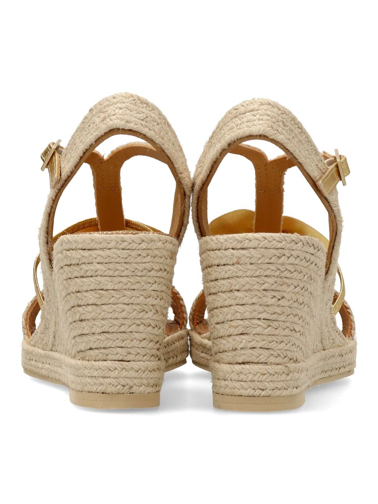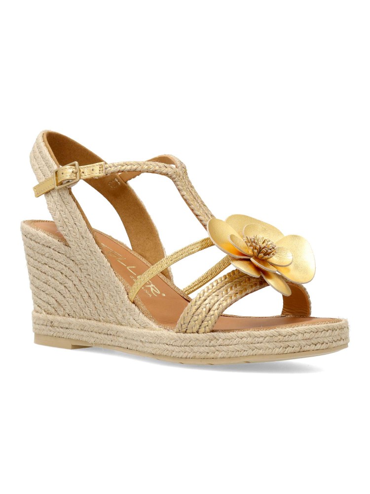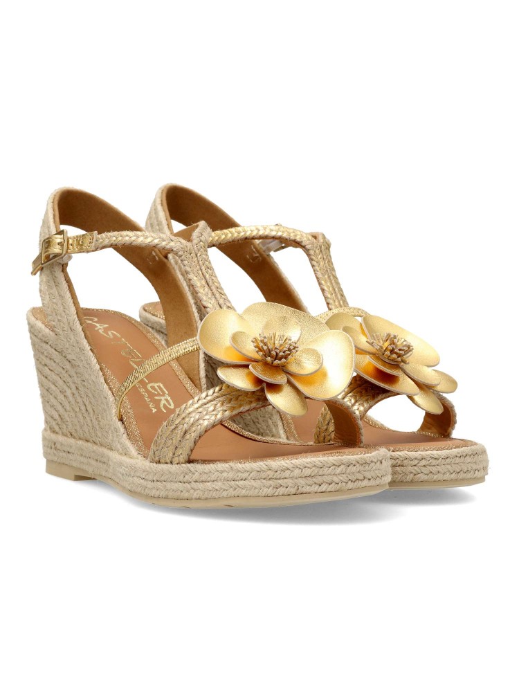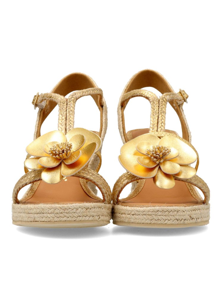 Alpargata de mujer, con tiras de curda trenzada. Esparteña cómoda, con suela de yute sobre goma. Planta acolchada. Color oro. Detalle de flor metalizada. Cuña de 7,5 cm. 100% artesanal. Fácil de combinar con tus outfits de verano. Fabricado en España.