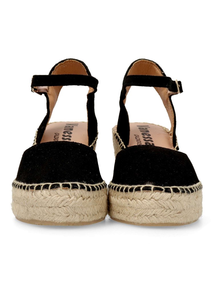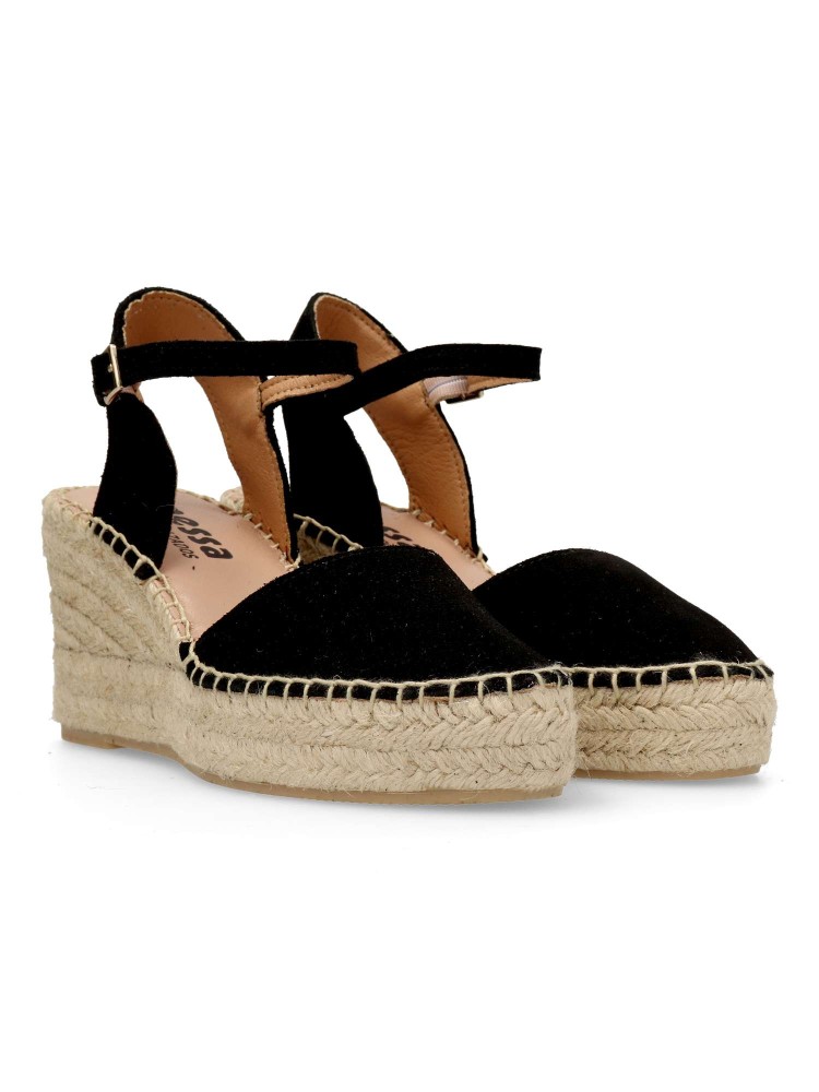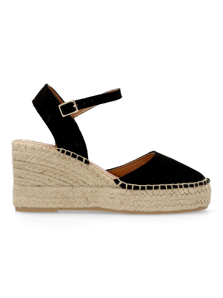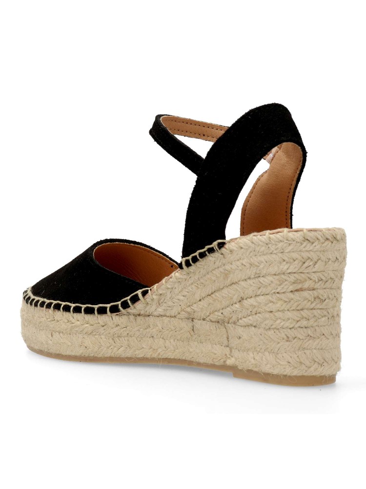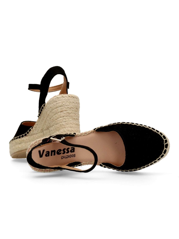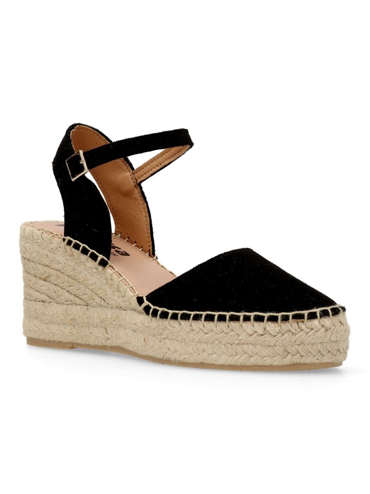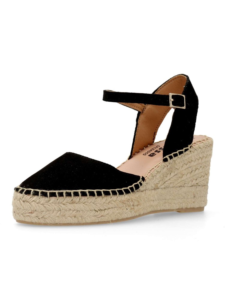 Sandalia alpargata de mujer. Valenciana cómoda fabricada en piel serraje, con suela de yute sobre goma. Color negro. Cierre de hebilla al tobillo. Cuña de 8 cm. Ideal tanto en ferias y eventos, como para dar confort a tus looks de verano.