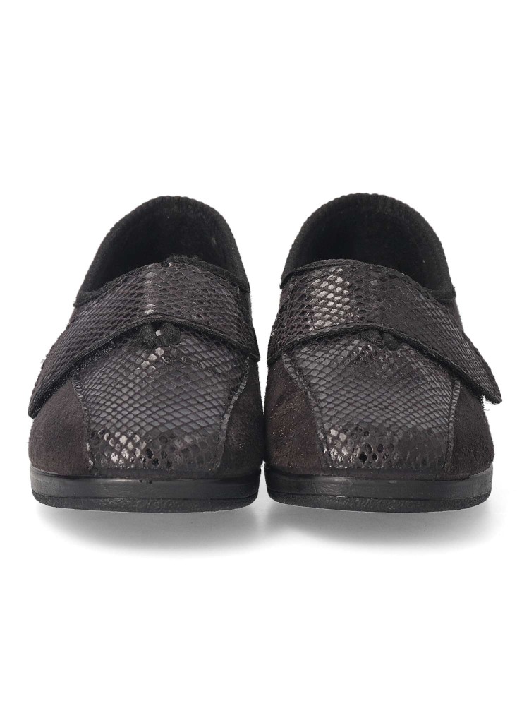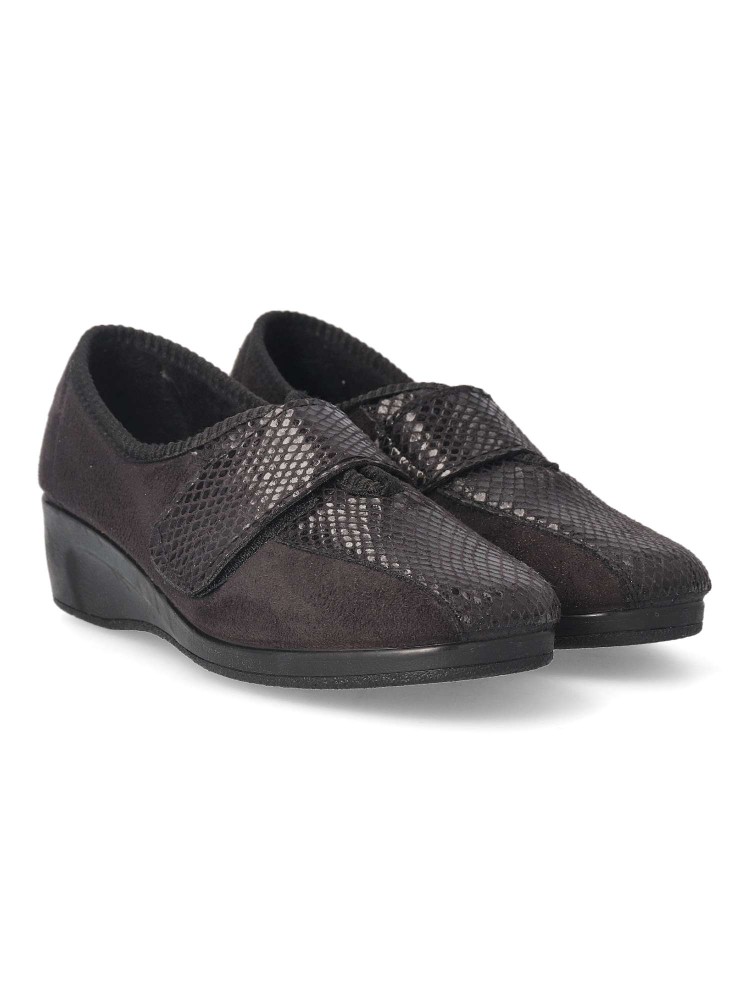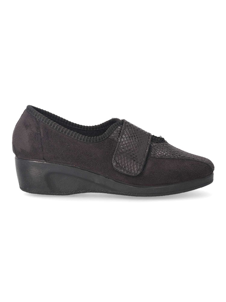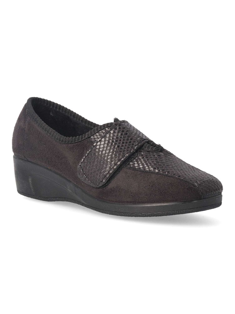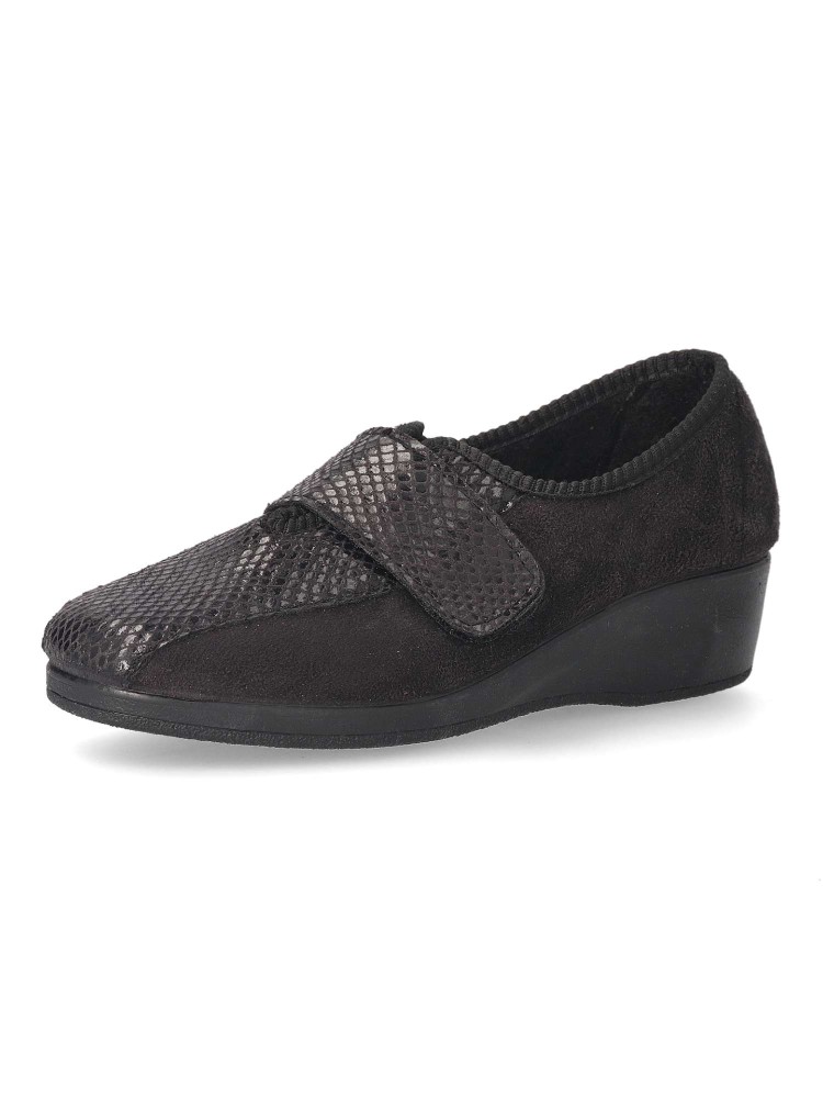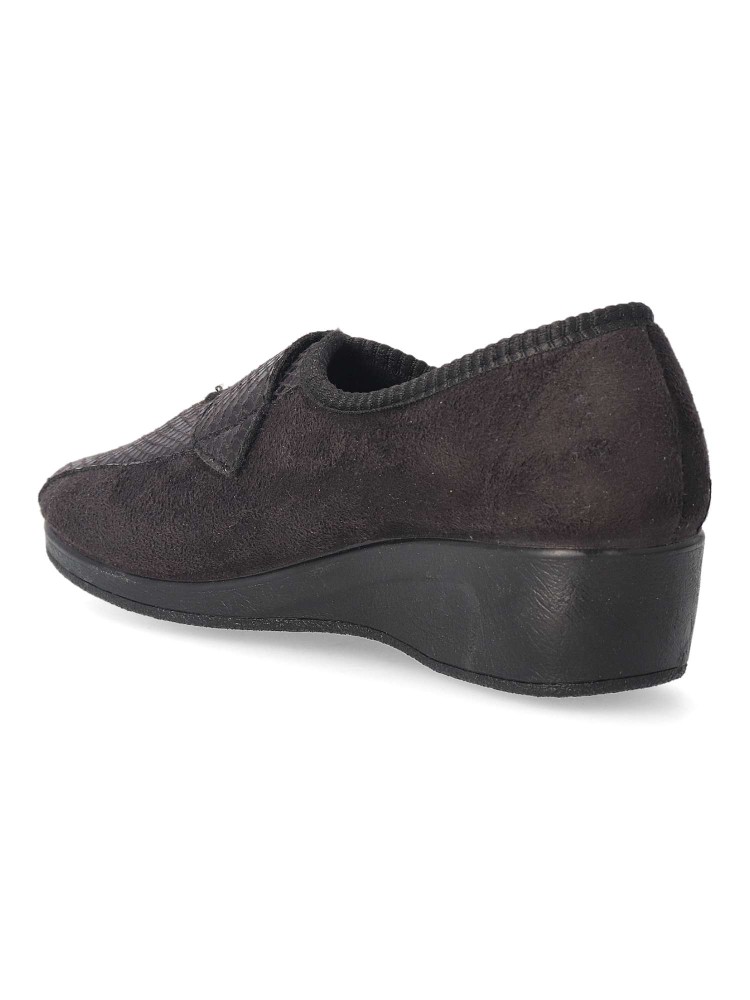 Zapatilla de casa cerrada para mujer. Disponible en color negro. Fabricada en textil, con suela de caucho flexible y antideslizante. Cierre de velcro. Modelo cómodo y abrigado para los días más fríos. Altura cuña 4 cm. Hecho en España.