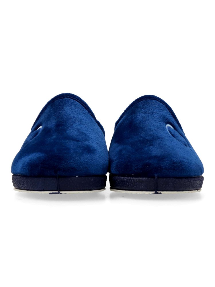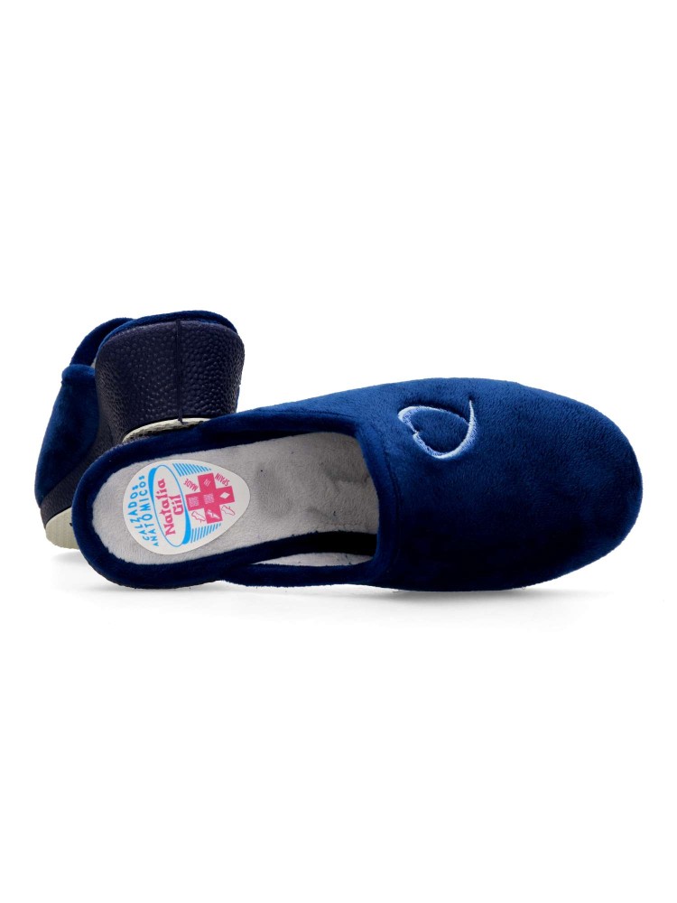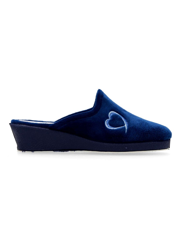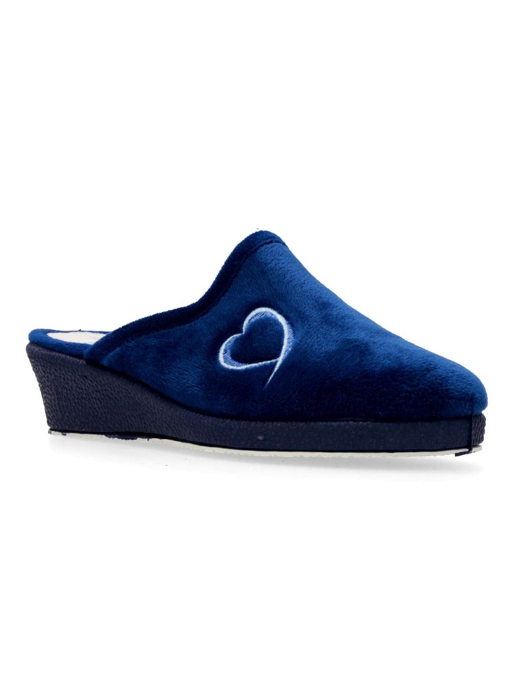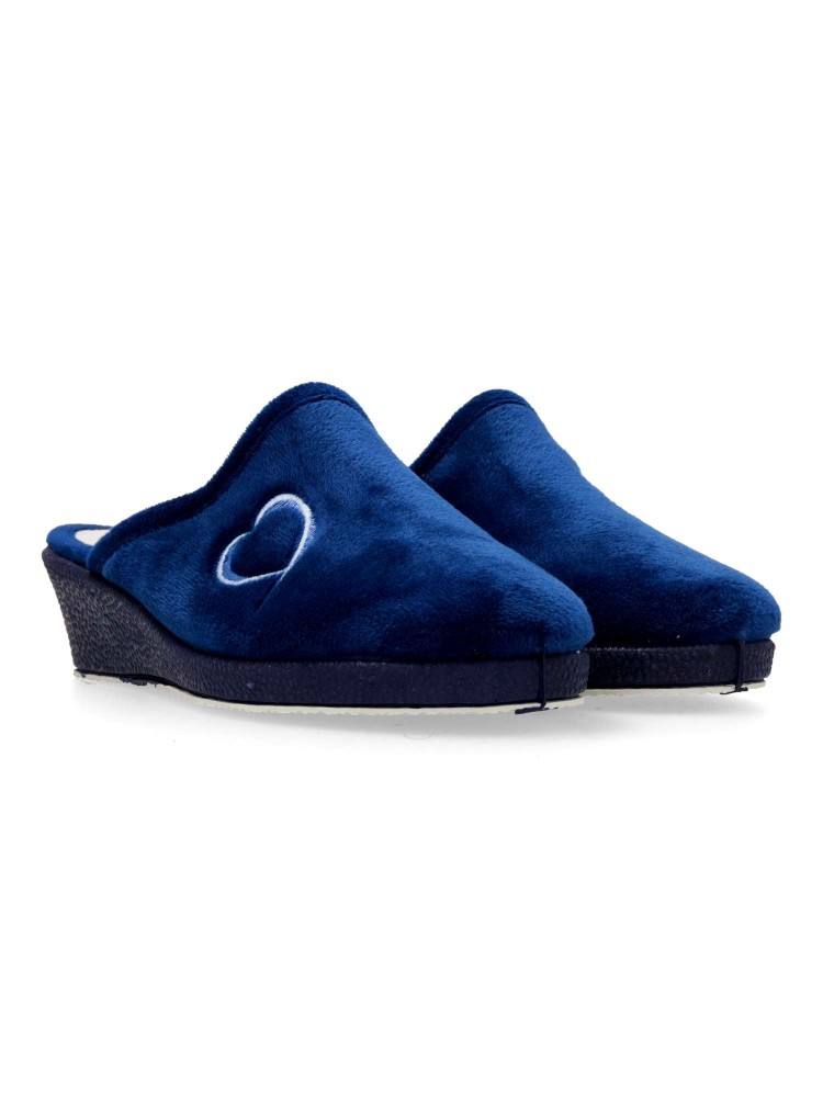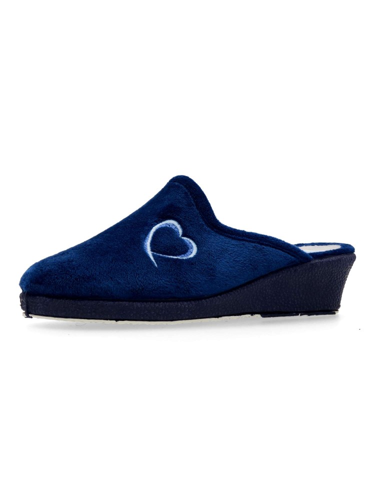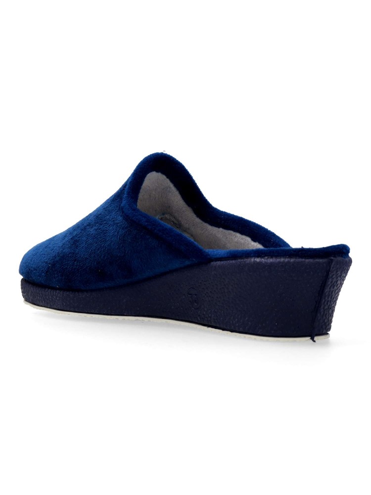 Zapatilla de casa para mujer. Fabricada en textil suave, con suela de caucho antideslizante, flexible y ligera. Plantilla acolchada. Altura cuña 4 cm. Color marino. Zapatilla que te ofrece confort y te abriga en los días más fríos. Hecho en España.