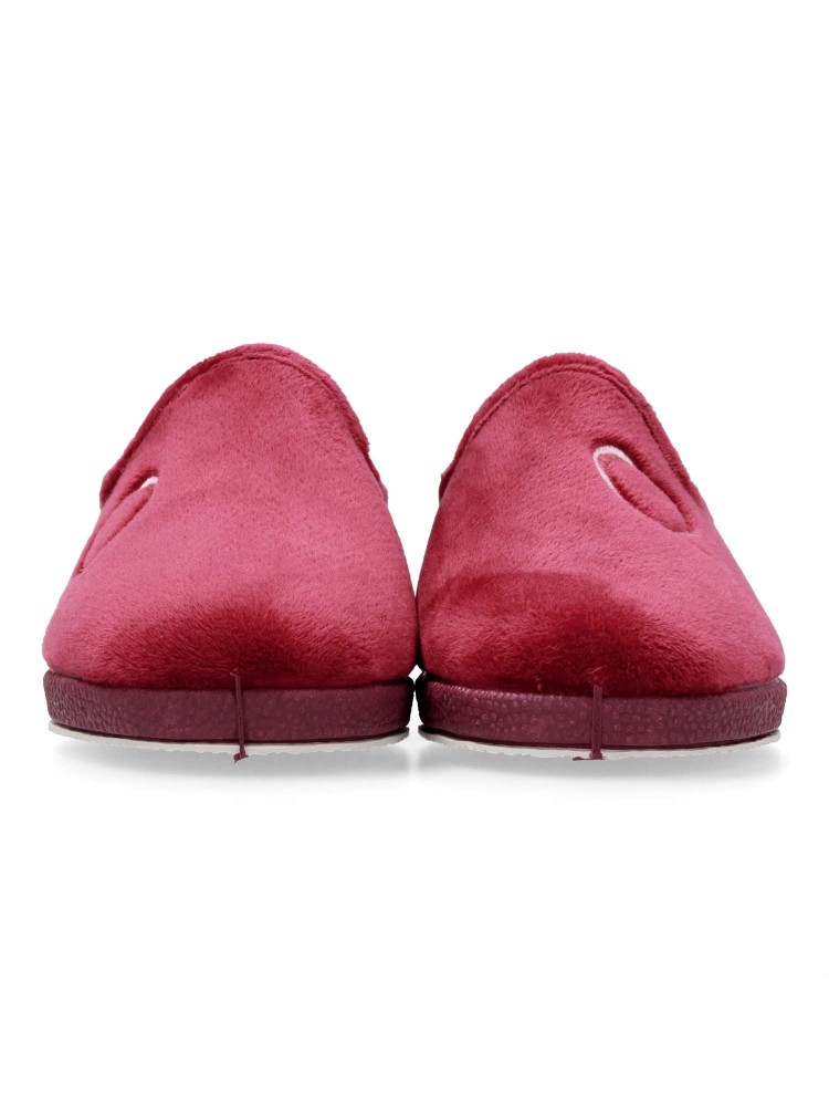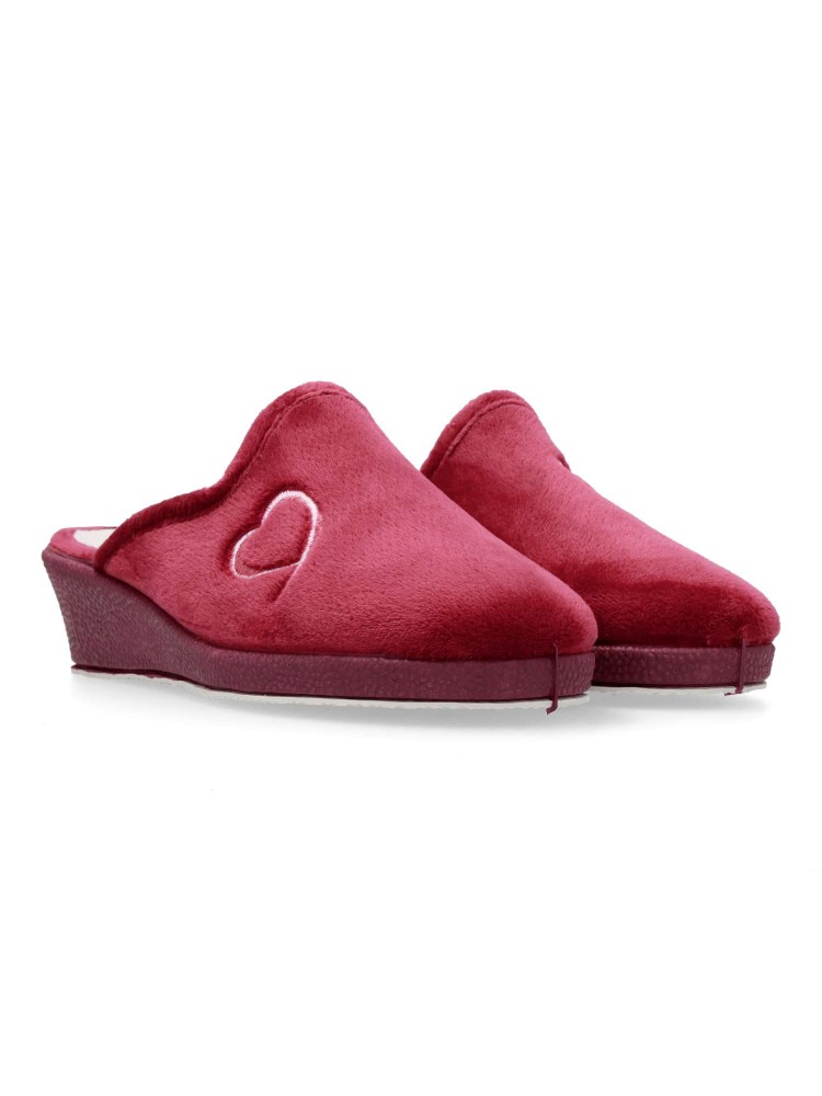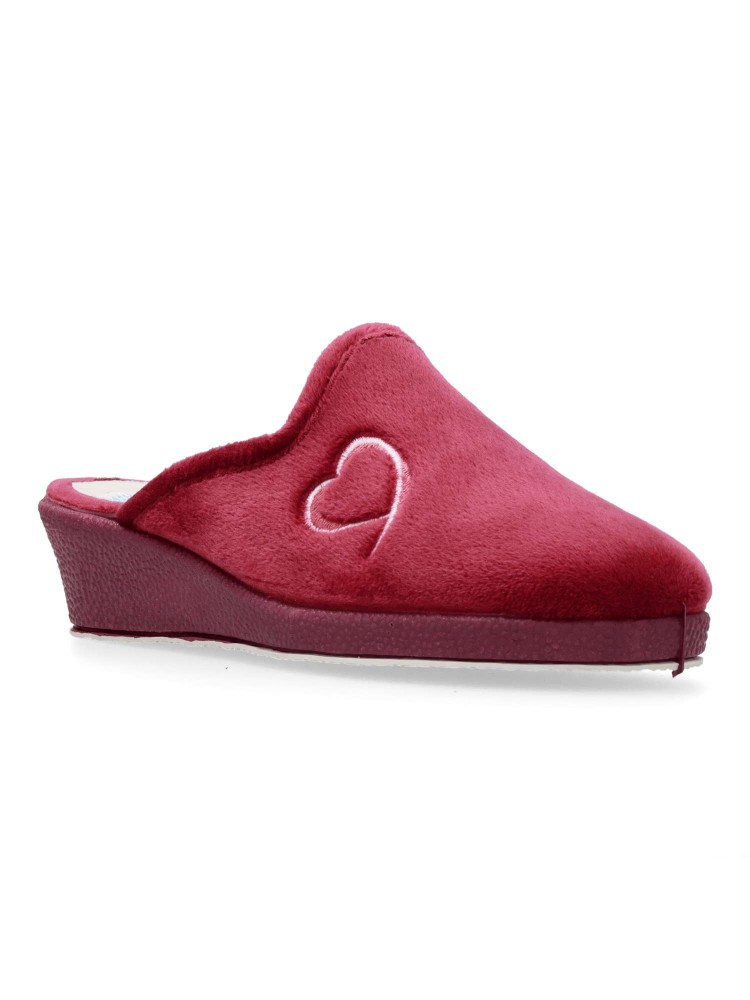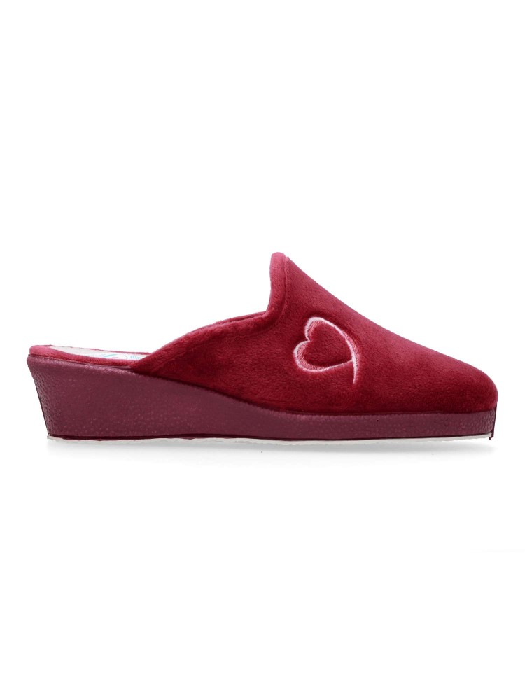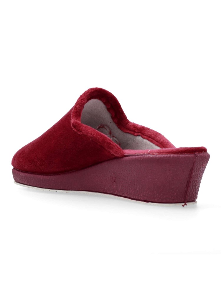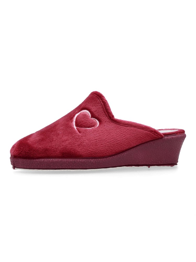 Zapatilla de casa para mujer. Fabricada en textil suave, con suela de caucho antideslizante, flexible y ligera. Plantilla acolchada. Altura cuña 4 cm. Color burdeos. Zapatilla que te ofrece confort y te abriga en los días más fríos. Hecho en España.