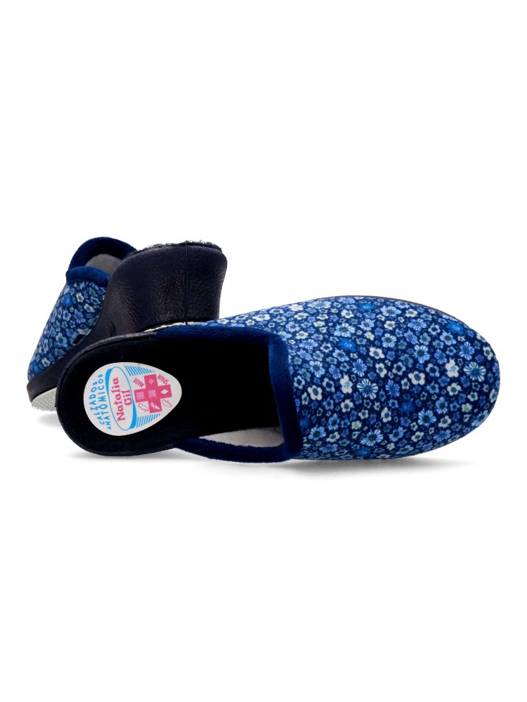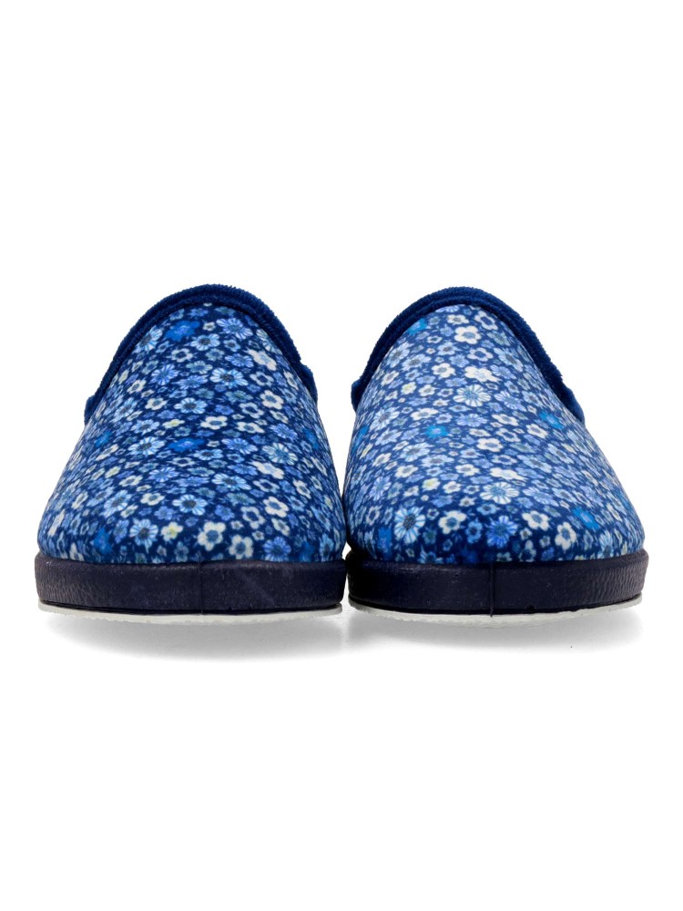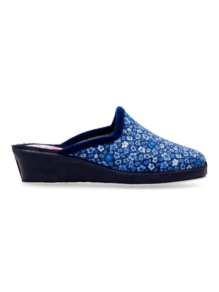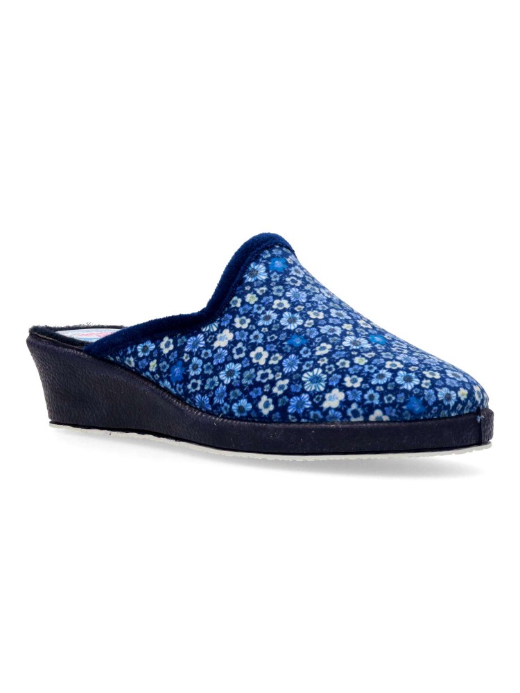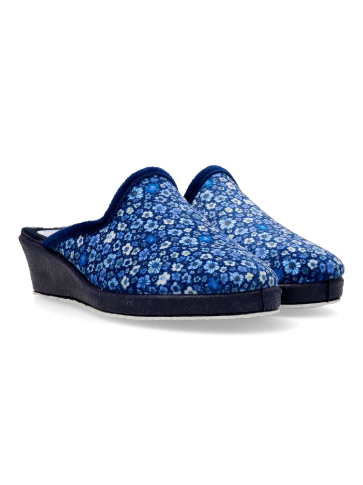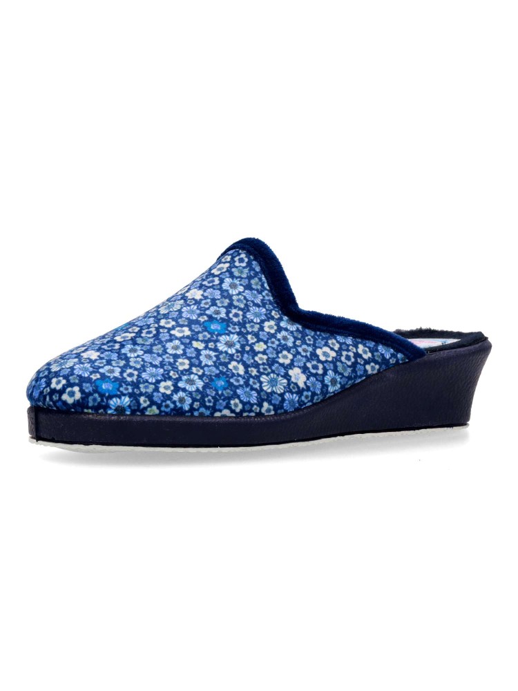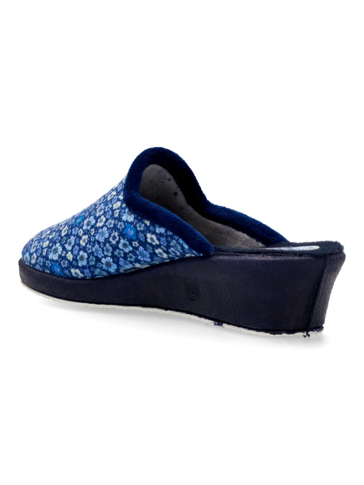 Zapatilla de casa para mujer. Fabricada en textil suave, con suela de caucho antideslizante, flexible y ligera. Plantilla acolchada. Altura cuña 4 cm. Color marino. Zapatilla que te ofrece confort y te abriga en los días más fríos. Hecho en España.