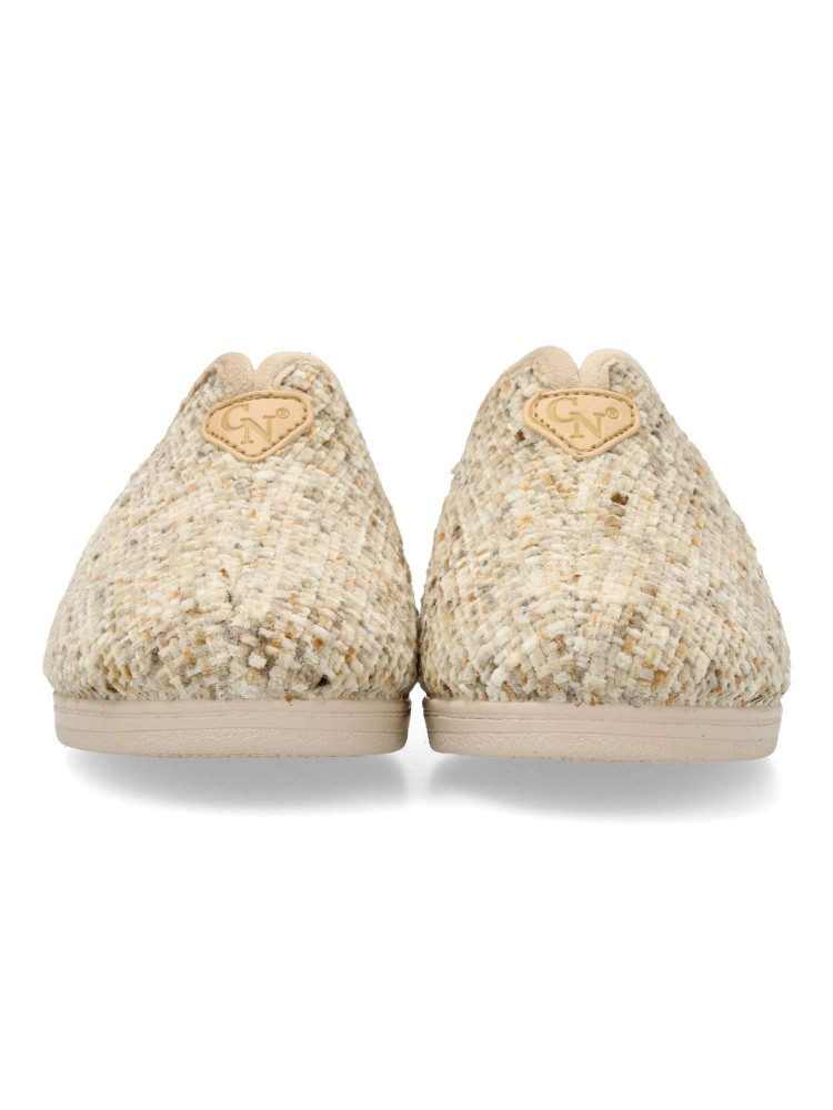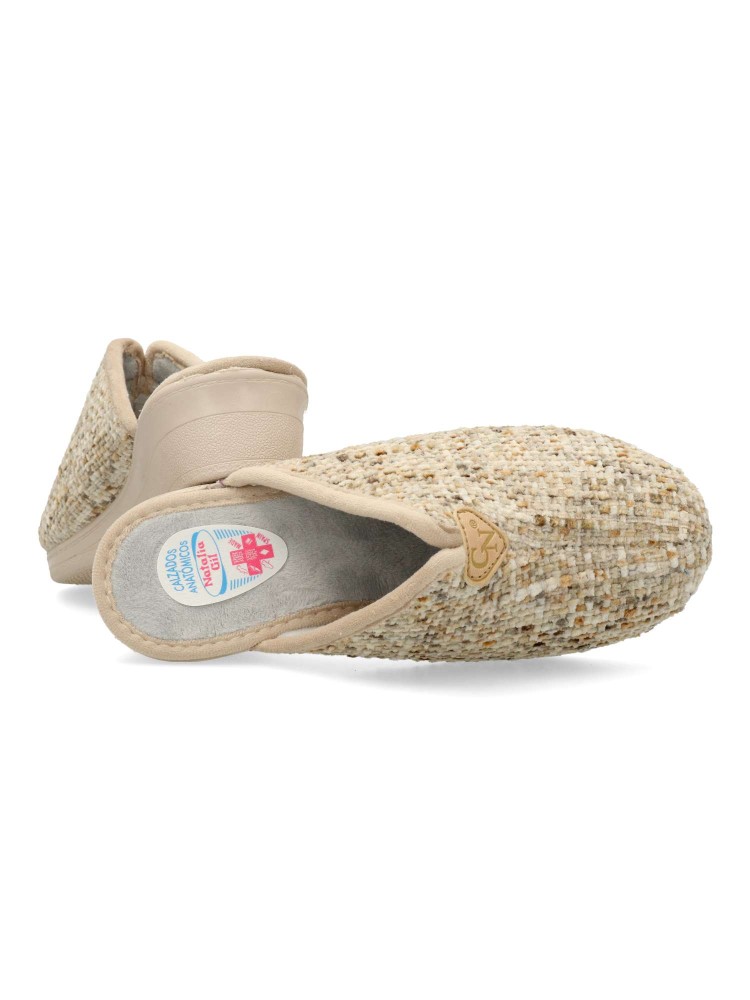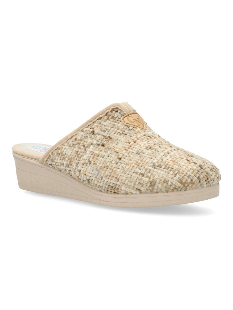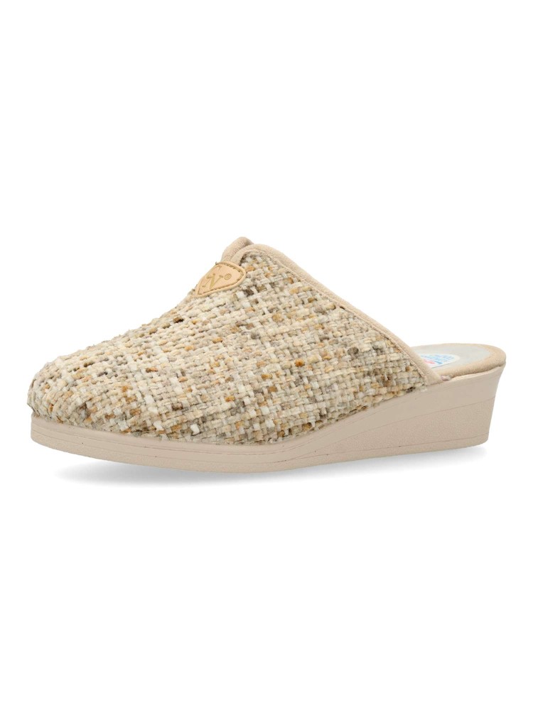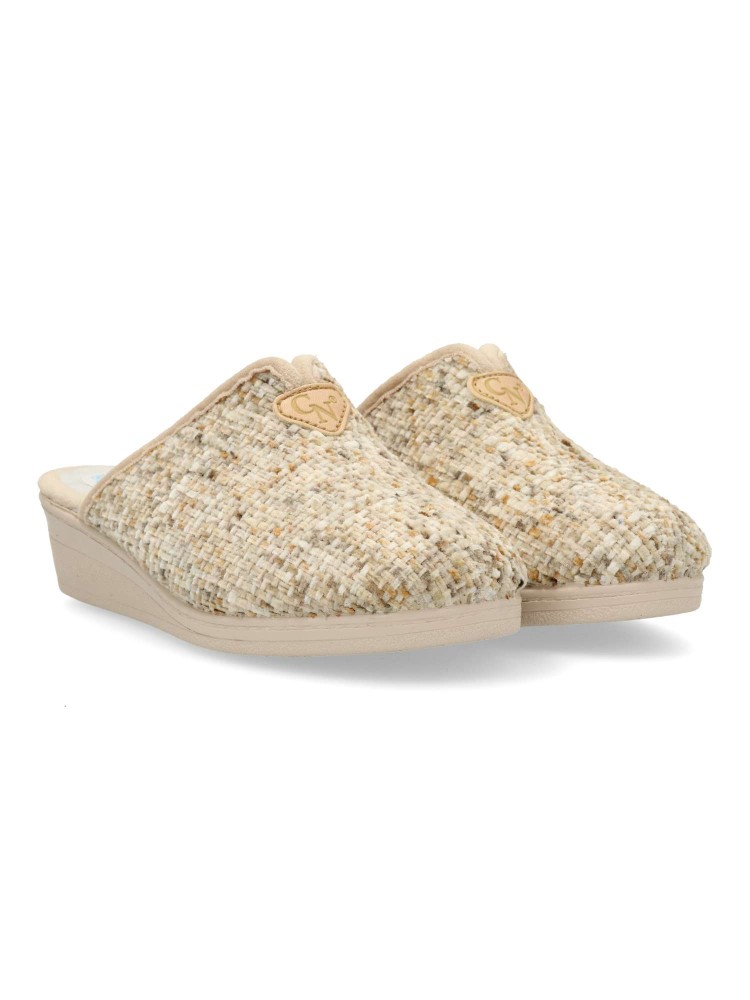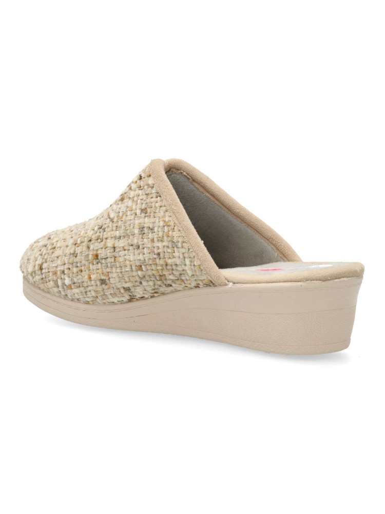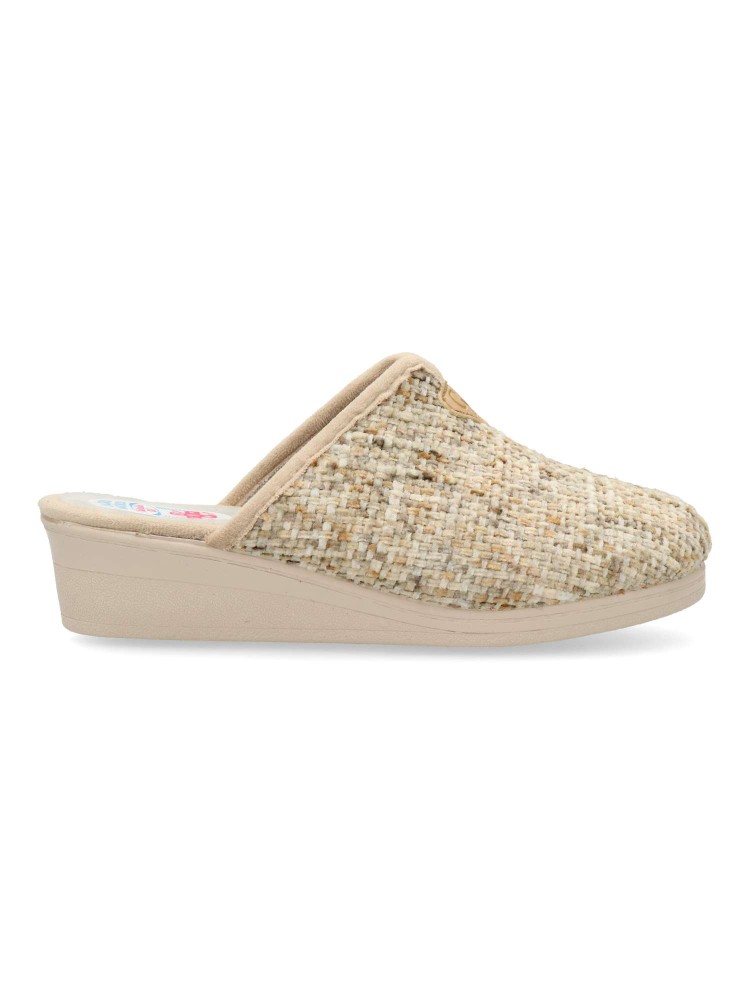 Zapatilla de casa para mujer. Fabricada en textil aterciopelado, con suela de caucho antideslizante, flexible y ligera. Plantilla acolchada. Altura cuña 4 cm. Color beige. Zapatilla que te ofrece confort y te abriga en los días más fríos. Hecho en España.