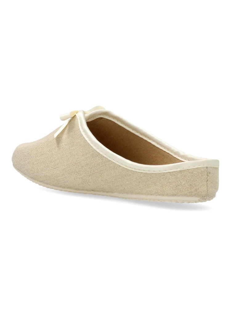 Zapatilla de casa para mujer. Color oro con detalle de lazo decorativo. Suela de goma flexible y antideslizante. Modelo cómodo fabricado en textil acolchado. Plantilla acolchada. Altura cuña 2,5 cm. Máximo confort en tu descanso diario. Hecho en España.