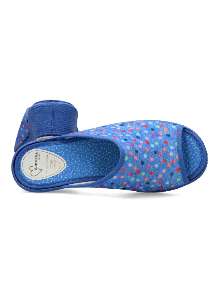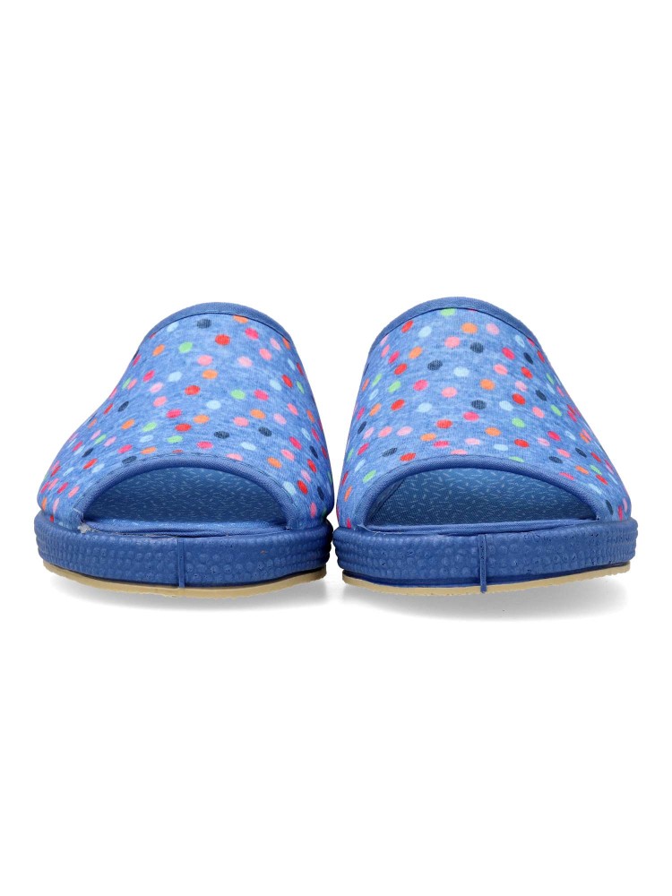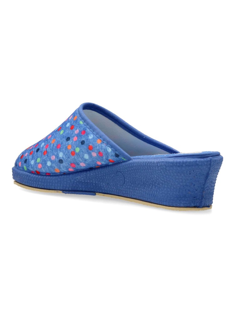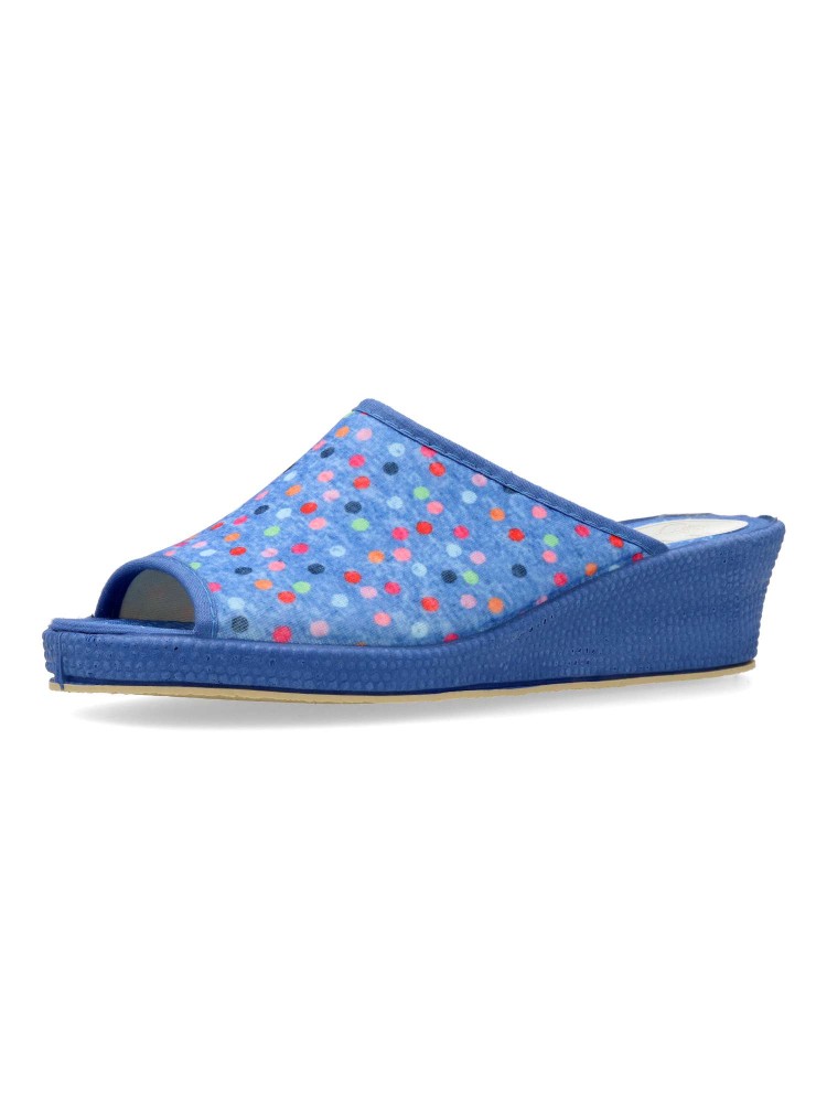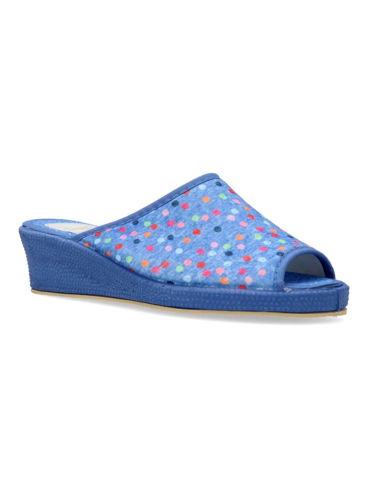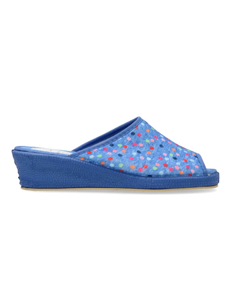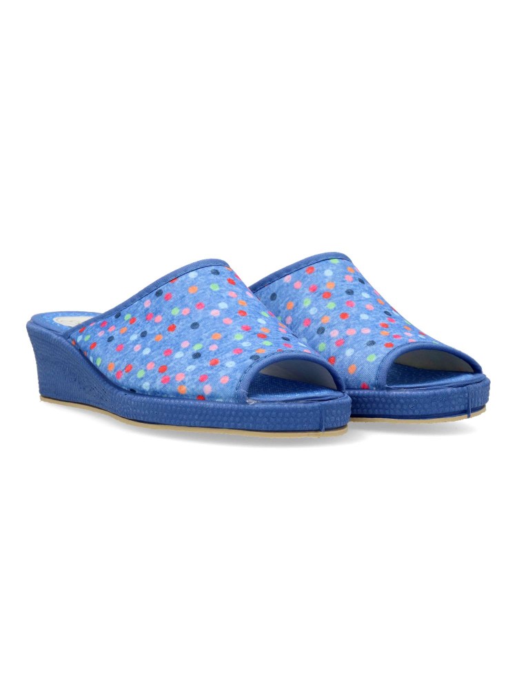 Zapatilla de casa para mujer. Disponible en color aguamar. Suela de goma flexible. Modelo cómodo fabricado en material textil acolchado, con estampado de puntos multicolor. Puntera descubierta pinki. Altura cuña 4 cm. Hecho en España.