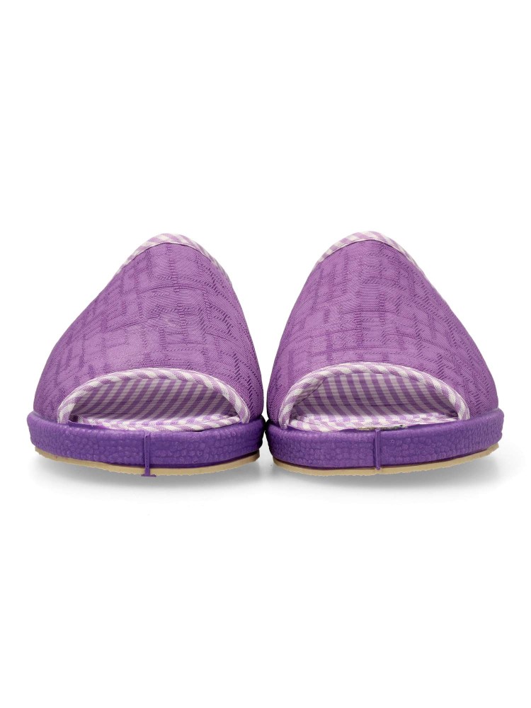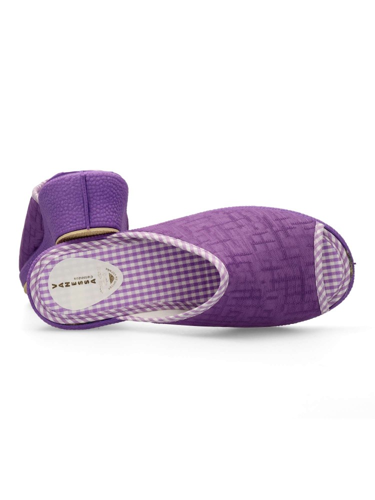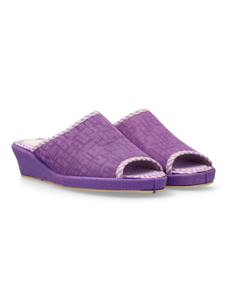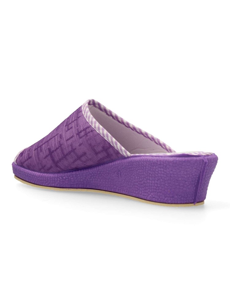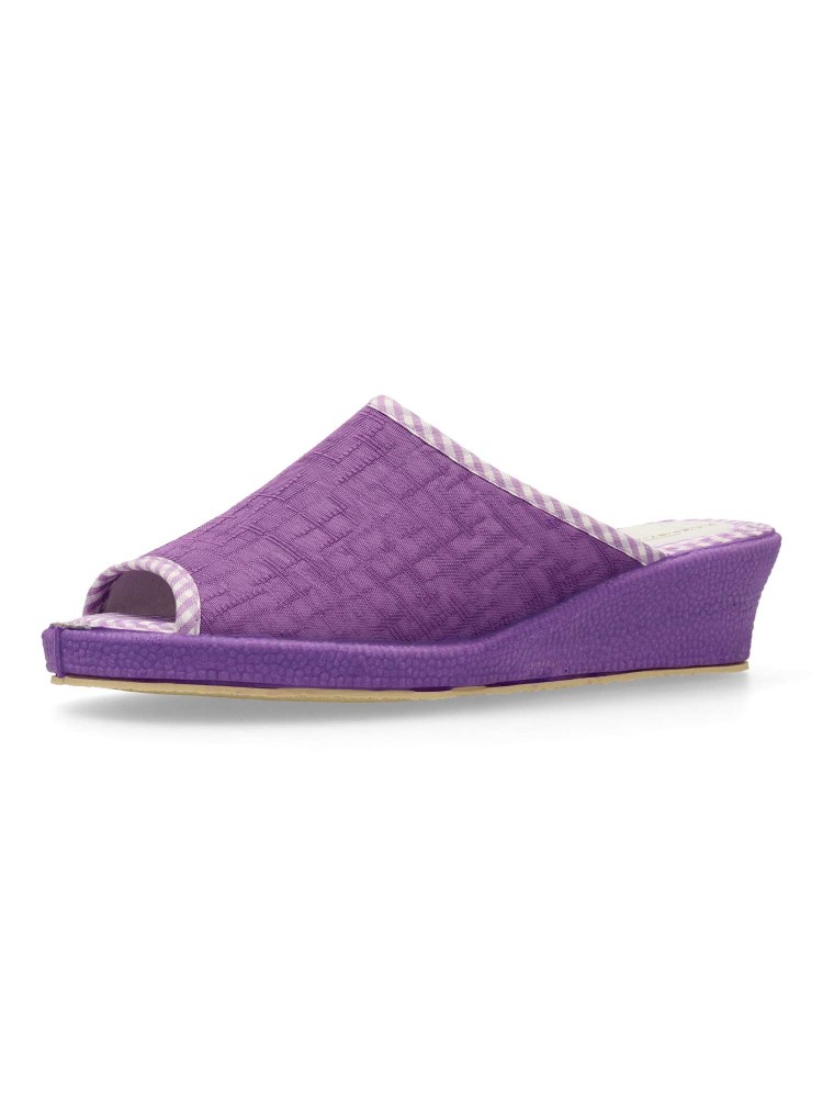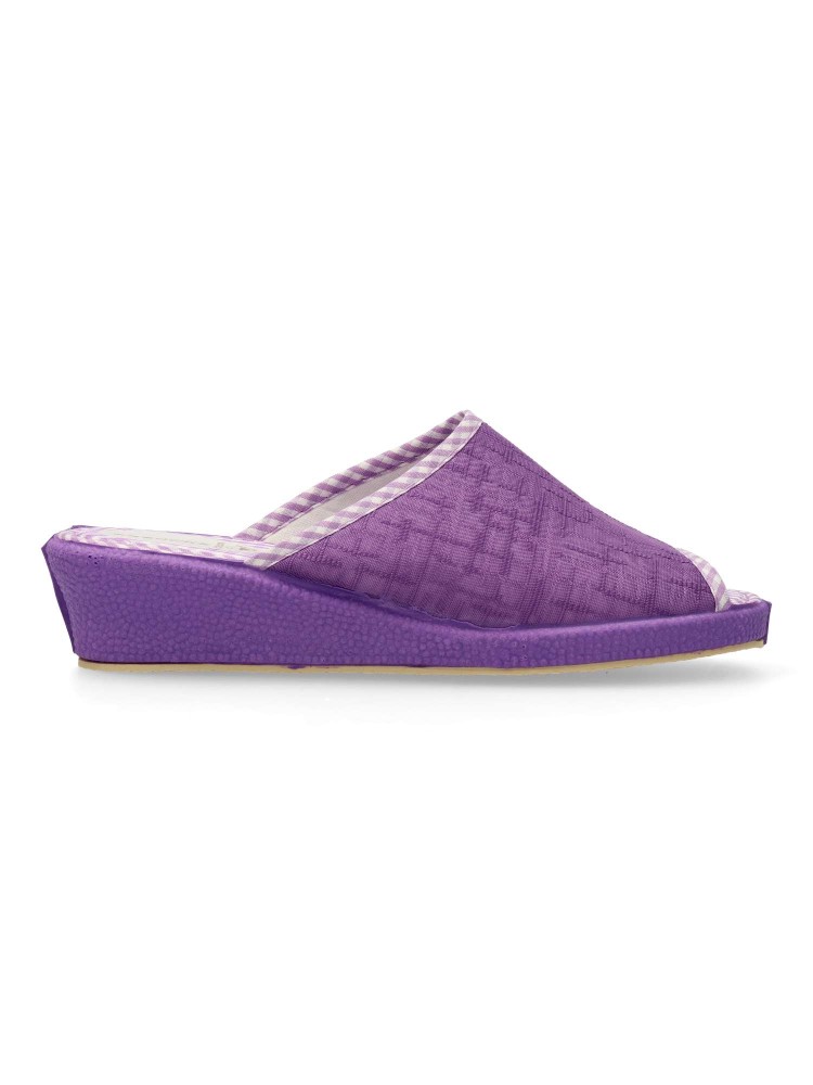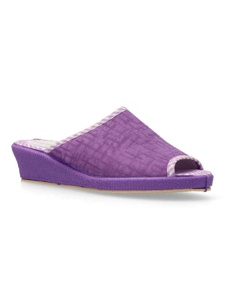 Zapatilla de casa para mujer. Disponible en color morado. Suela de goma flexible. Modelo cómodo fabricado en material textil acolchado y ribete de cuadros. Puntera descubierta pinki. Altura cuña 4 cm. Hecho en España.