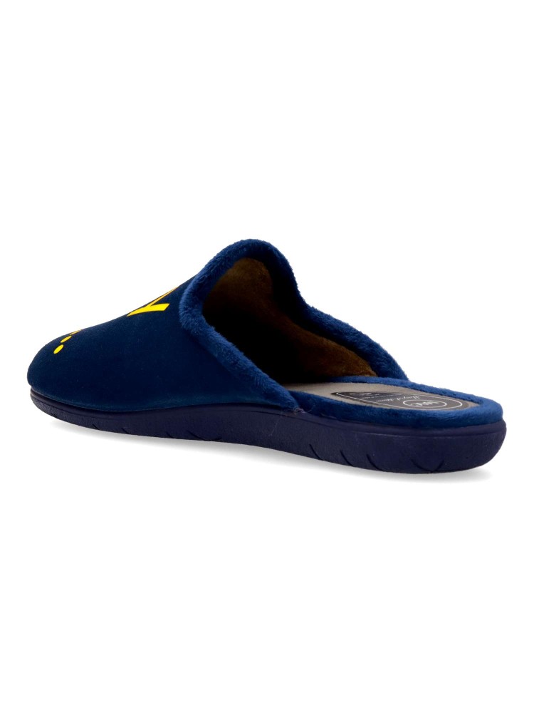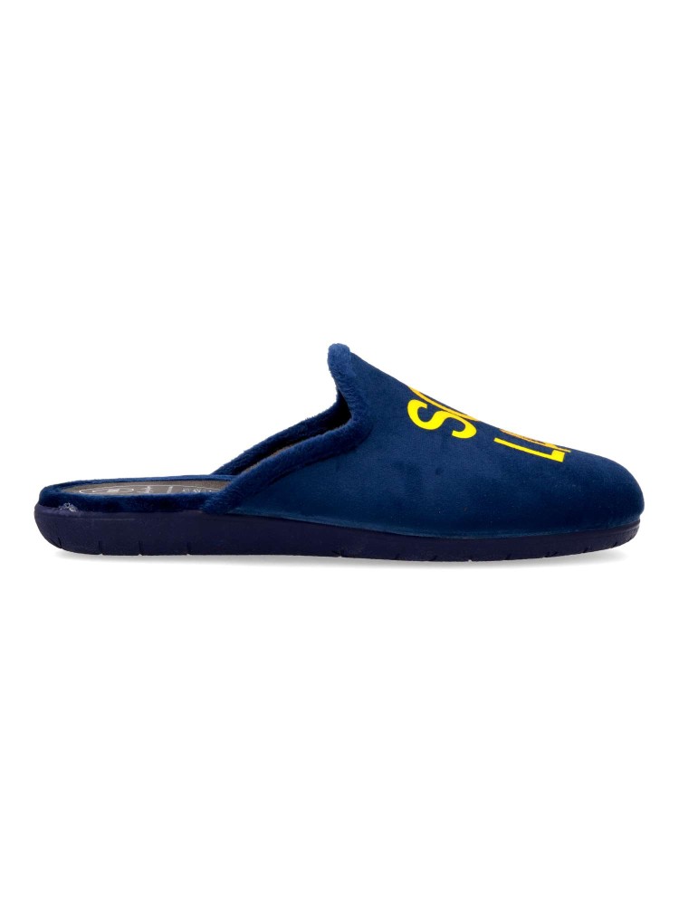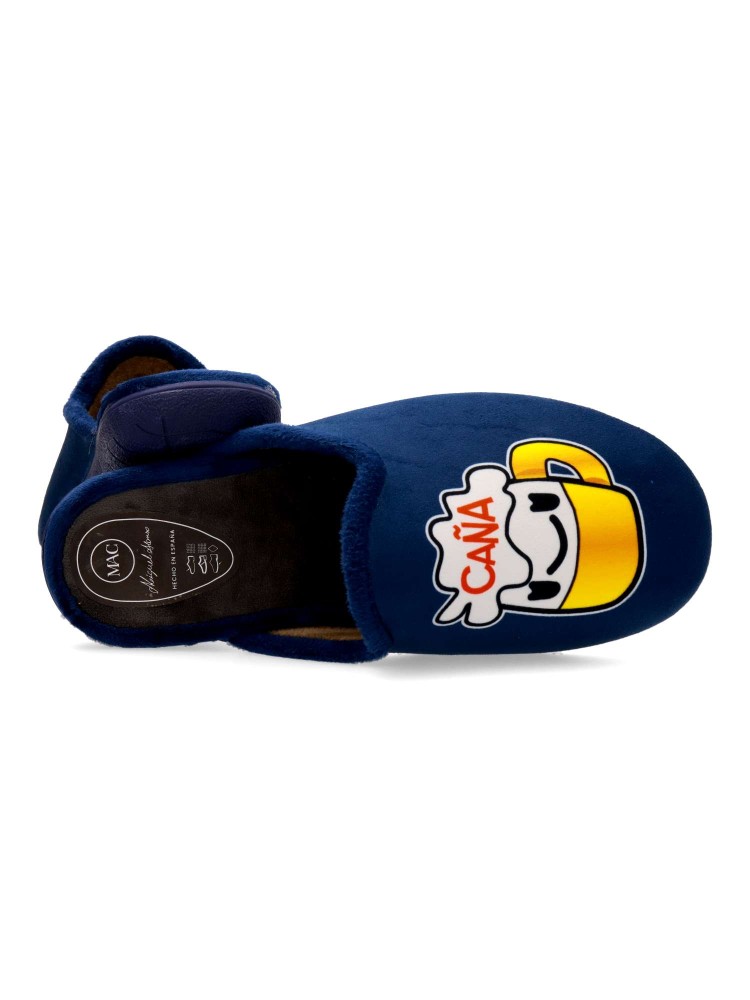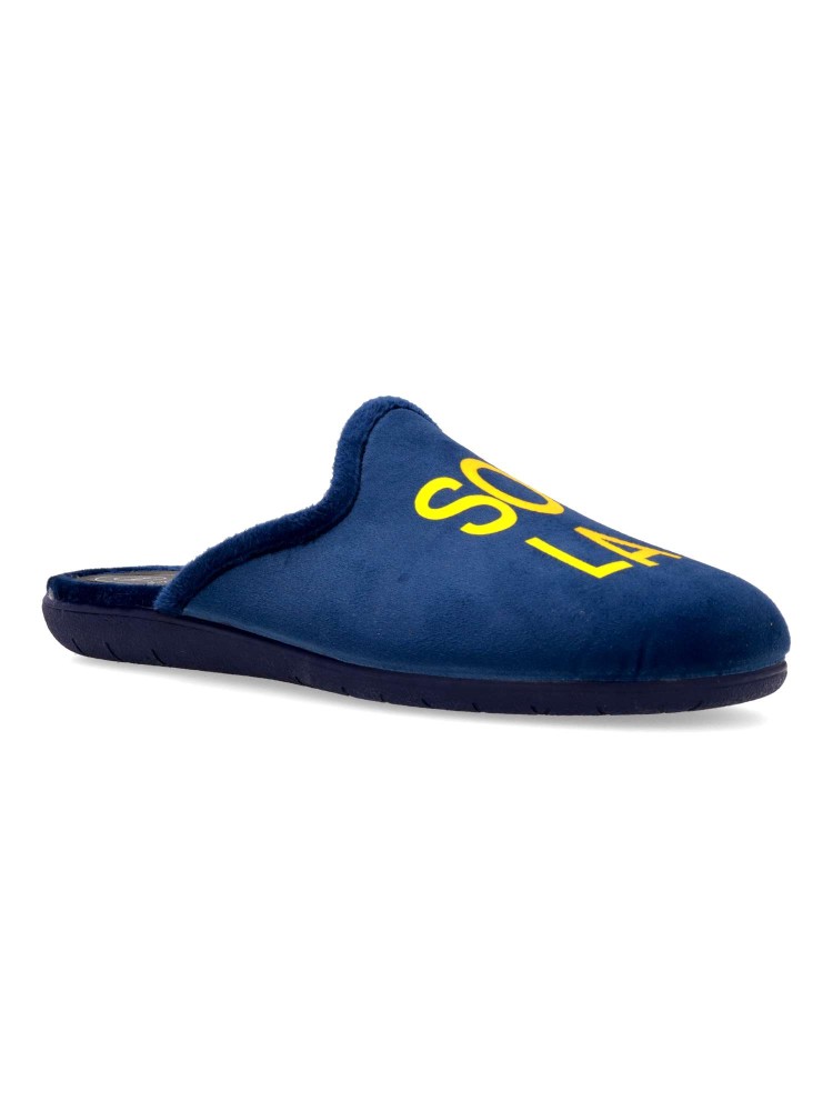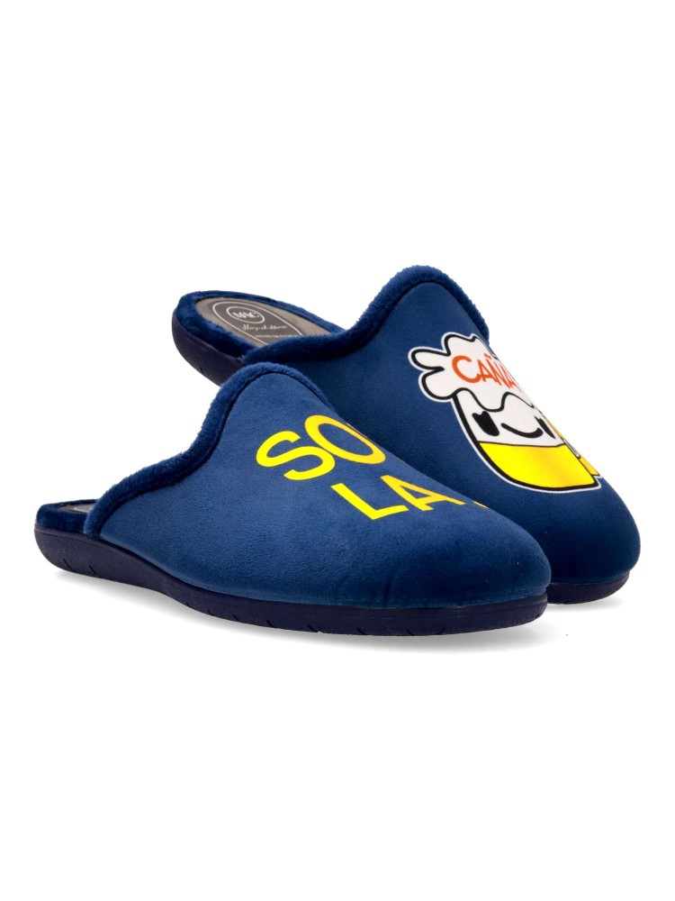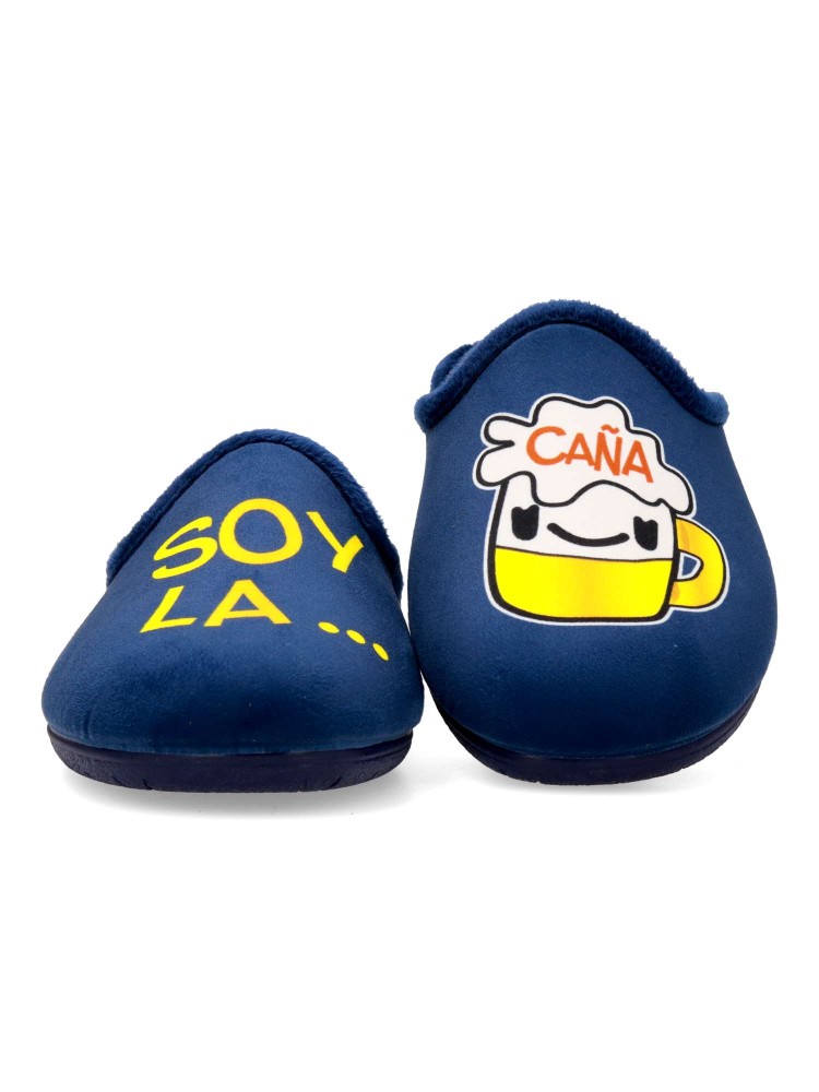 Zapatilla de casa para hombre. Color marino. Interior con pelo sintético. Suela de goma ligera y flexible. Plantilla acolchada. Detalle estampado "Soy la Caña". Agradable sensación de comodidad y calidez para los días más fríos. Hecho en España.