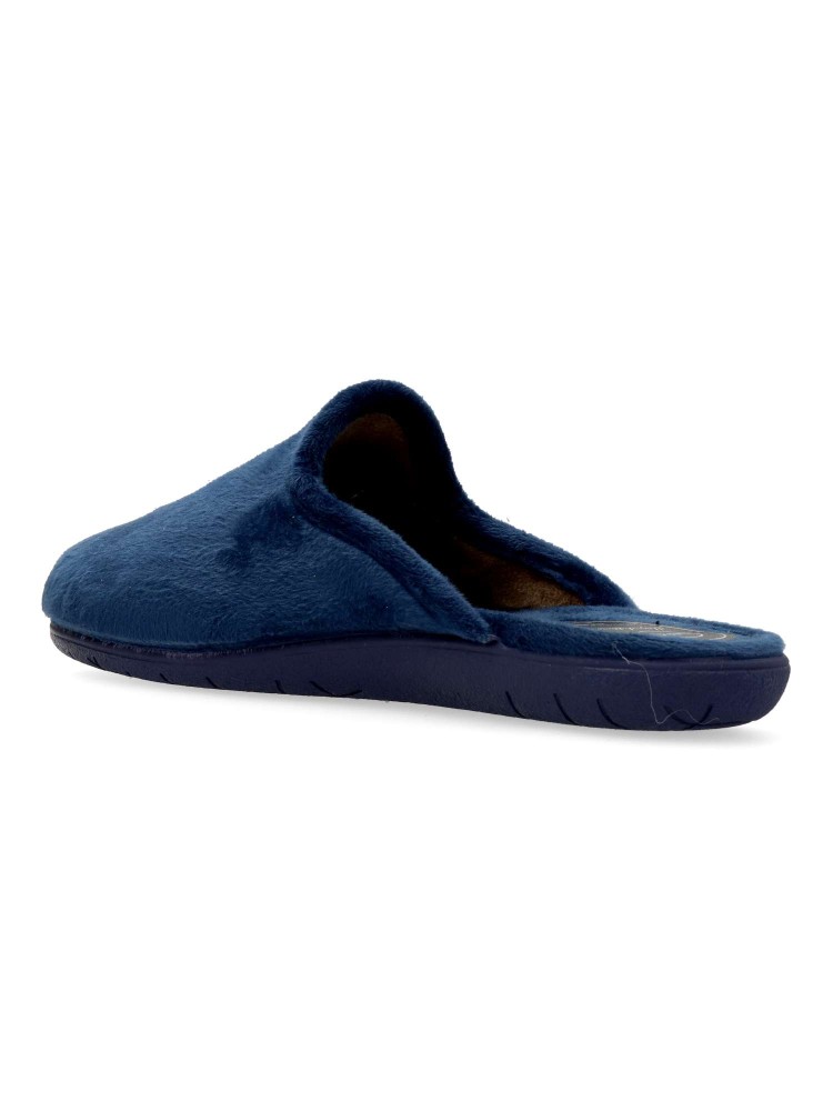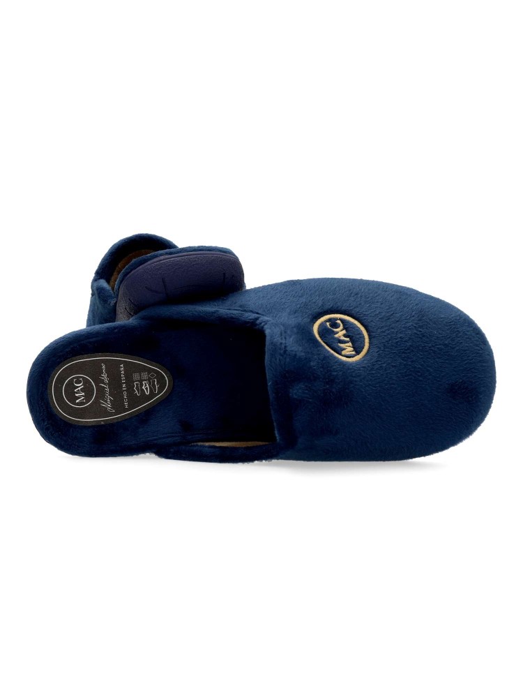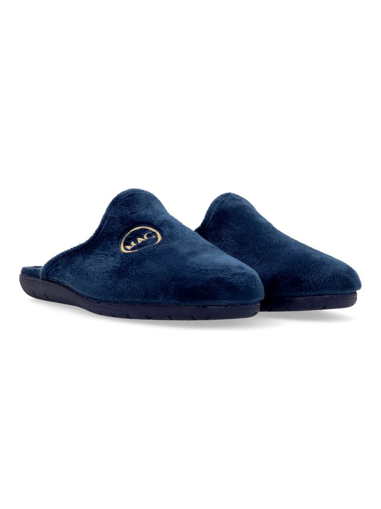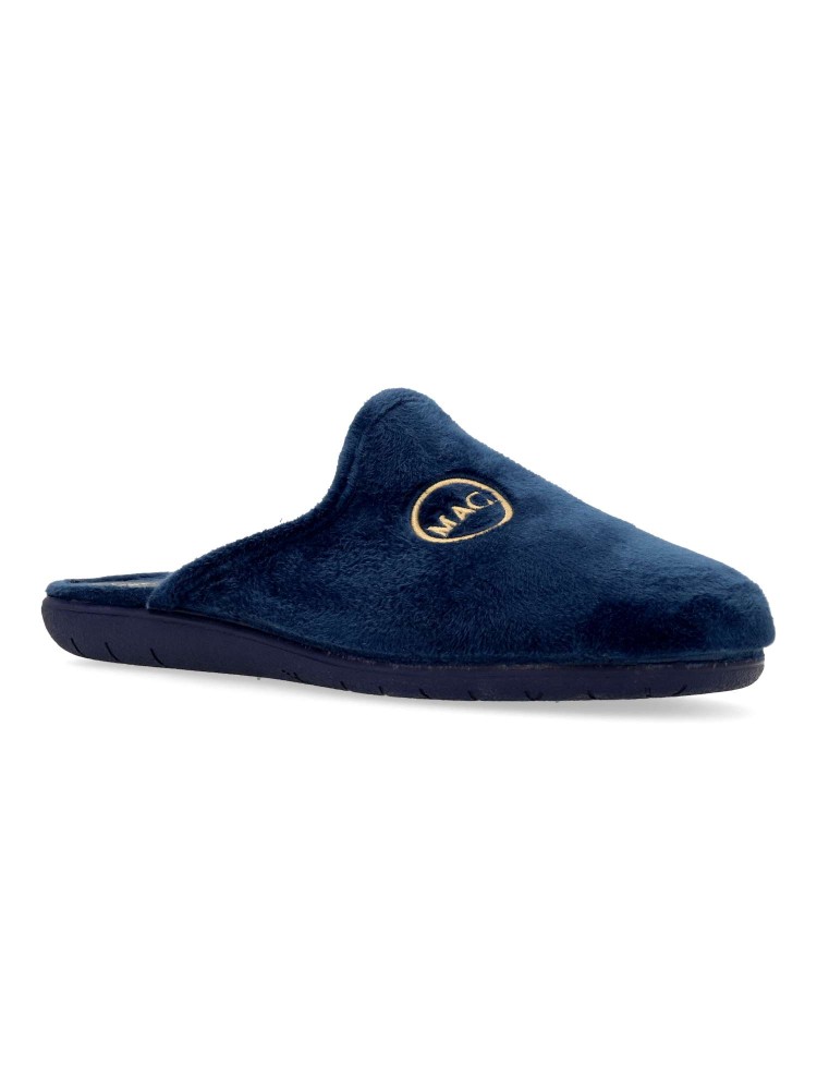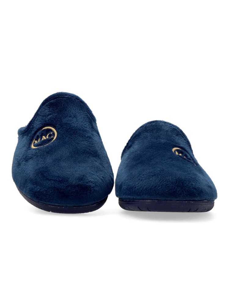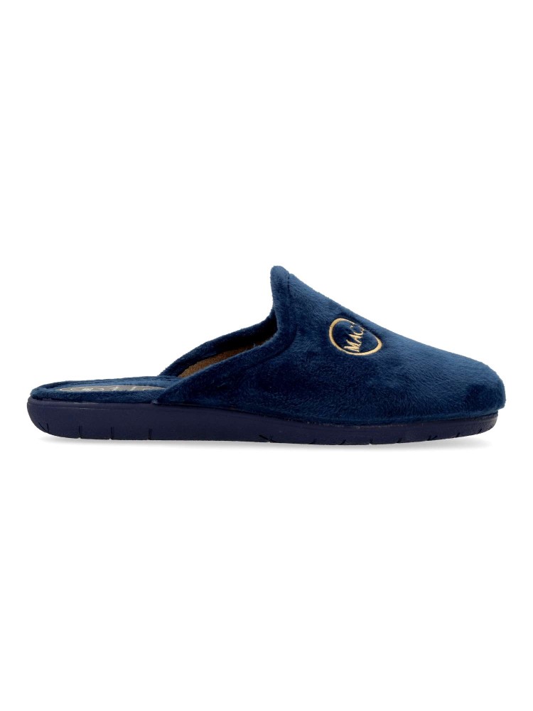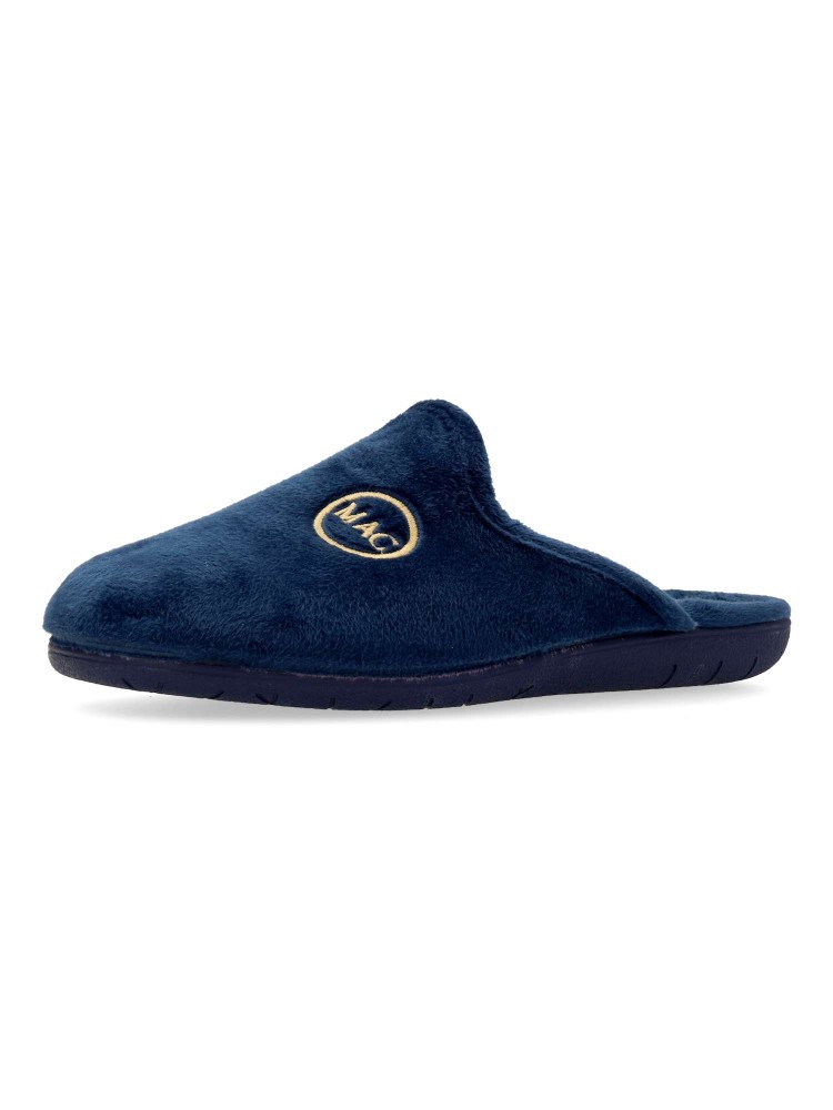 Zapatilla de casa para hombre. Color marino. Fabricada en textil con suela de goma ligera y flexible. Plantilla acolchada. Detalle escudo bordado. Chinela cómoda y abrigada que no te querrás quitar en los días de frío. Hecho en España.