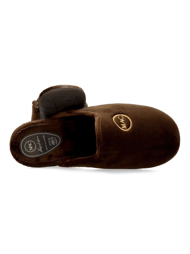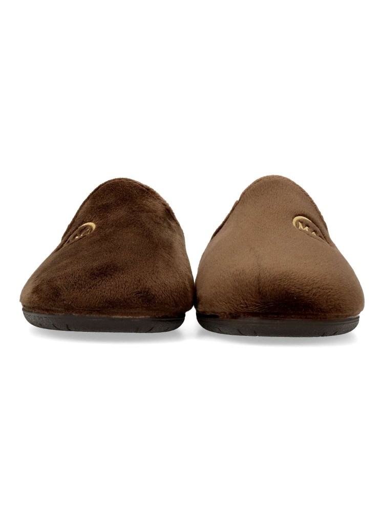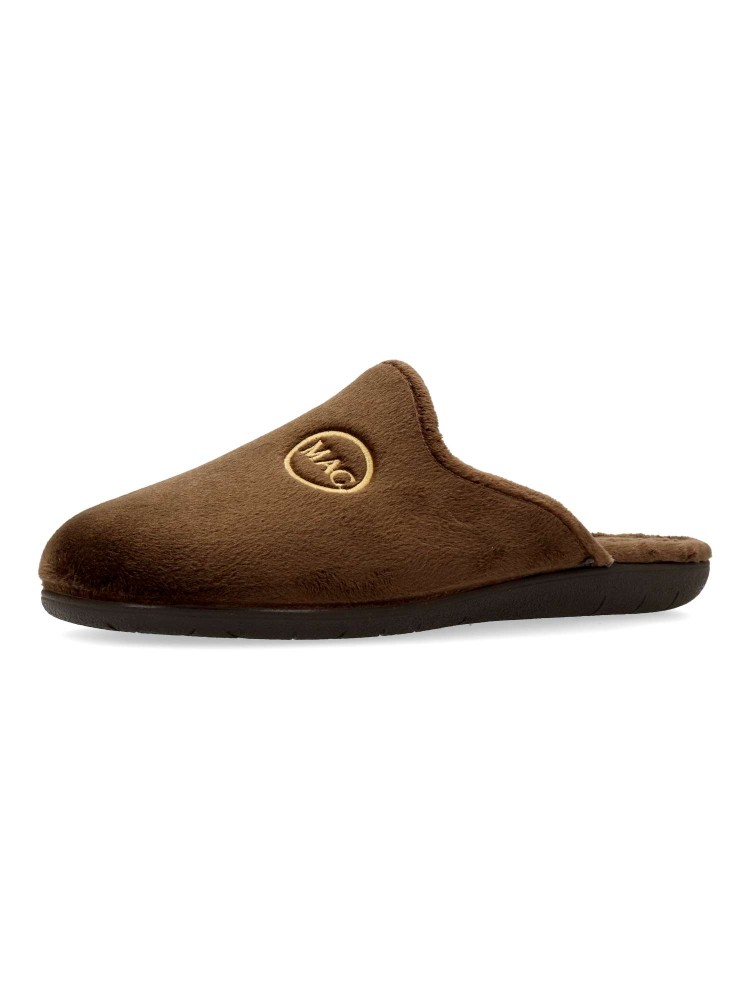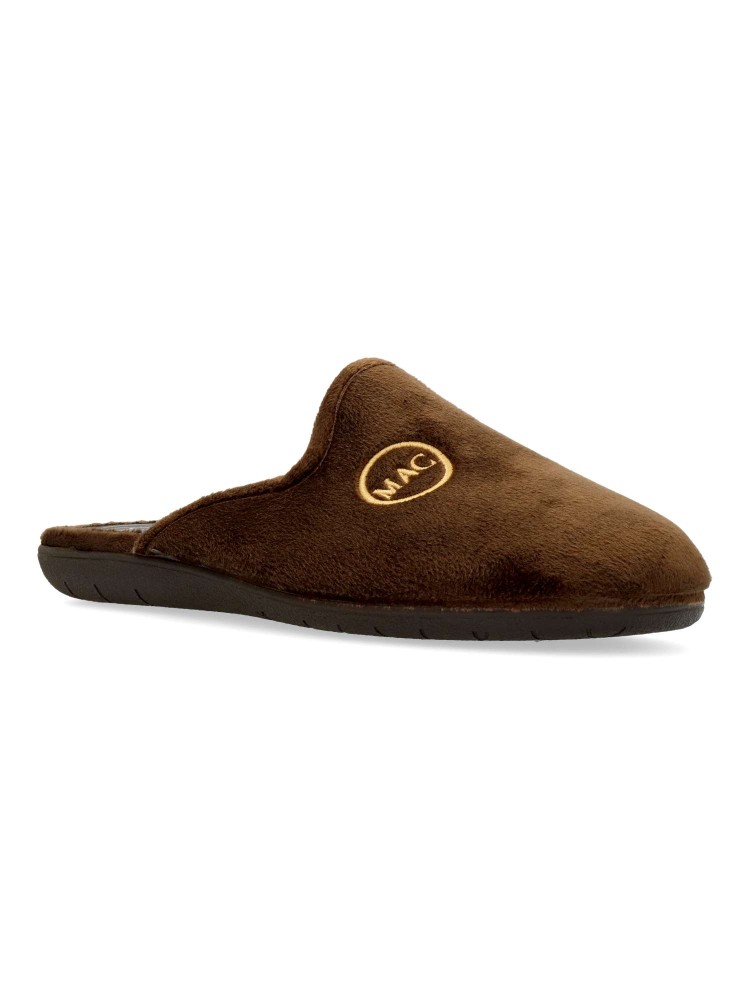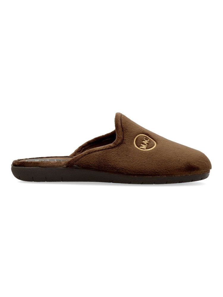 Zapatilla de casa para hombre. Color marrón. Fabricada en textil con suela de goma ligera y flexible. Plantilla acolchada. Detalle escudo bordado. Chinela cómoda y abrigada que no te querrás quitar en los días de frío. Hecho en España.