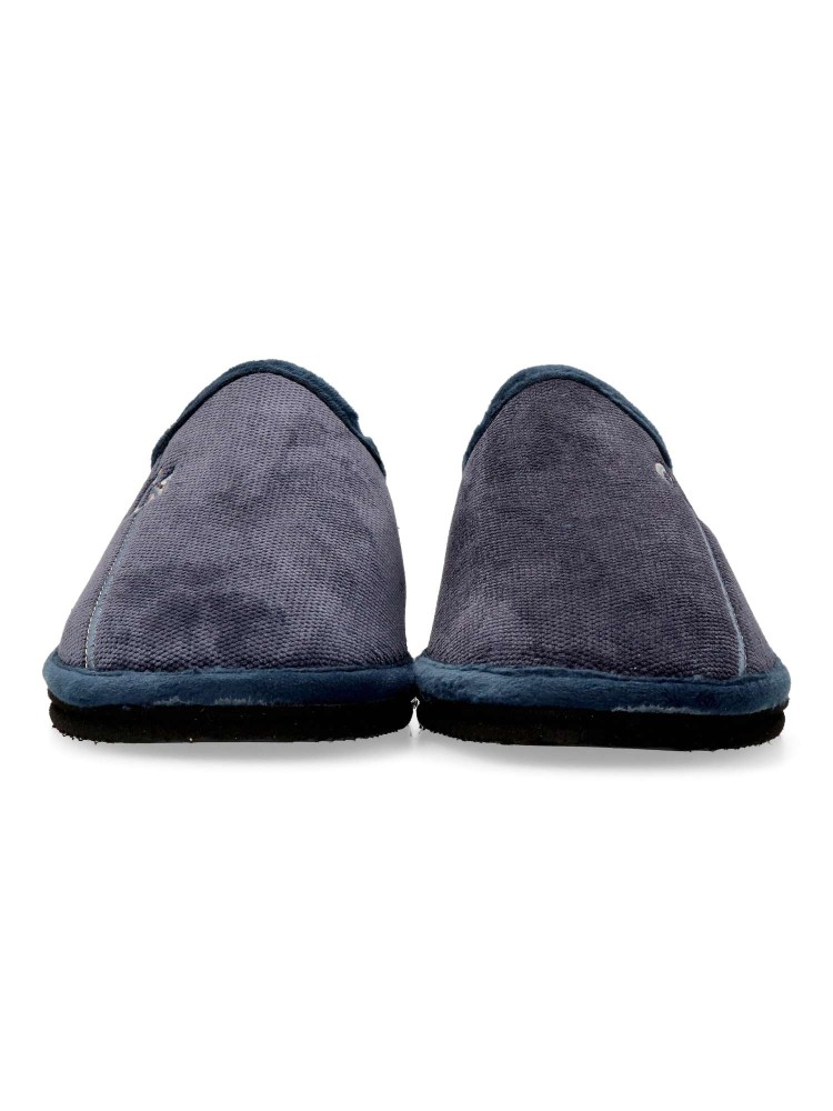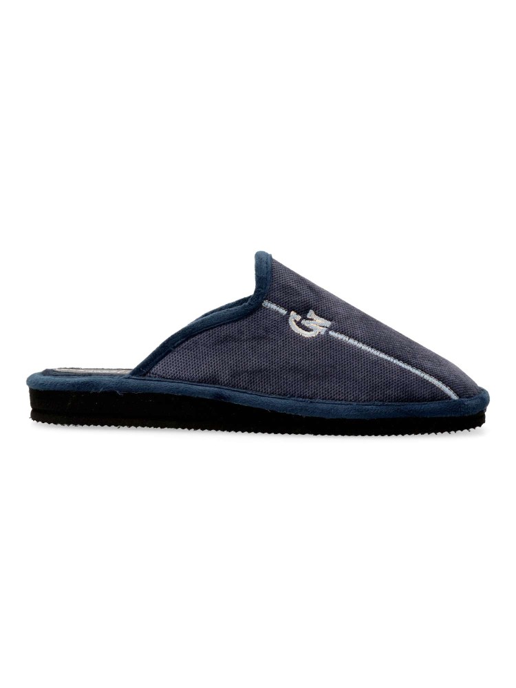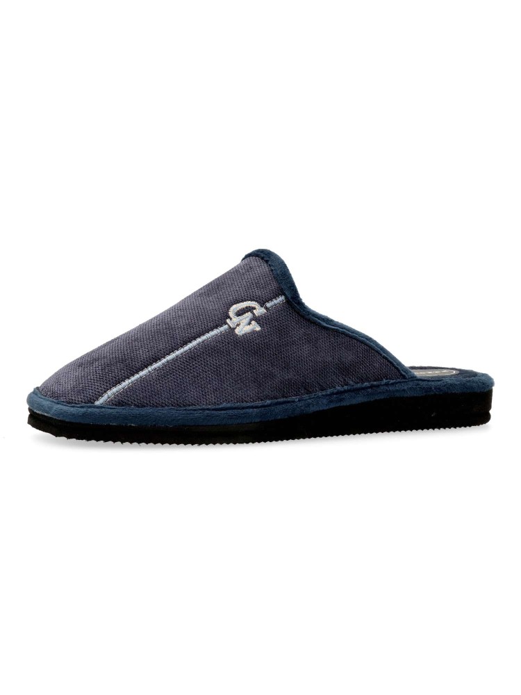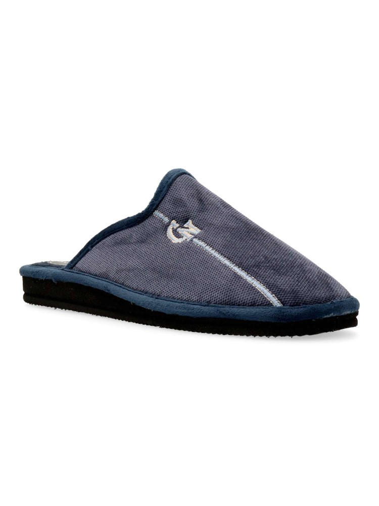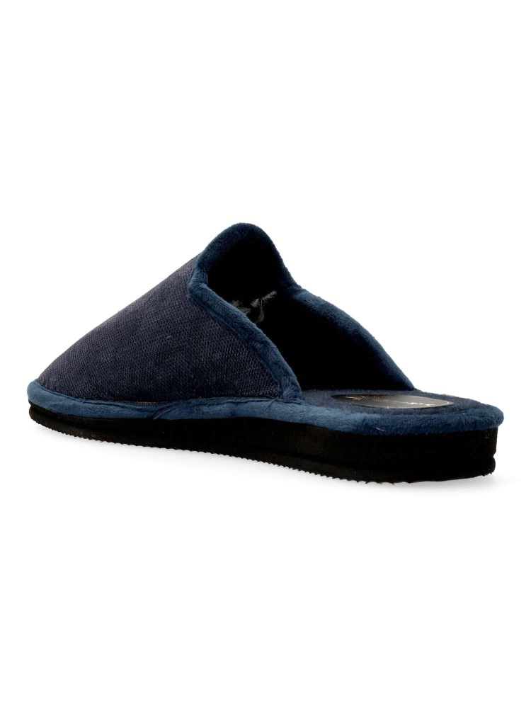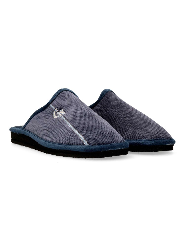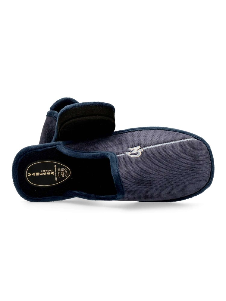 Zapatilla de casa para hombre. Disponible en color marino. Fabricada en textil suave, con suela de goma EVA (especial parquet). Detalle bordado. Modelo ligero, cómodo y abrigado para los días más fríos. Hecho en España.