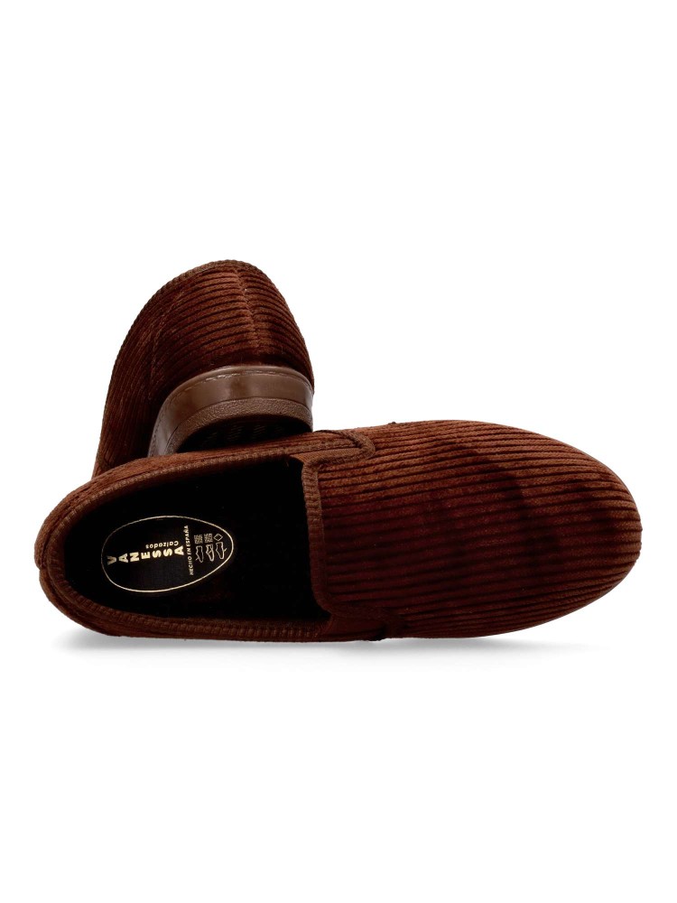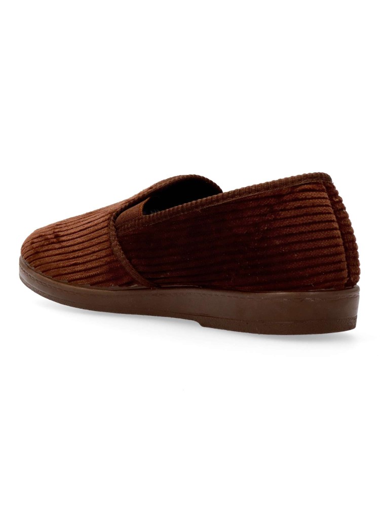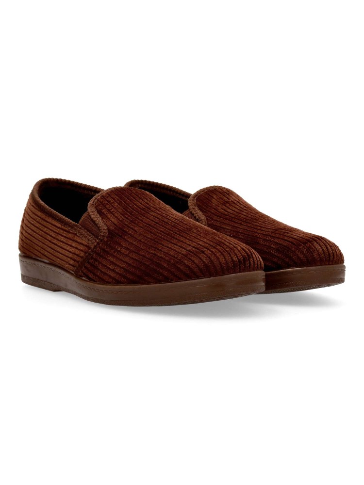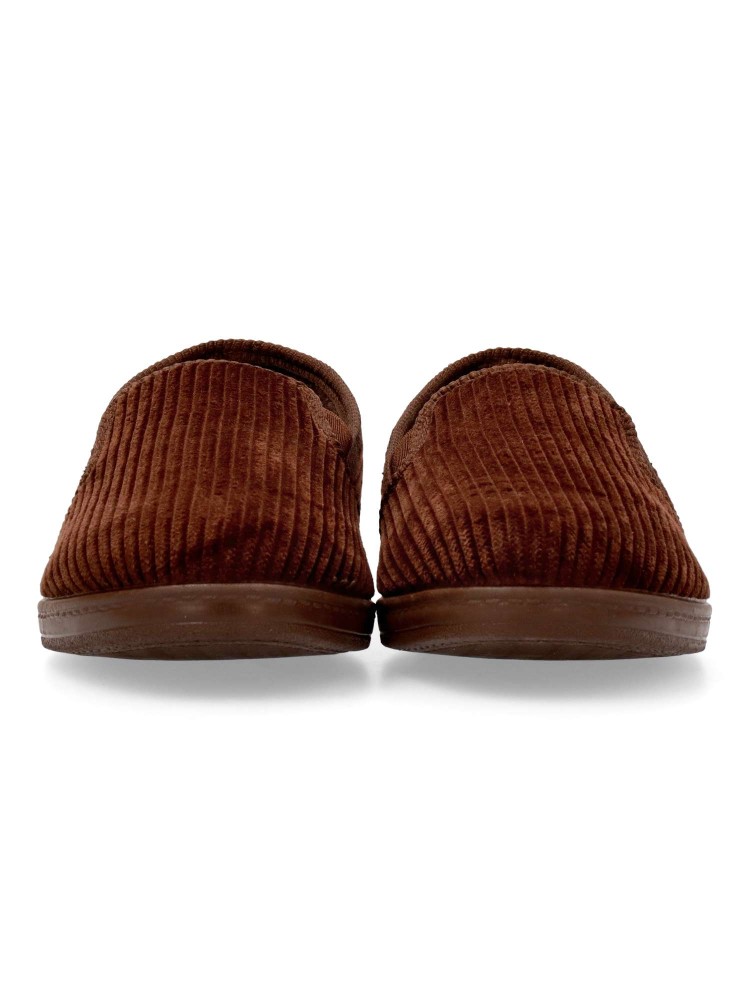 Zapatilla de casa para hombre, con elásticos en los laterales. Color marrón. Fabricada en textil, con suela de caucho antideslizante, flexible y ligera. Zapatilla cerrada de pana, que ofrece confort y calidez para los días más fríos. Hecho en España.