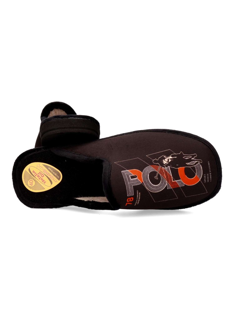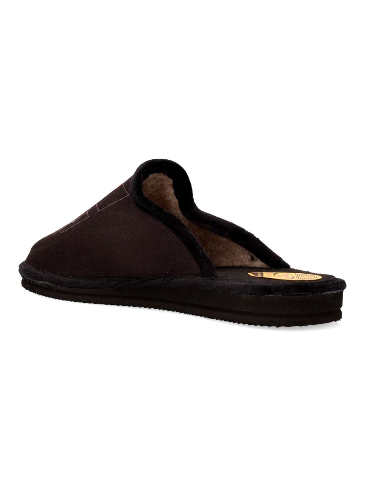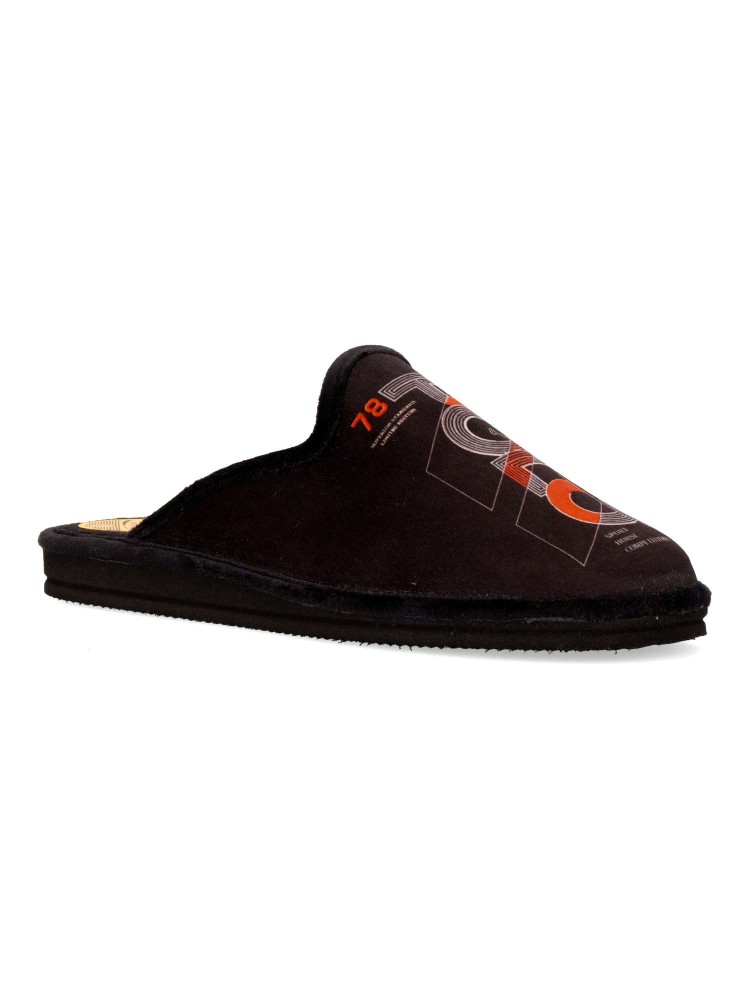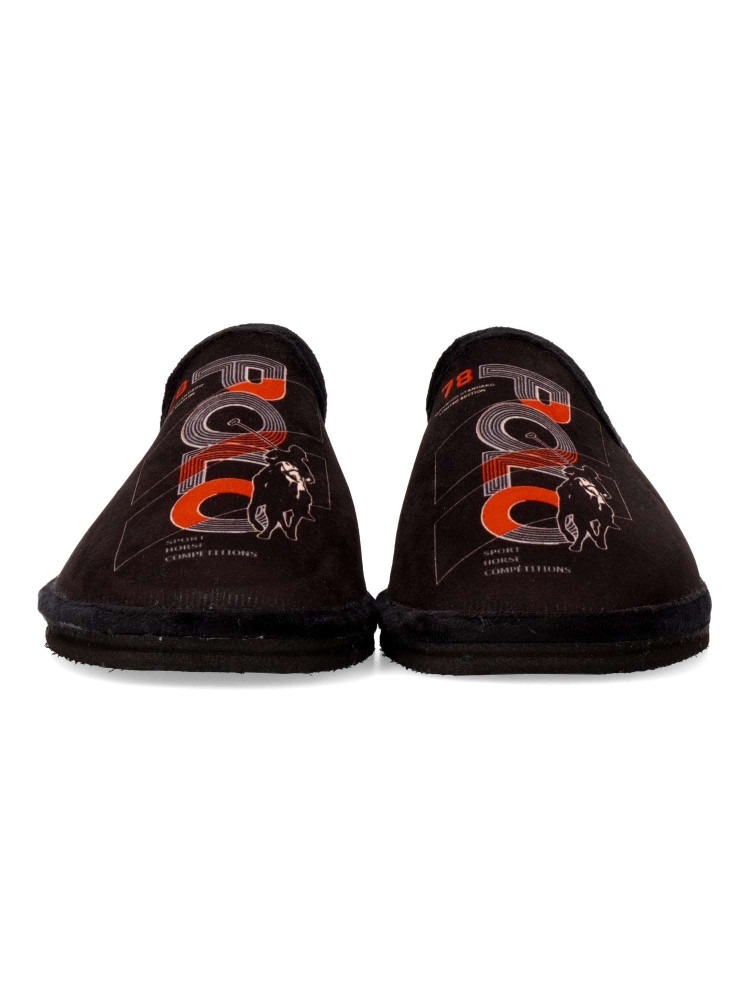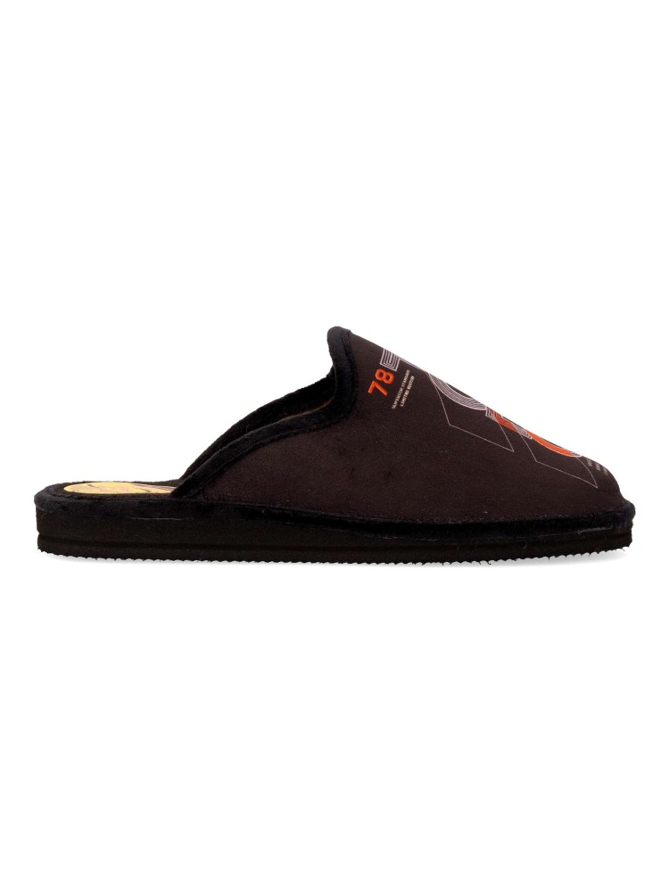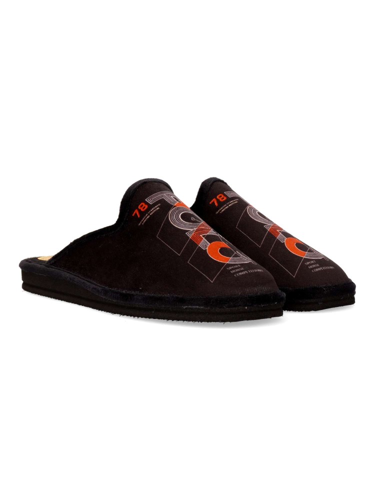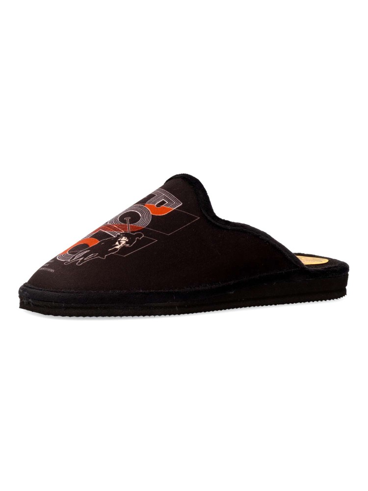 Zapatilla de casa para hombre. Disponible en color negro. Fabricada en textil suave, con suela de goma EVA (especial parquet). Dibujo estampado. Modelo ligero, cómodo y abrigado para los días más fríos. Hecho en España.