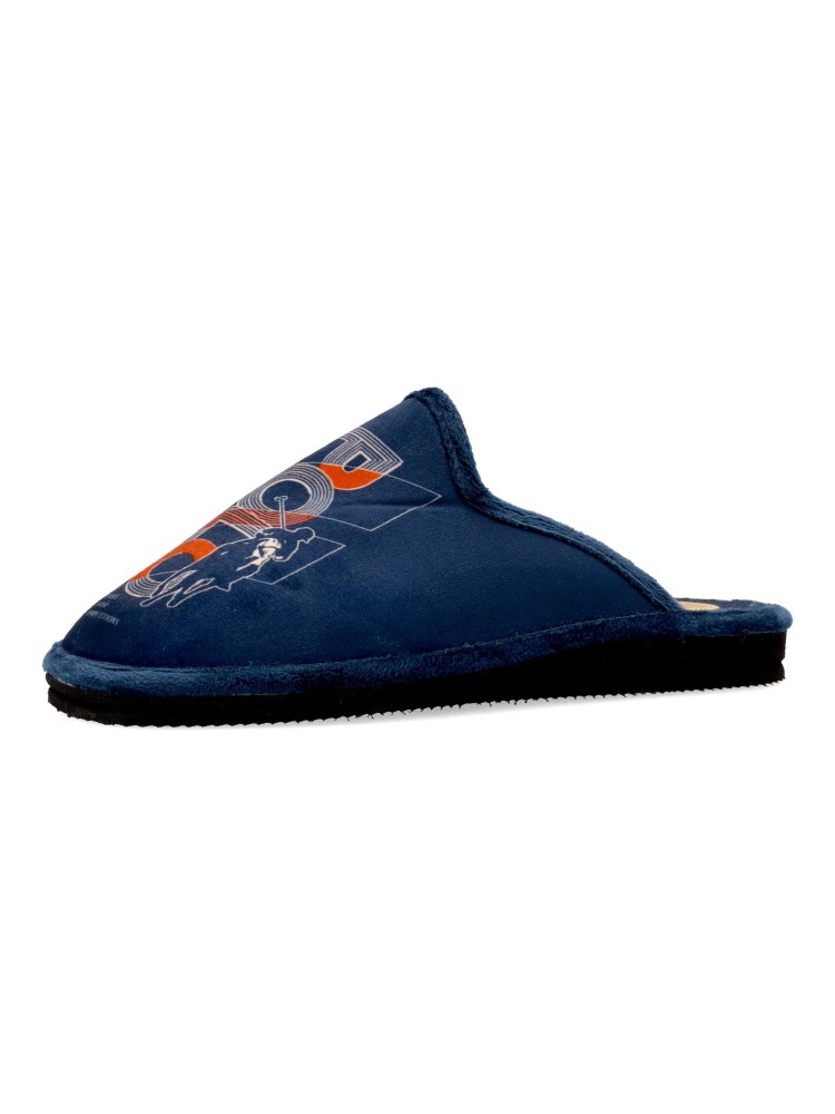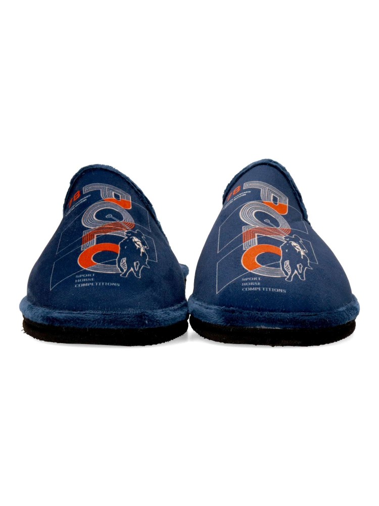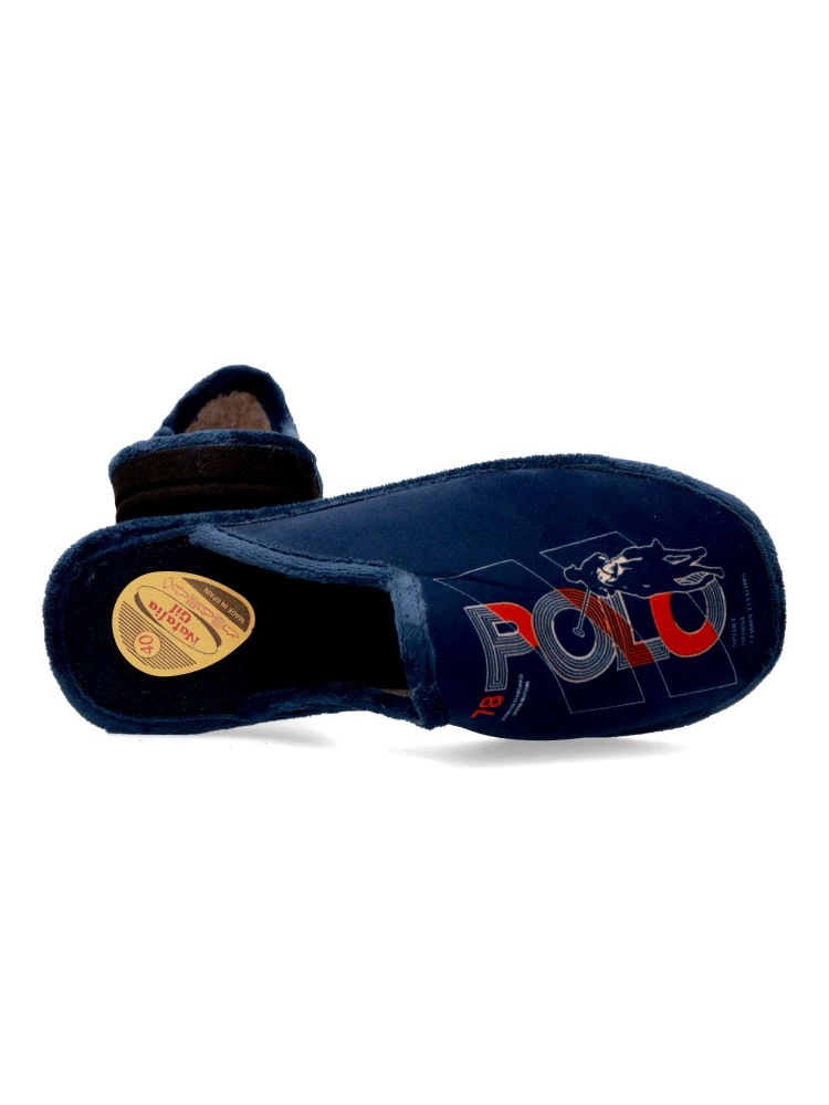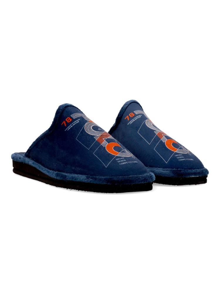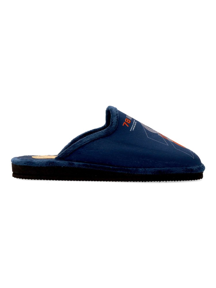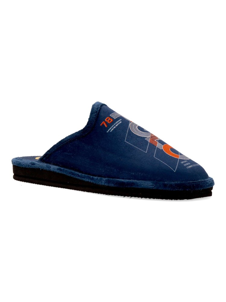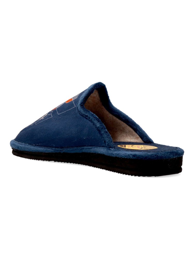 Zapatilla de casa para hombre. Disponible en color marino. Fabricada en textil suave, con suela de goma EVA (especial parquet). Dibujo estampado. Modelo ligero, cómodo y abrigado para los días más fríos. Hecho en España.