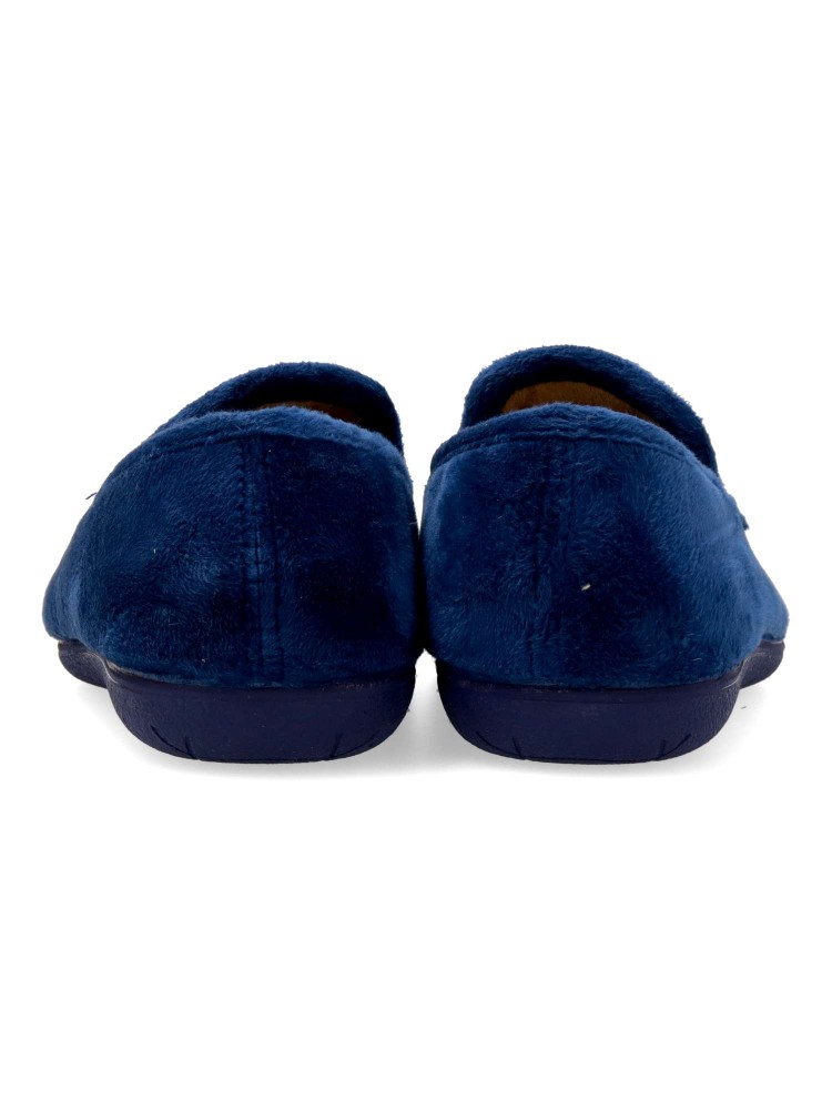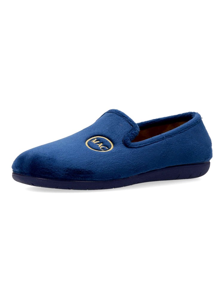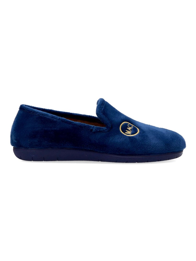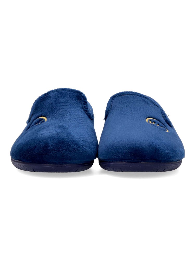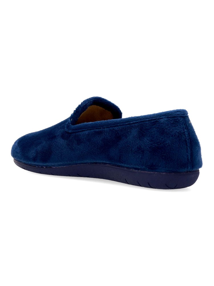 Zapatilla de casa para hombre. Modelo cerrado en color marino. Fabricada en tejido pelo suave, con suela de goma flexible y antideslizante. Plantilla acolchada y extraíble. Detalle bordado. Modelo cómodo y abrigado para que no pases frío. Hecho en España.