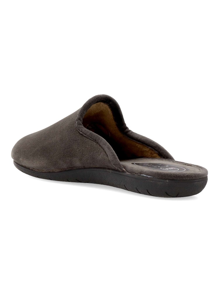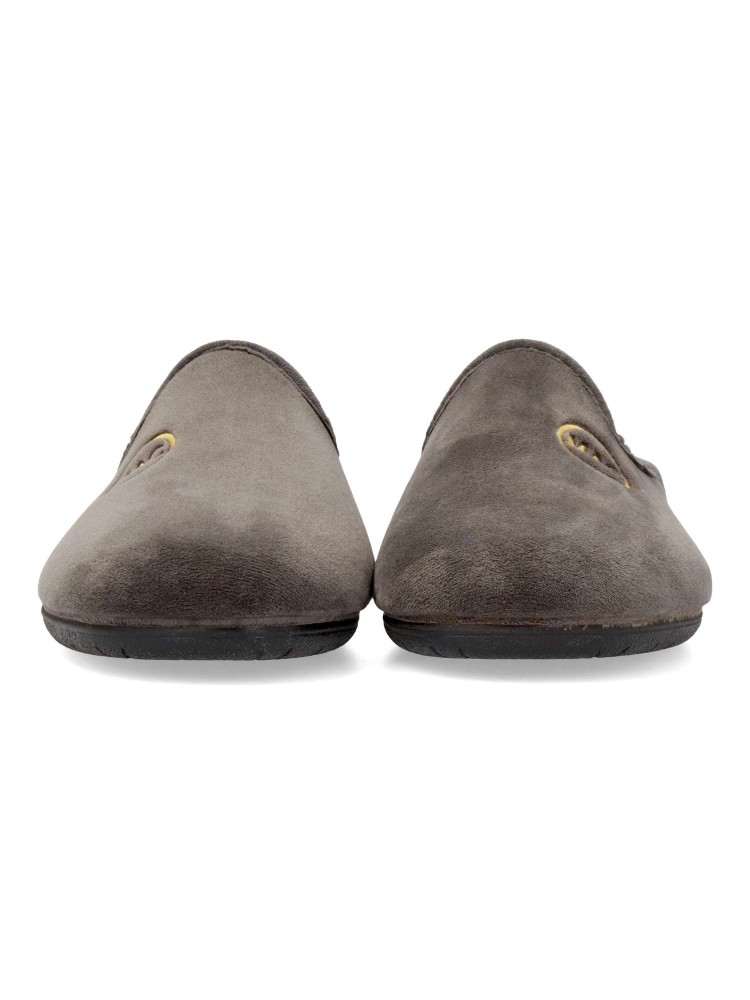 Zapatilla de casa para hombre. Color gris. Fabricada en textil con suela de goma ligera y flexible. Plantilla acolchada. Detalle escudo bordado. Chinela cómoda y abrigada que no te querrás quitar en los días de frío. Hecho en España.