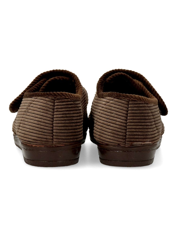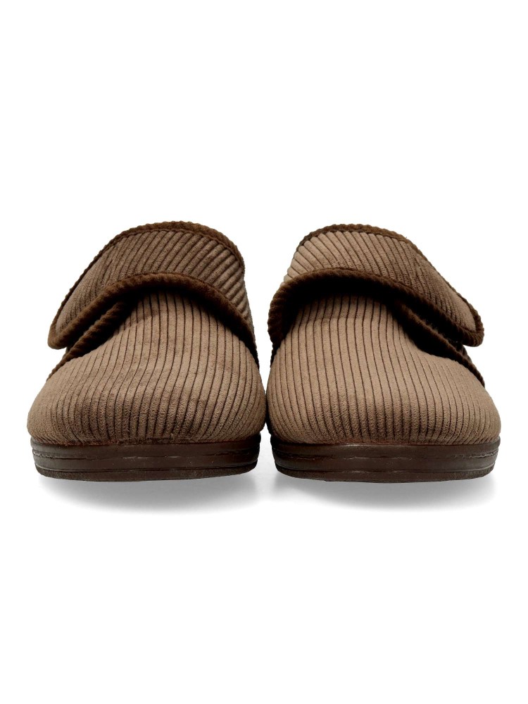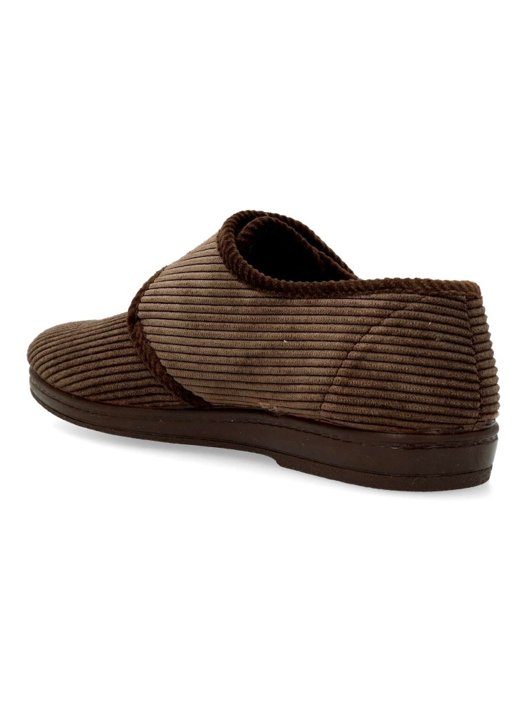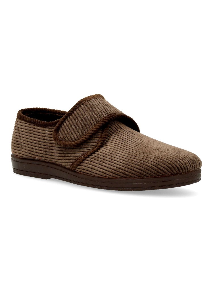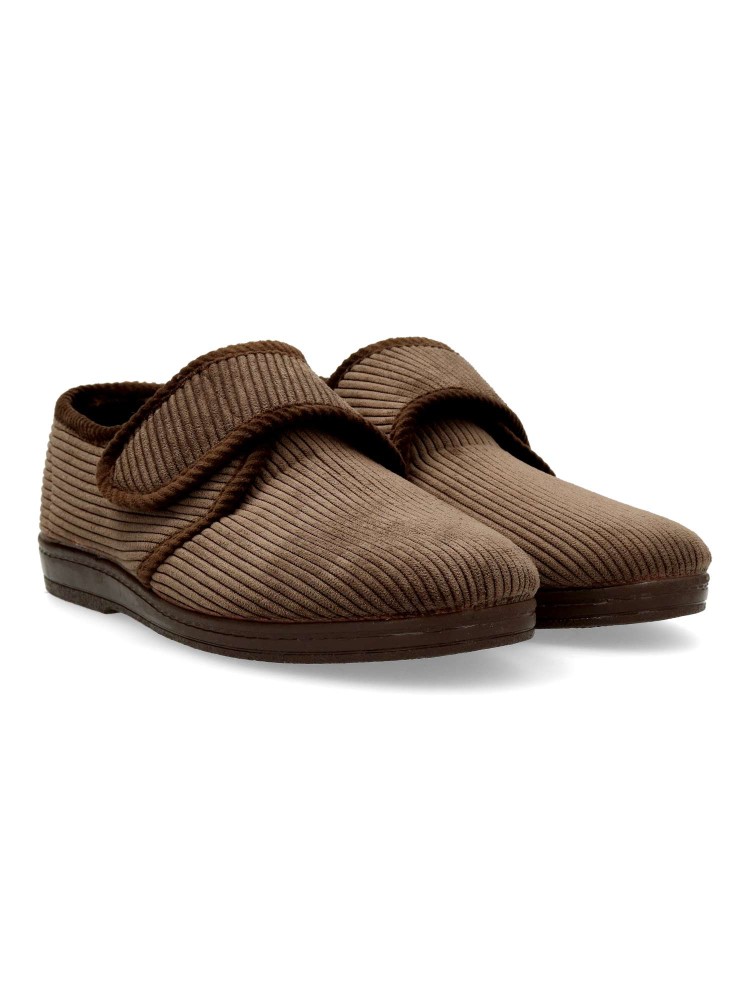 Zapatilla de casa para hombre, con cierre de velcro. Color marrón. Fabricada en textil, con suela de caucho antideslizante, flexible y ligera. Zapatilla cerrada de pana, que ofrece confort y calidez para los días más fríos. Hecho en España.