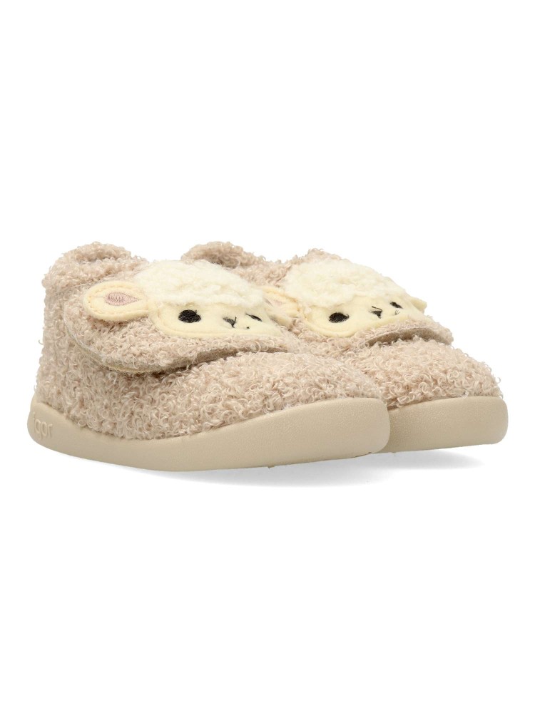 Zapatilla de casa para niña, con detalle de oveja. Concepto barefoot, cero drop, flexible y blandito, plantilla extraíble y cierre adherente para mayor ajuste y autonomía. Fabricada en un tejido súper blandito, calentito y suave.