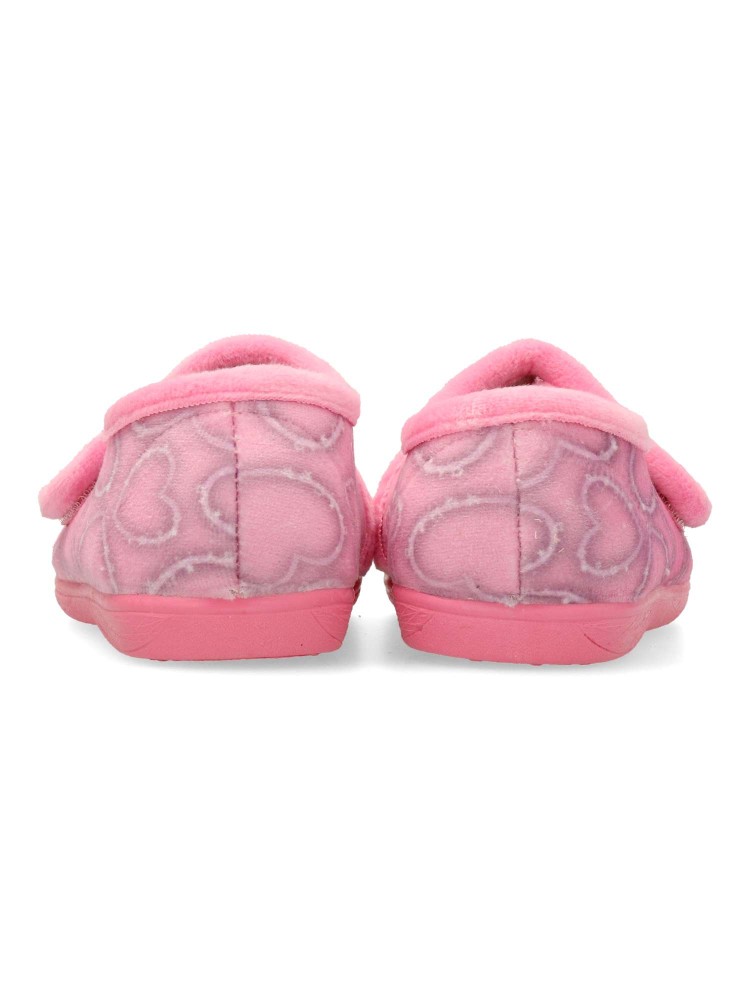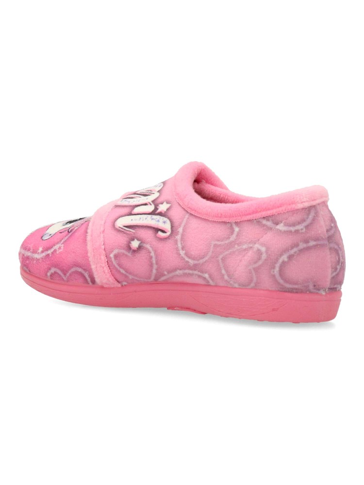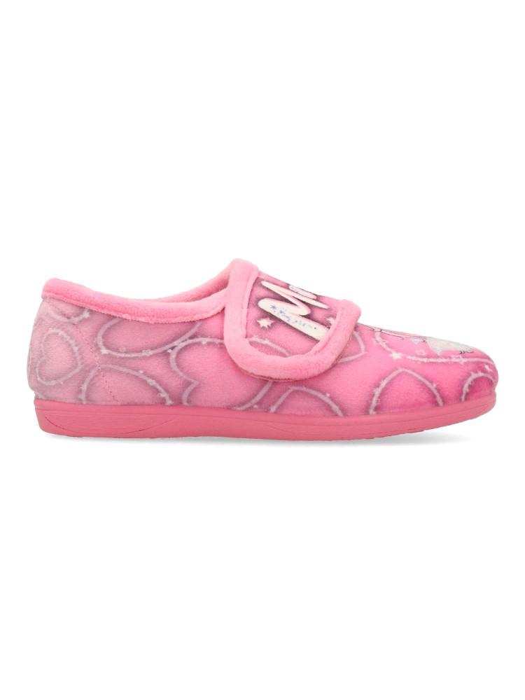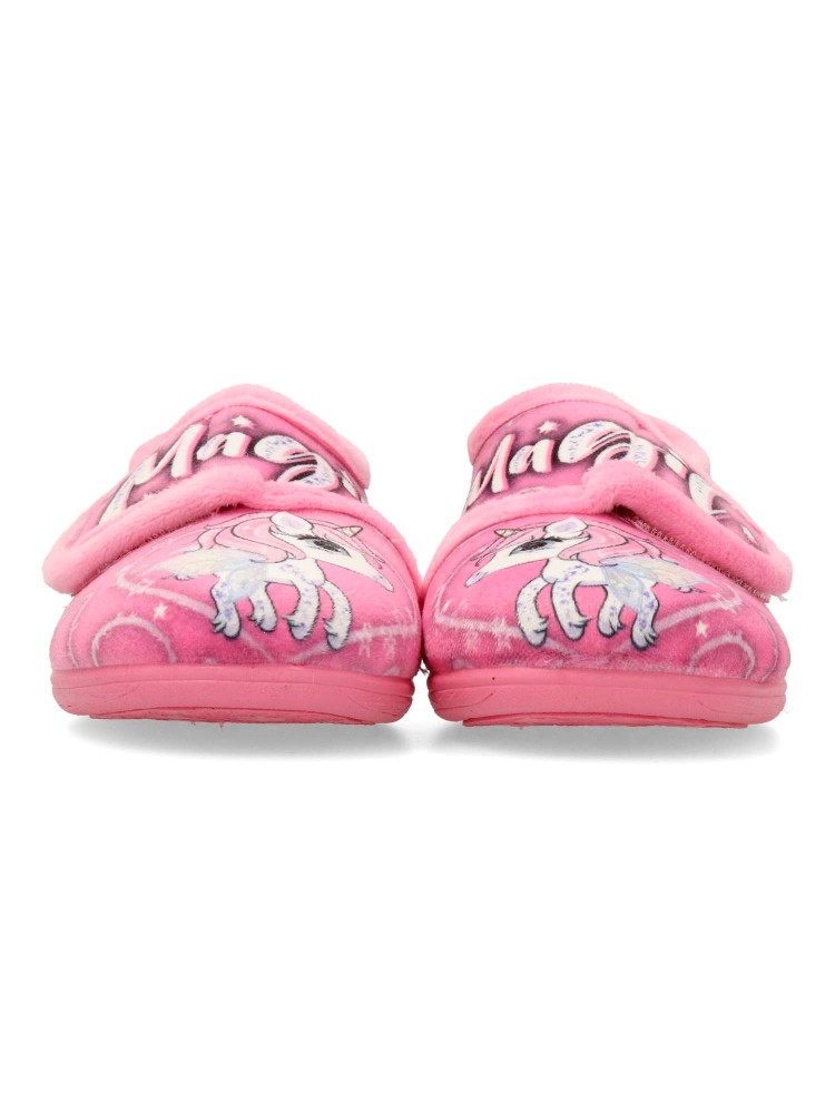 Zapatilla cerrada de casa para niña, con estampado dibujo Unicornio. Cierre adherente. Suela de goma flexible. Color rosa. Cómodo y abrigado para los días más fríos. Zapatillas de casa infantiles perfectas para estar cómodo en casa. Hechas en España.
