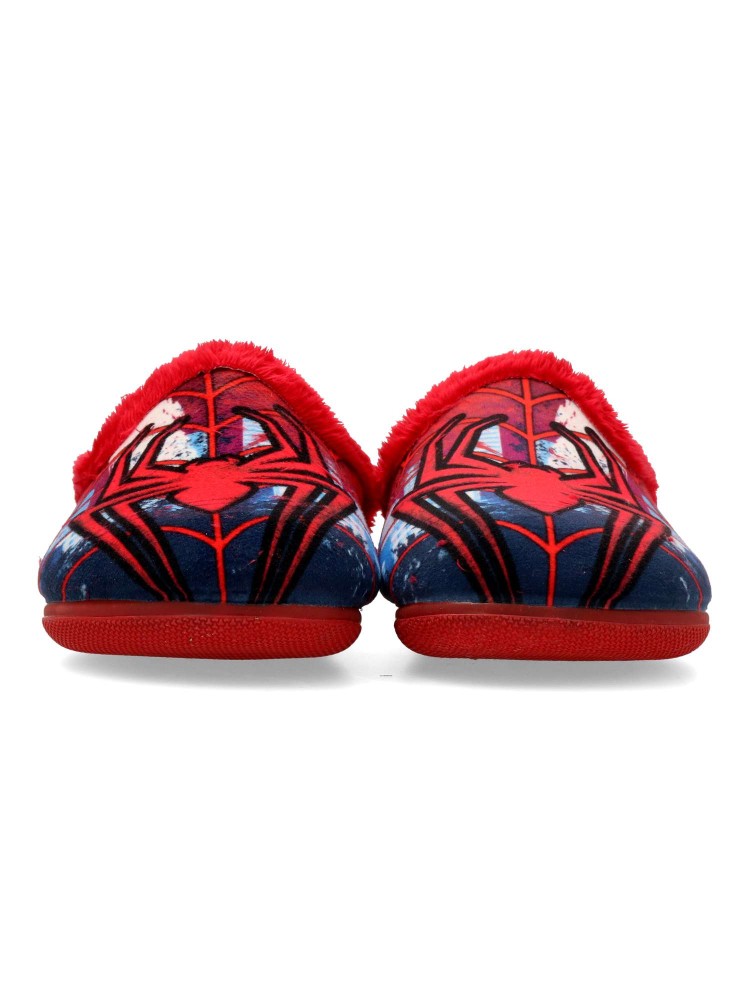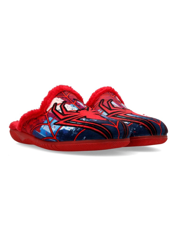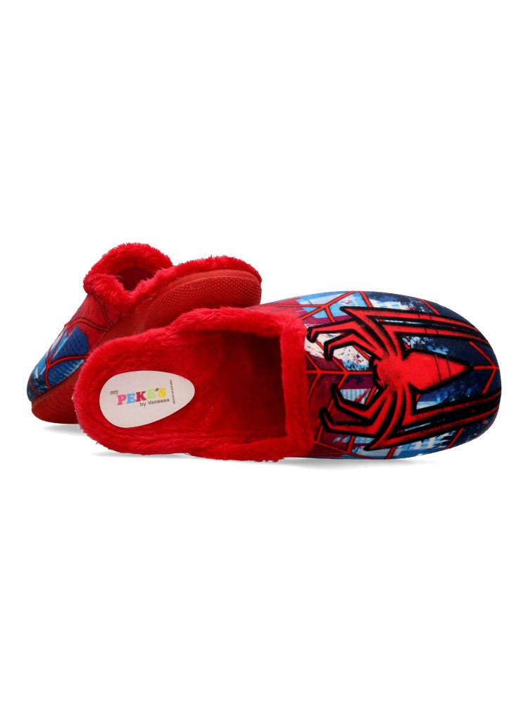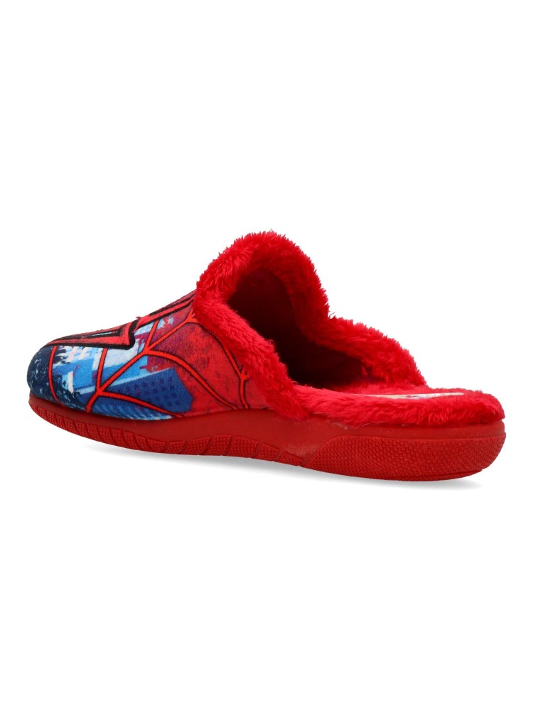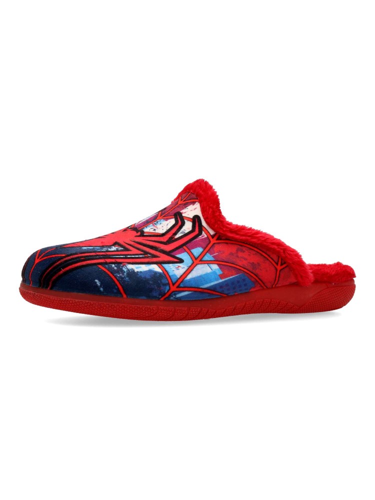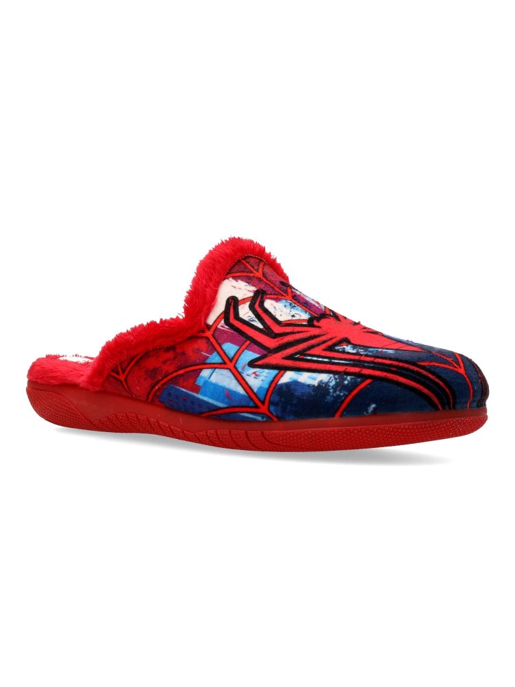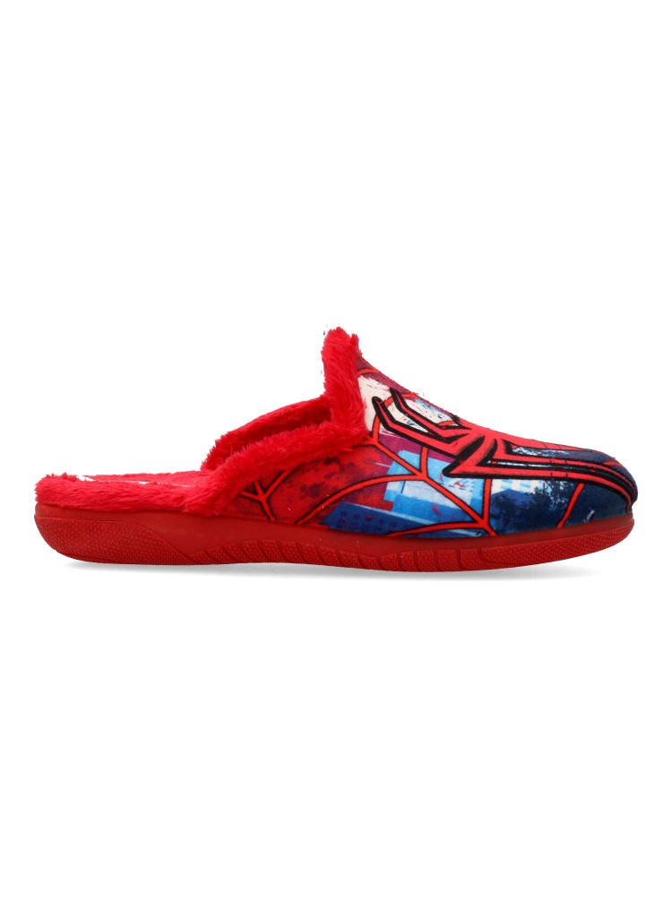 Zapatilla de casa para niño/niña. Disponible en color rojo. Fabricada en textil con suela de goma ligera y flexible. Plantilla acolchada. Detalle dibujo estampado Spider. Modelo cómodo y abrigado para los días más fríos. Hecho en España.