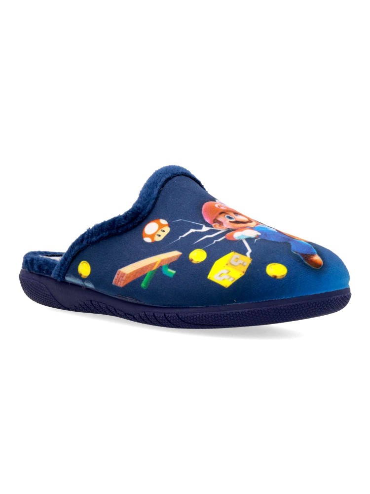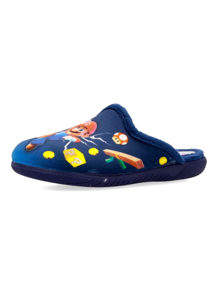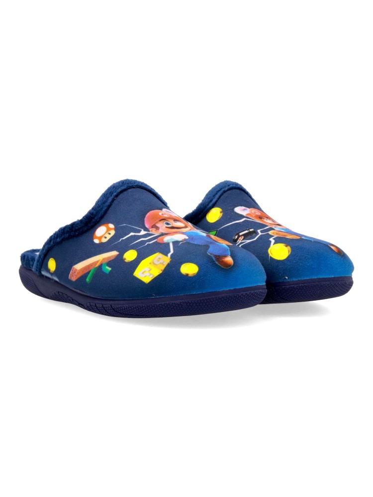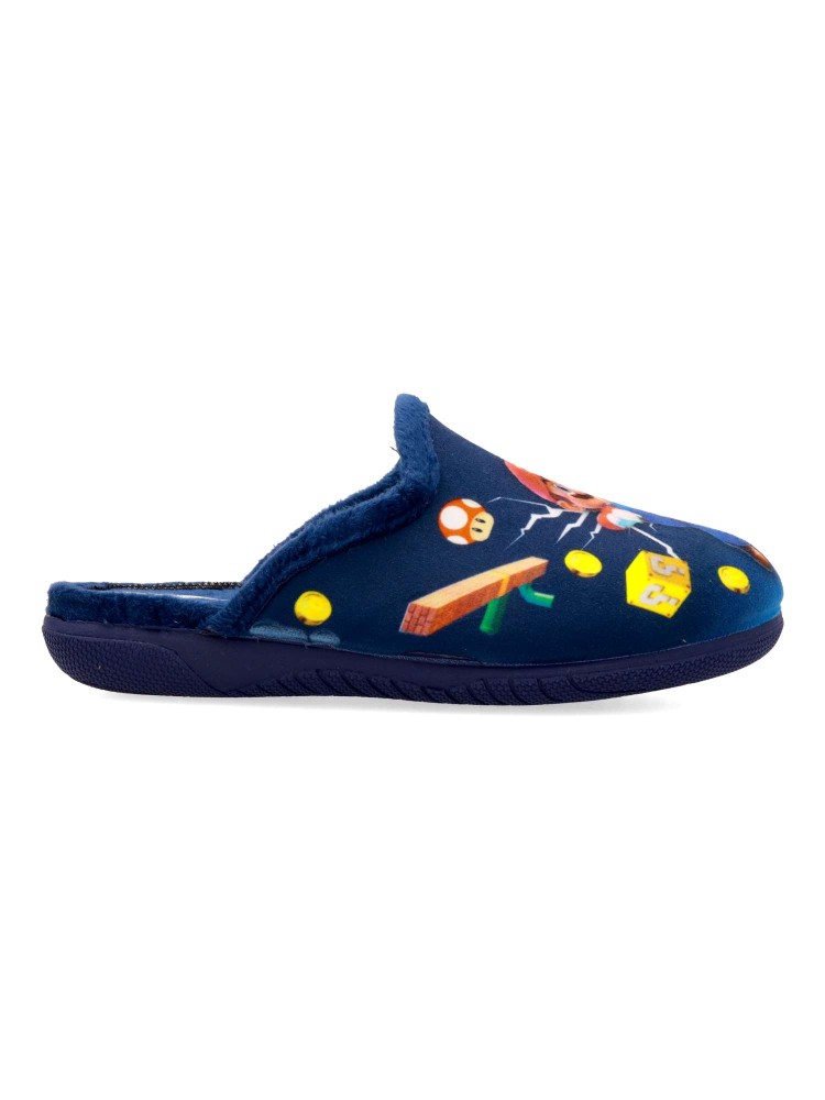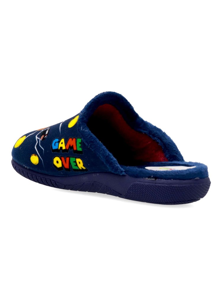 Zapatilla de casa para niño. Color rojo. Interior con pelo sintético suave. Suela de goma ligera y flexible. Plantilla acolchada. Detalle dibujo estampado. Agradable sensación de comodidad y calidez para los días más fríos. Hecho en España.