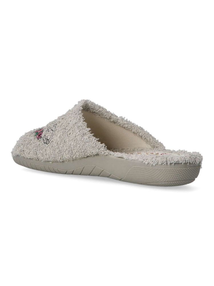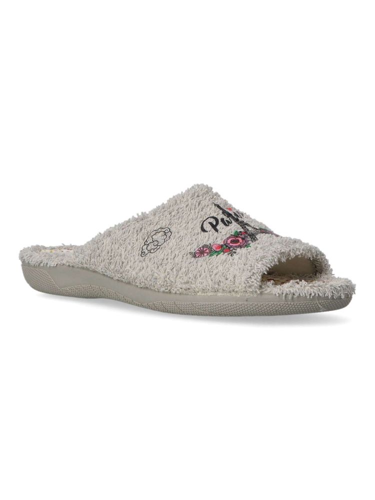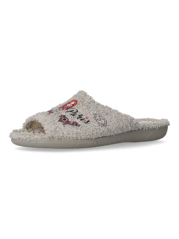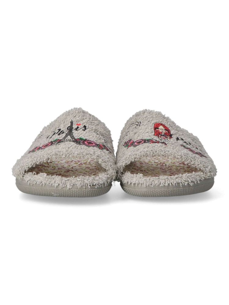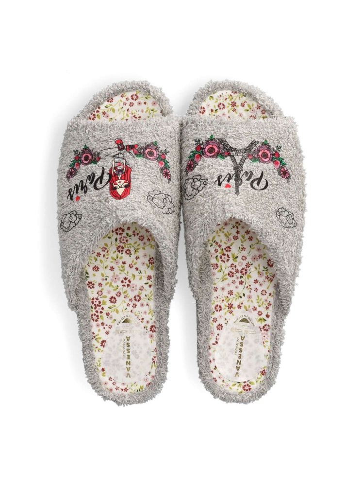 Zapatilla de casa para mujer. Disponible en color gris con dibujo de Torre Paris. Suela de goma flexible. Modelo cómodo fabricado en textil toalla rizo. Plantilla acolchada. Puntera descubierta. Máximo confort en tu descanso diario. Hecho en España.