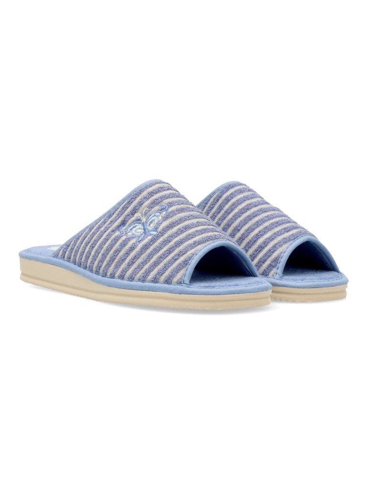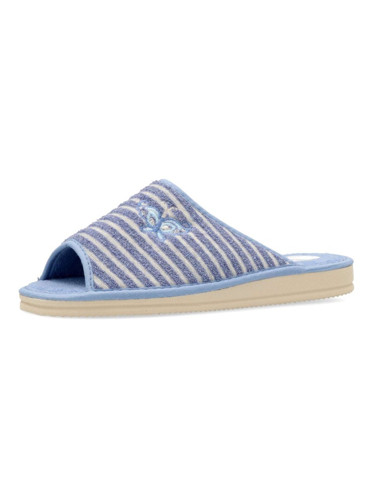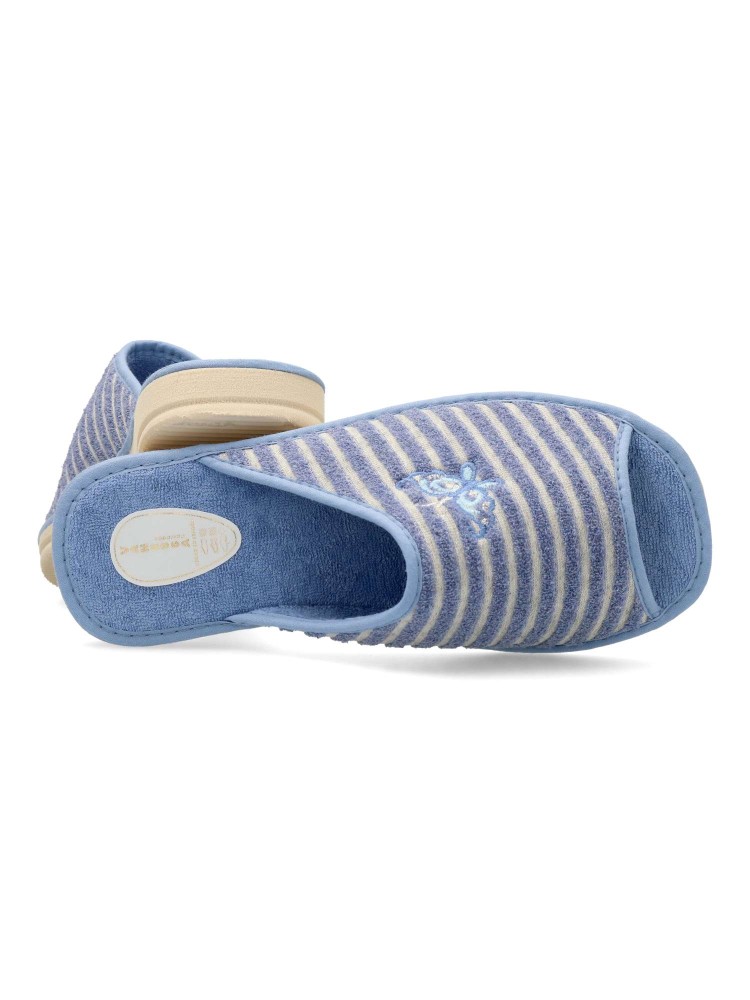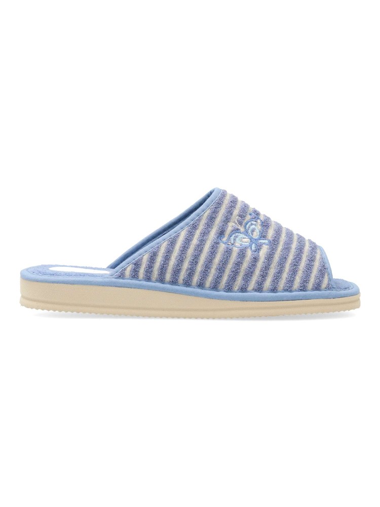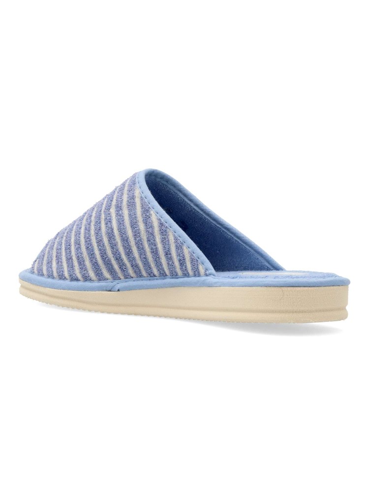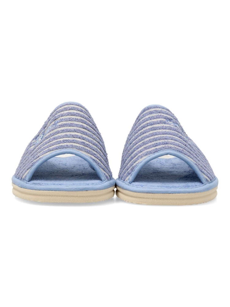 Zapatilla de casa para mujer. Modelo cómodo y ligero, fabricado en textil acolchado y suave, con suela de goma EVA (especial parquet). Color aguamar. Puntera descubierta pinky. Confort máximo para estar en casa. Hecho en España.