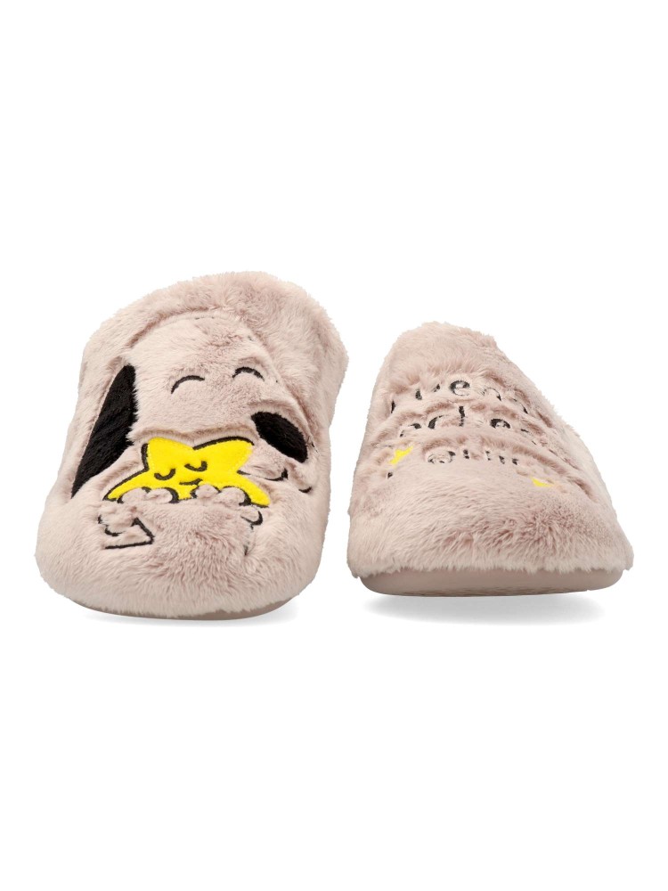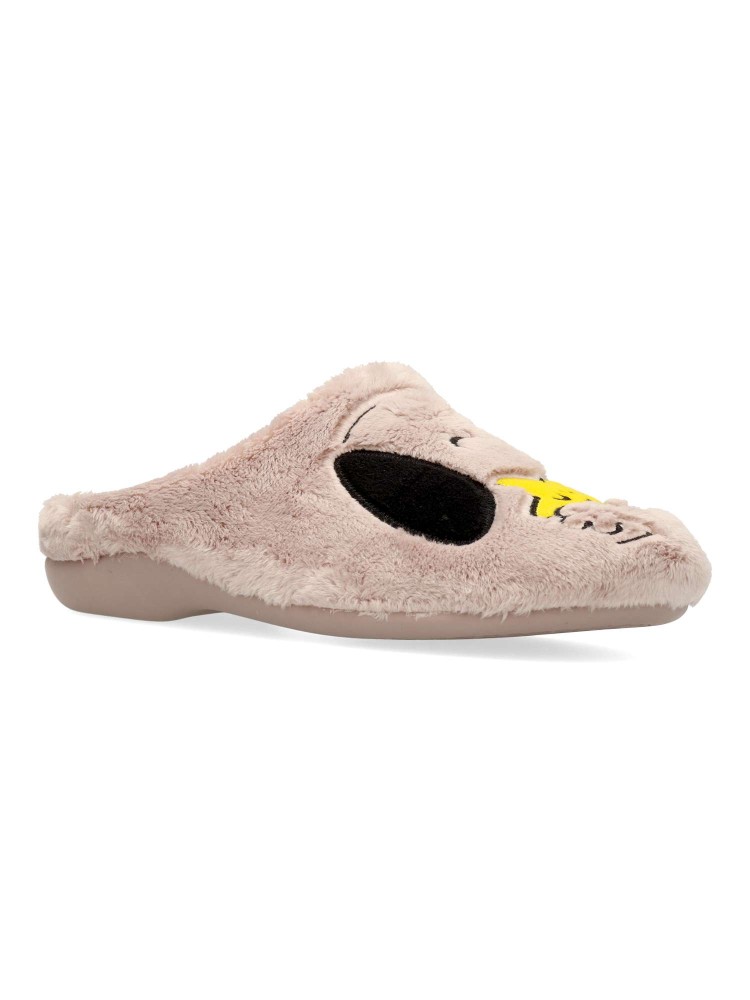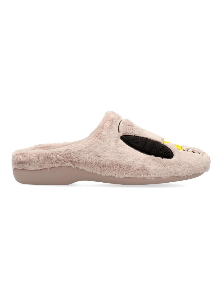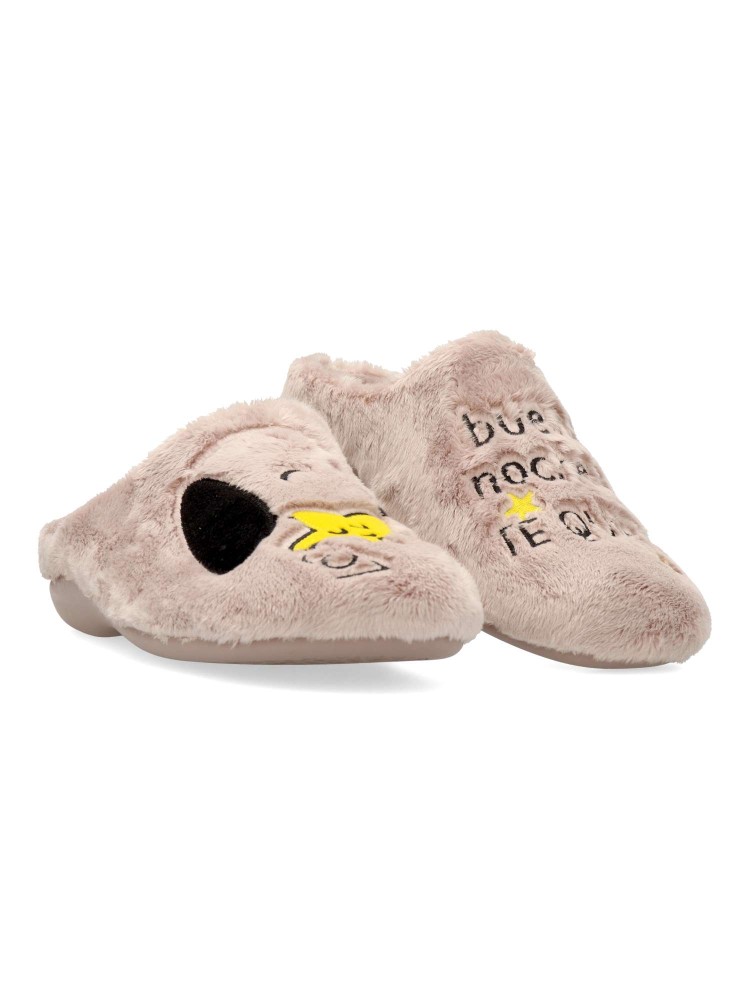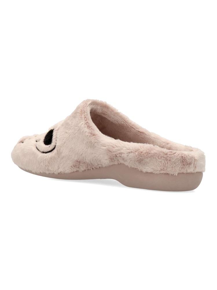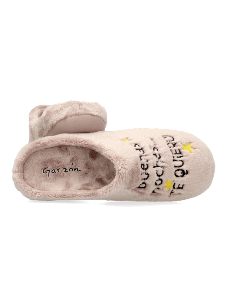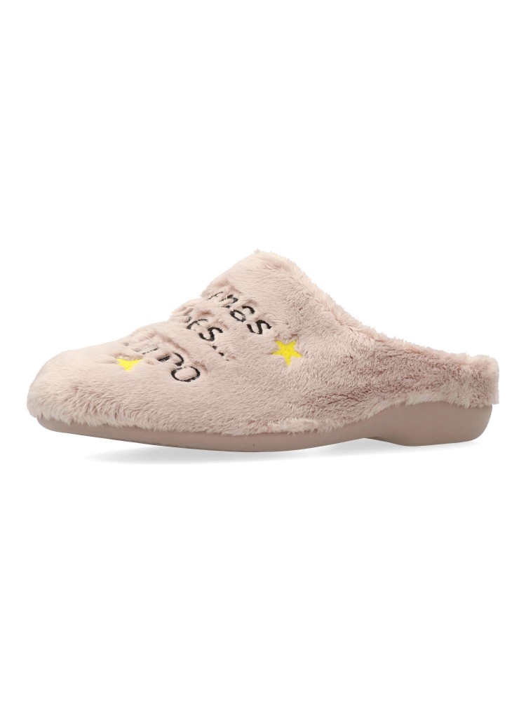 Zapatilla de casa confort para mujer. Disponible en color rosa palo. Piso de goma flexible y antideslizante. Planta acolchada. Zapatilla cómoda y abrigada para los días más fríos. MONTLIS (B. Perro/Frase). Hecho en España.