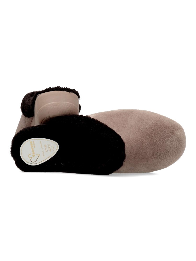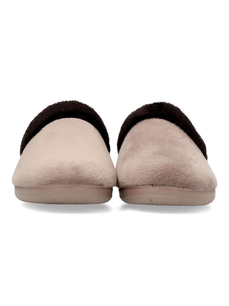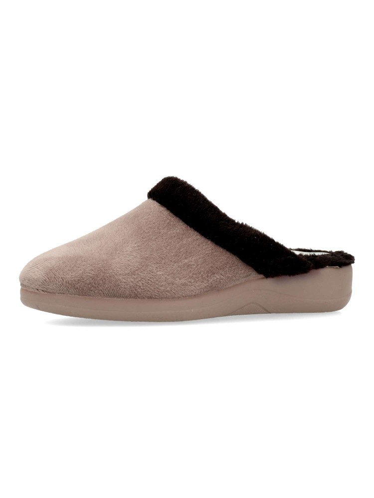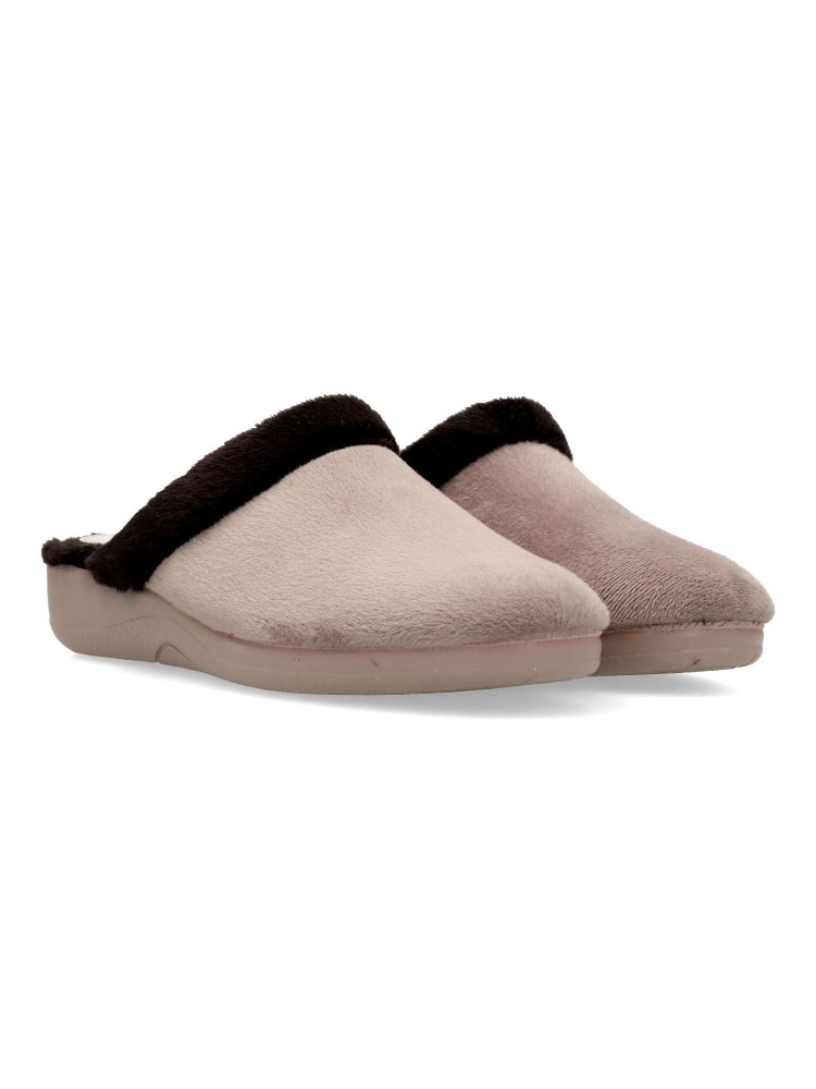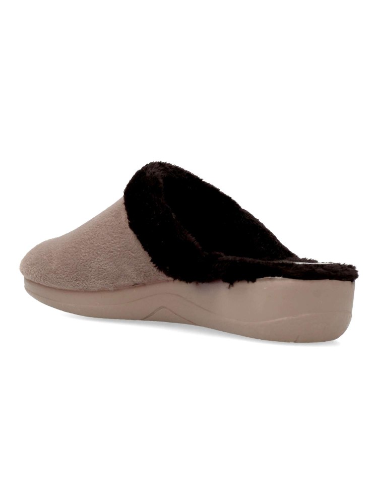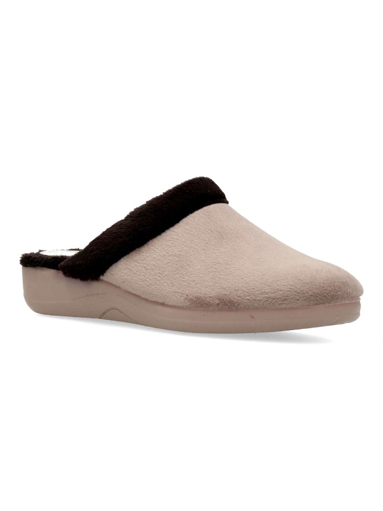 Zapatilla de casa para mujer. Color beige. Fabricada en textil con suela de goma ligera y flexible. Plantilla acolchada. Forro interior de pelo sintético suave. Modelo cómodo y abrigado para los días más fríos. Hecho en España.