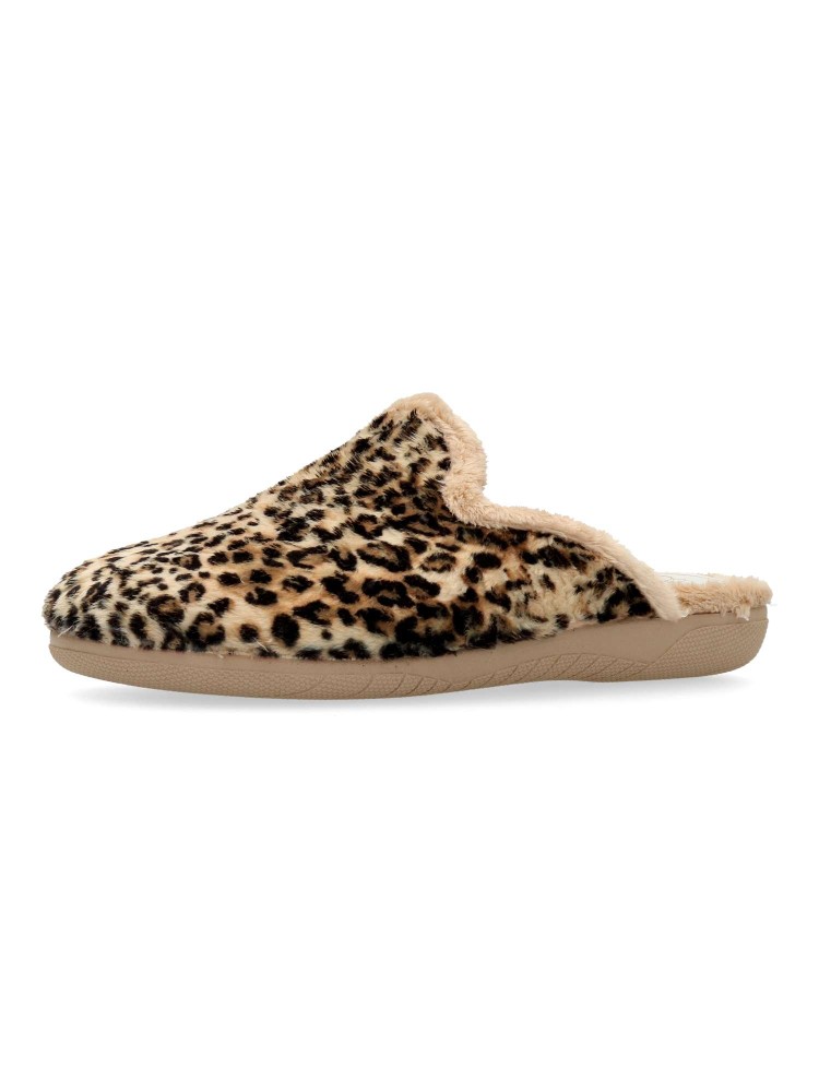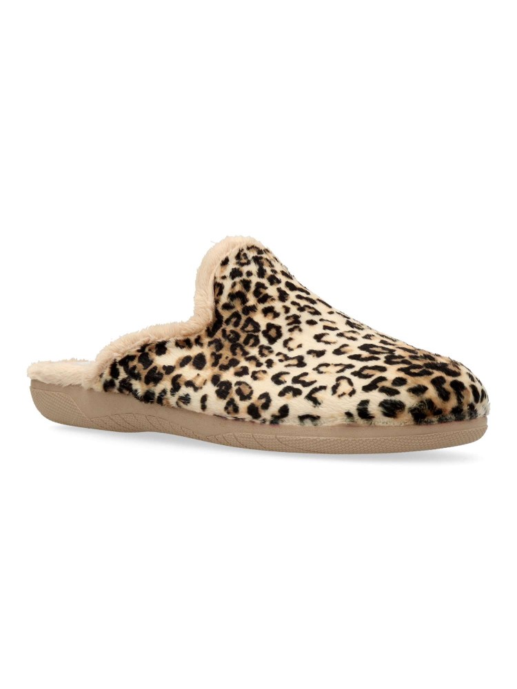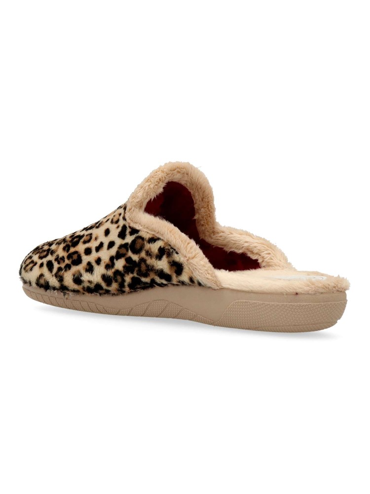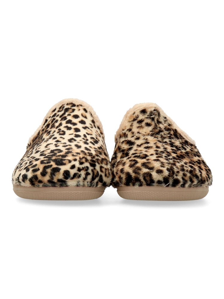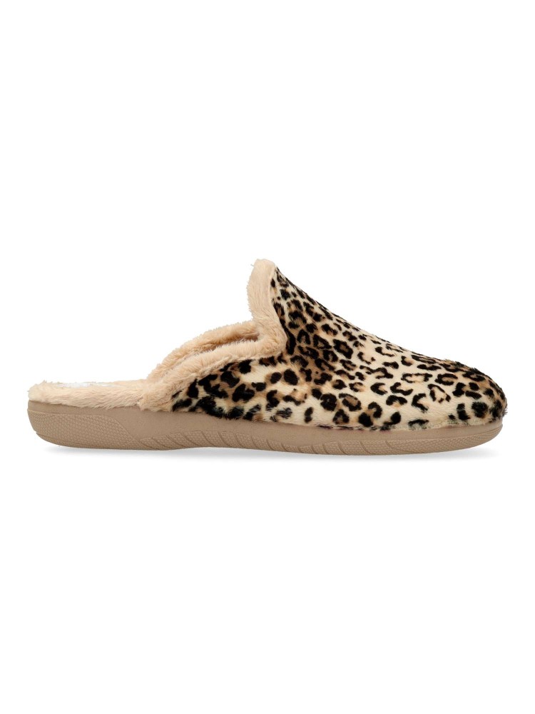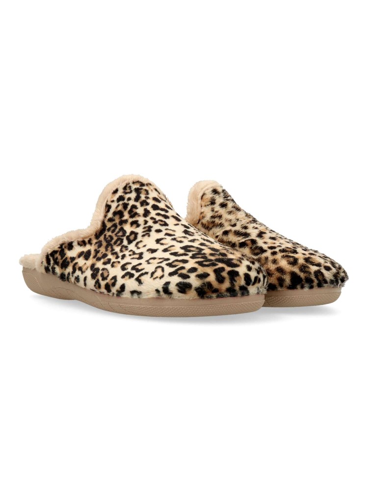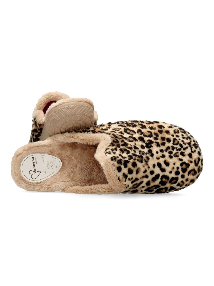 Zapatilla de casa para mujer. Disponible en color beige estampado leopardo. Fabricada en textil, con suela de goma flexible y antideslizante. Plantilla acolchada. Modelo cómodo y abrigado para los días más fríos. Vanessa Calzados. Hecho en España.