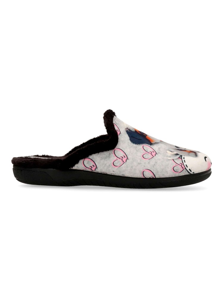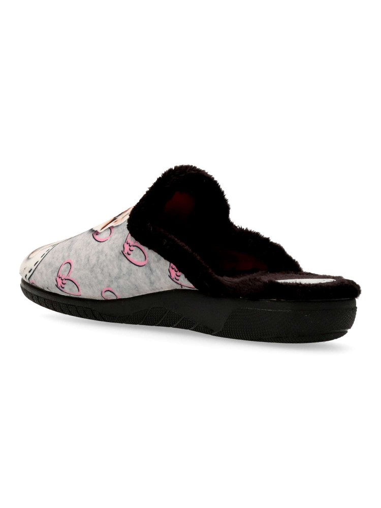 Zapatilla de casa para mujer. Color gris-negro. Interior con pelo sintético. Suela de goma ligera y flexible. Plantilla acolchada. Detalle dibujo estampado. Agradable sensación de comodidad y calidez para los días más fríos. Hecho en España.