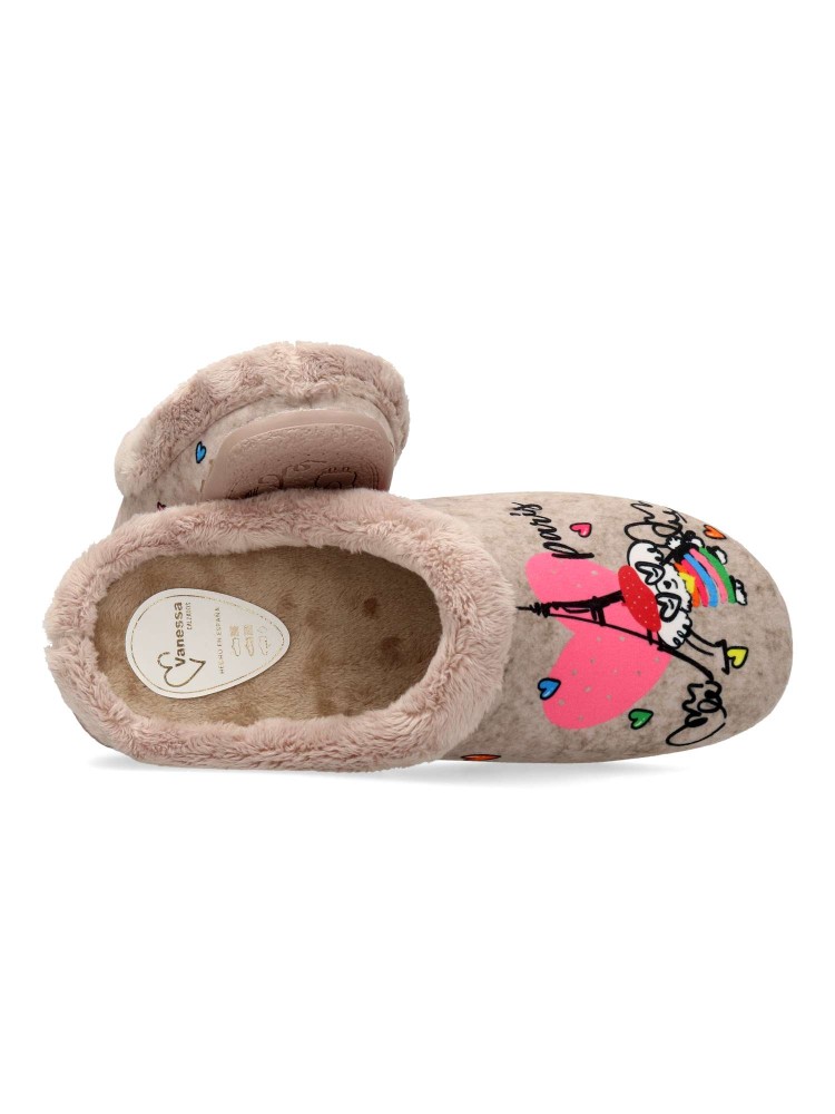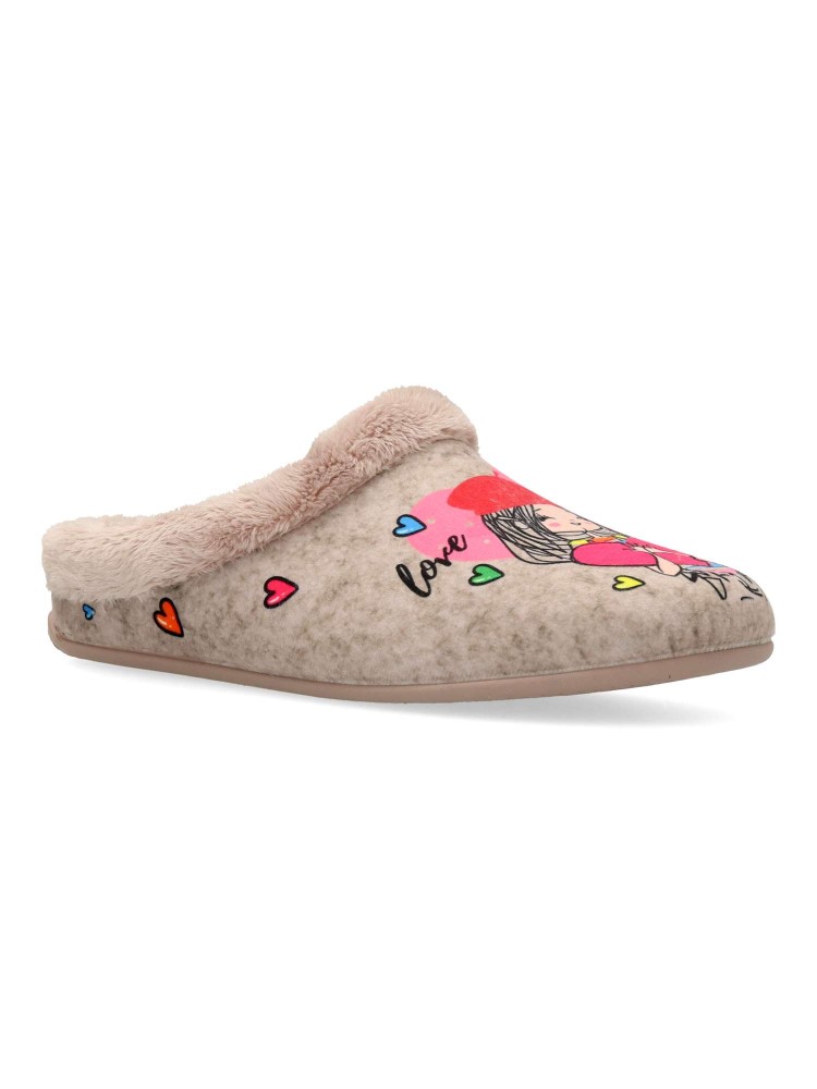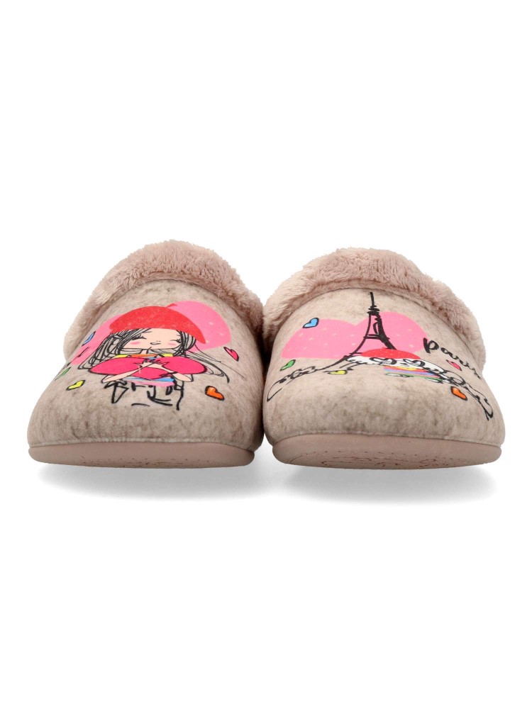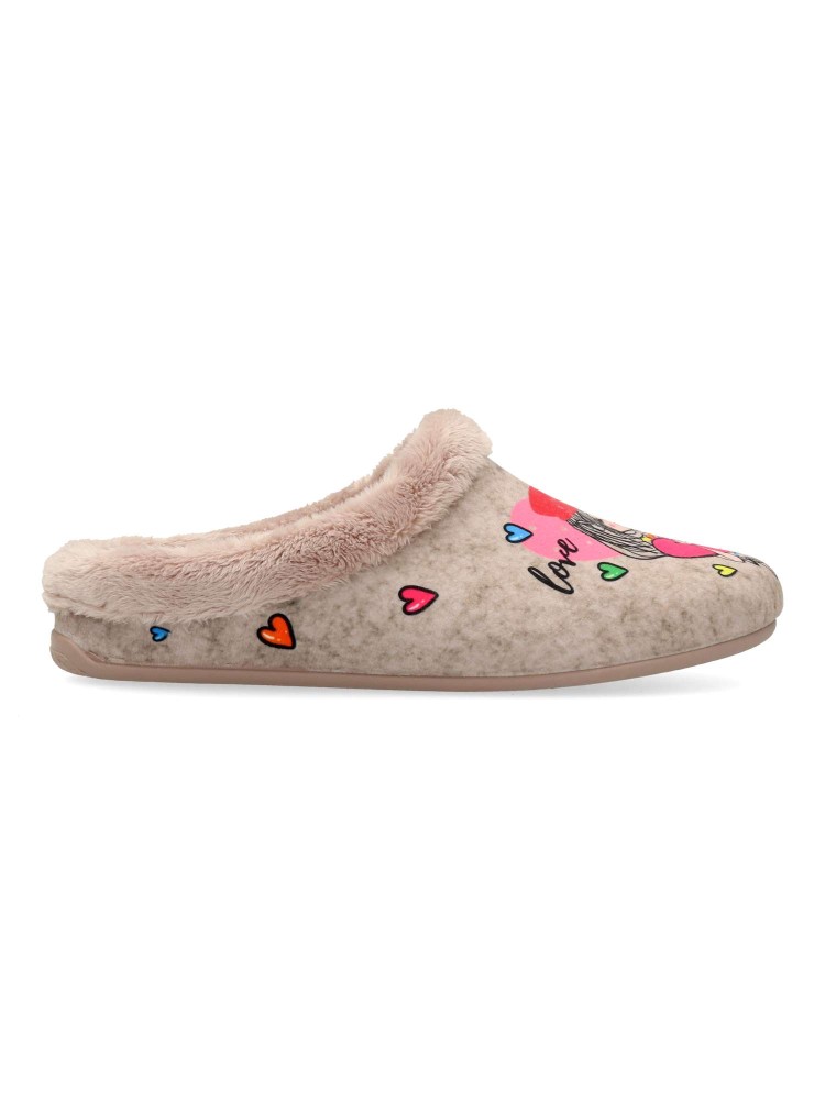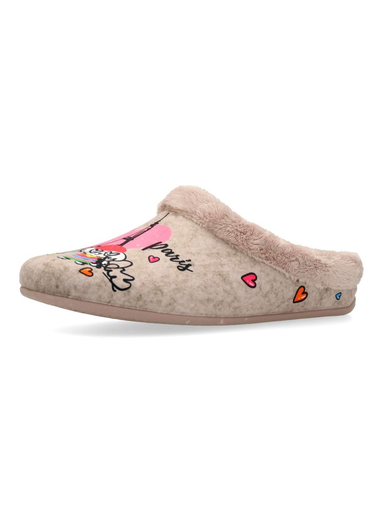 Zapatilla de casa para mujer. Color beige. Interior con pelo sintético suave. Suela de goma ligera y flexible. Plantilla acolchada. Detalle dibujo estampado. Agradable sensación de comodidad y calidez para los días más fríos. Hecho en España.