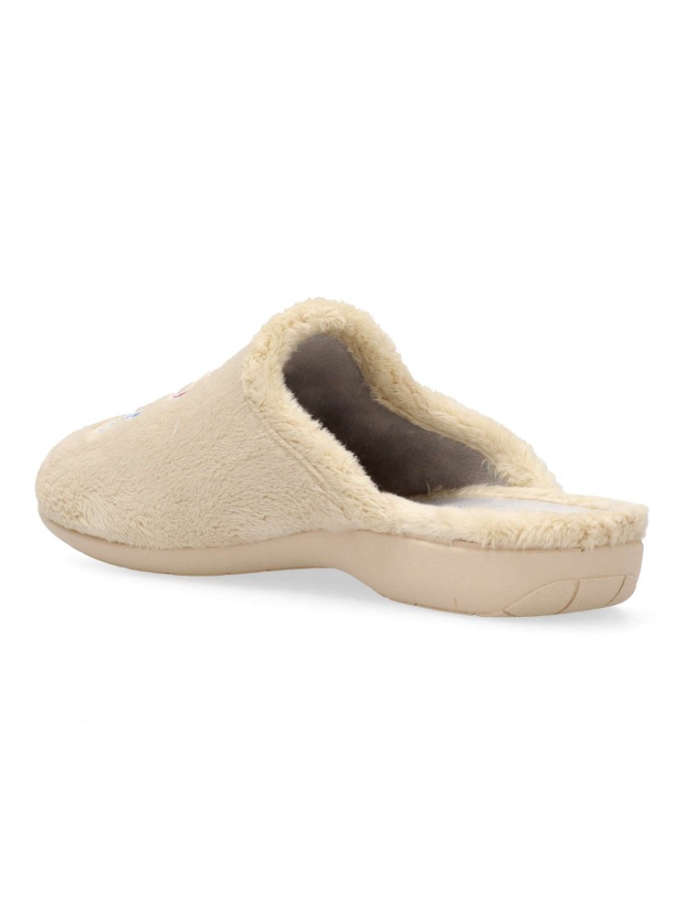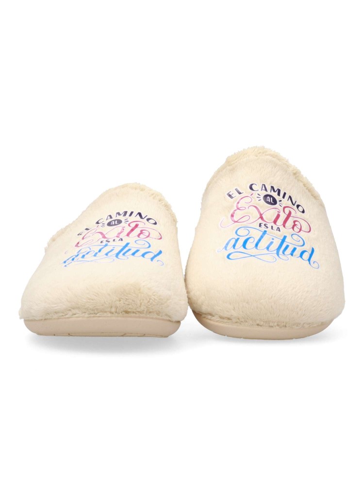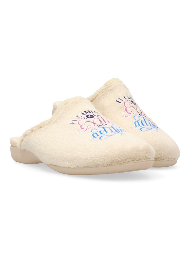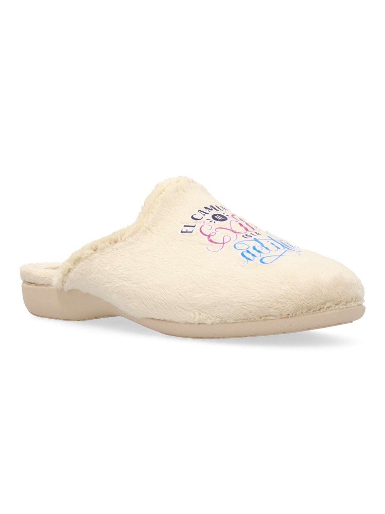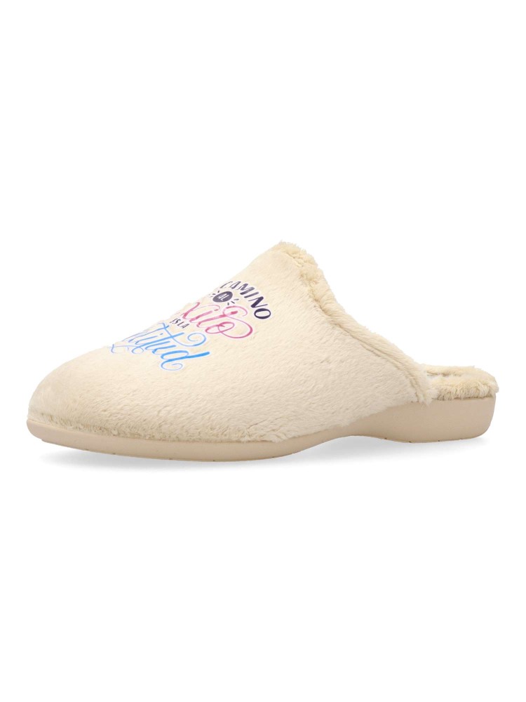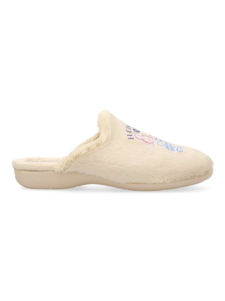Zapatilla de casa plana. Color beige, con dibujo estampado. Fabricada en textil suave, con suela de caucho antideslizante, flexible y ligera. Zapatilla que ofrece confort, calidez y sensación agradable, para los días más fríos. Hecho en España.
