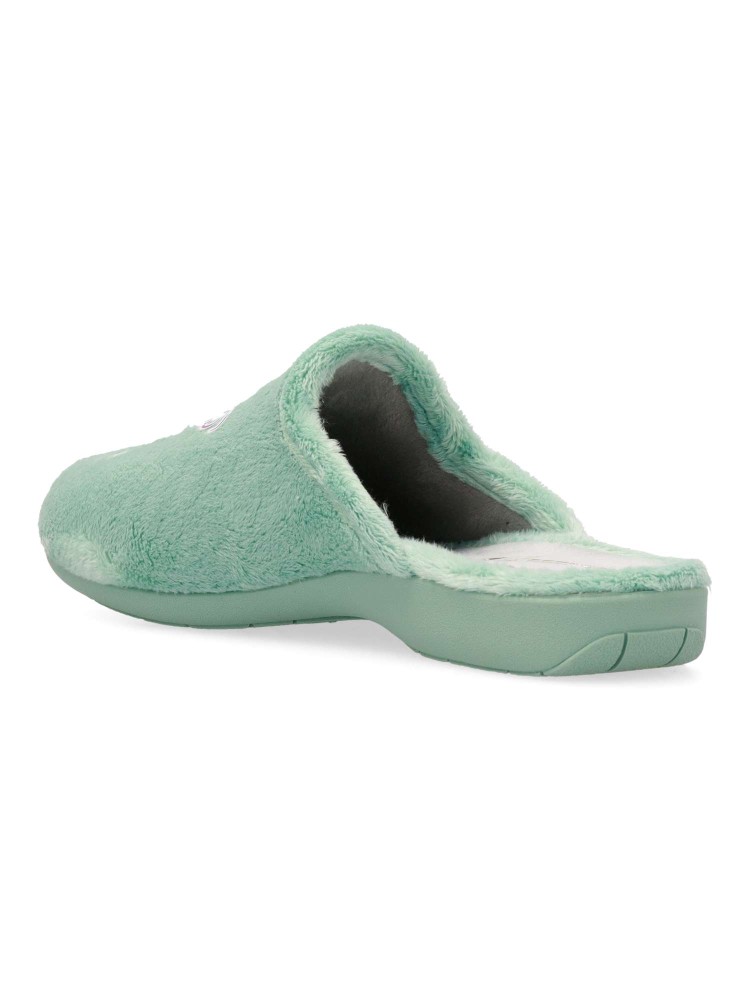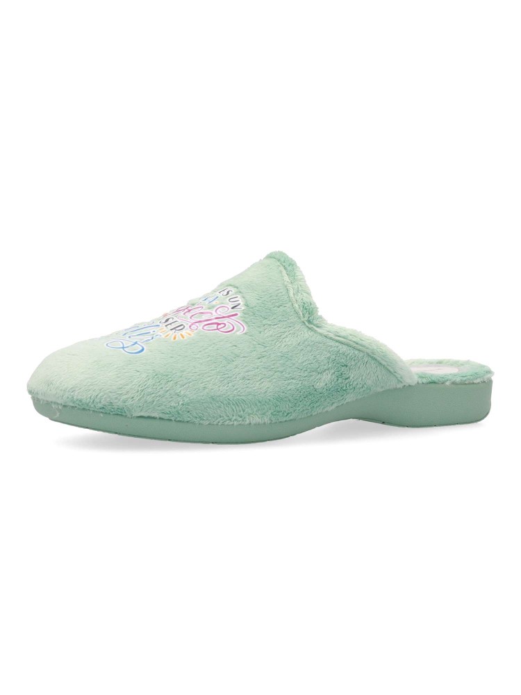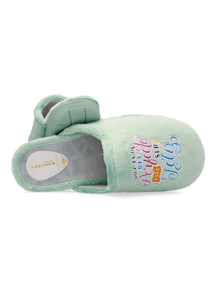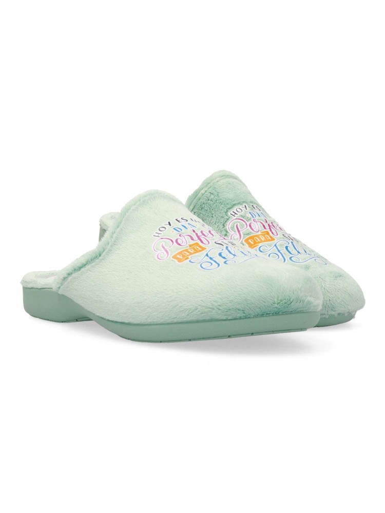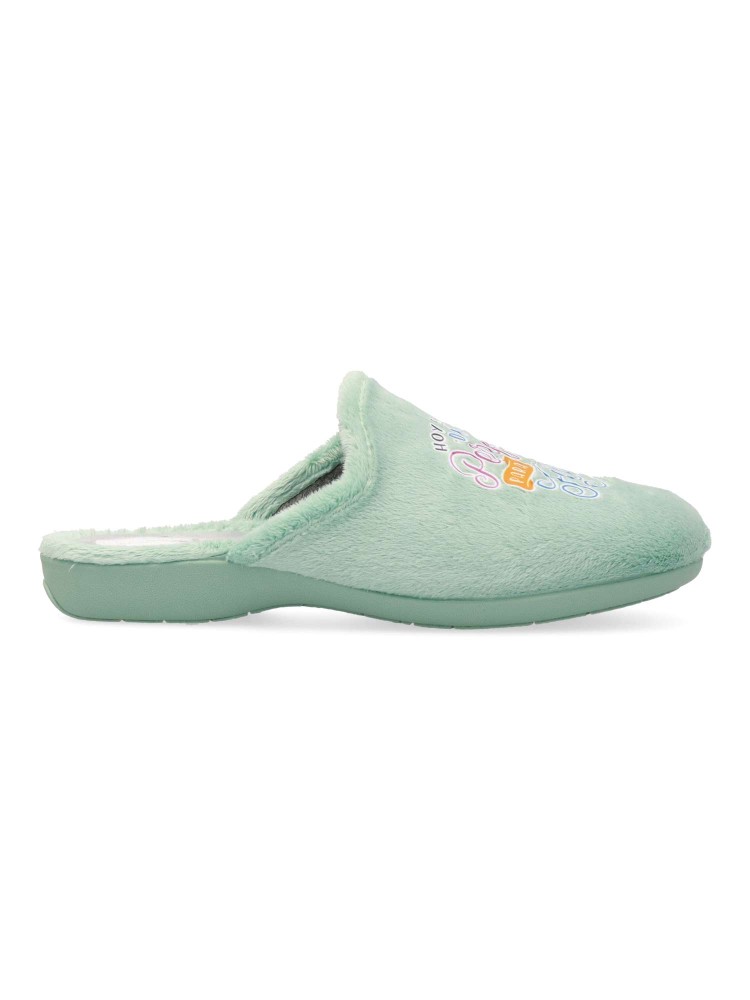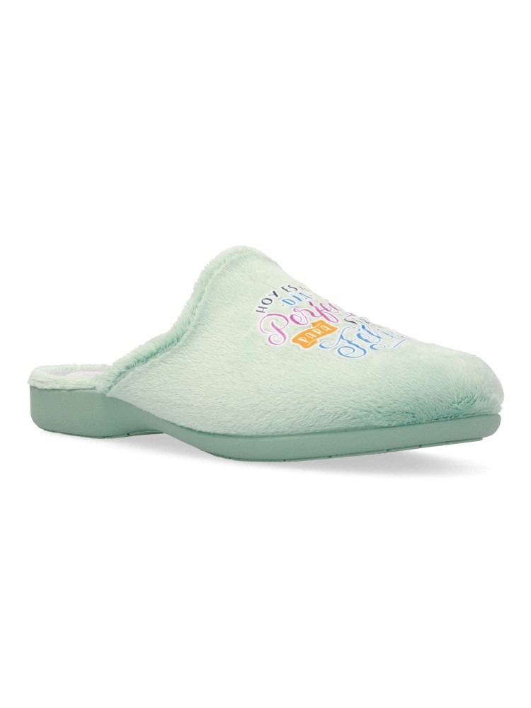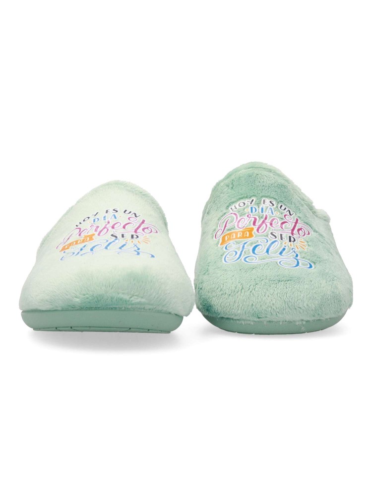 Zapatilla de casa plana. Color verde agua, con dibujo estampado. Fabricada en textil suave, con suela de caucho antideslizante, flexible y ligera. Zapatilla que ofrece confort, calidez y sensación agradable, para los días más fríos. Hecho en España.