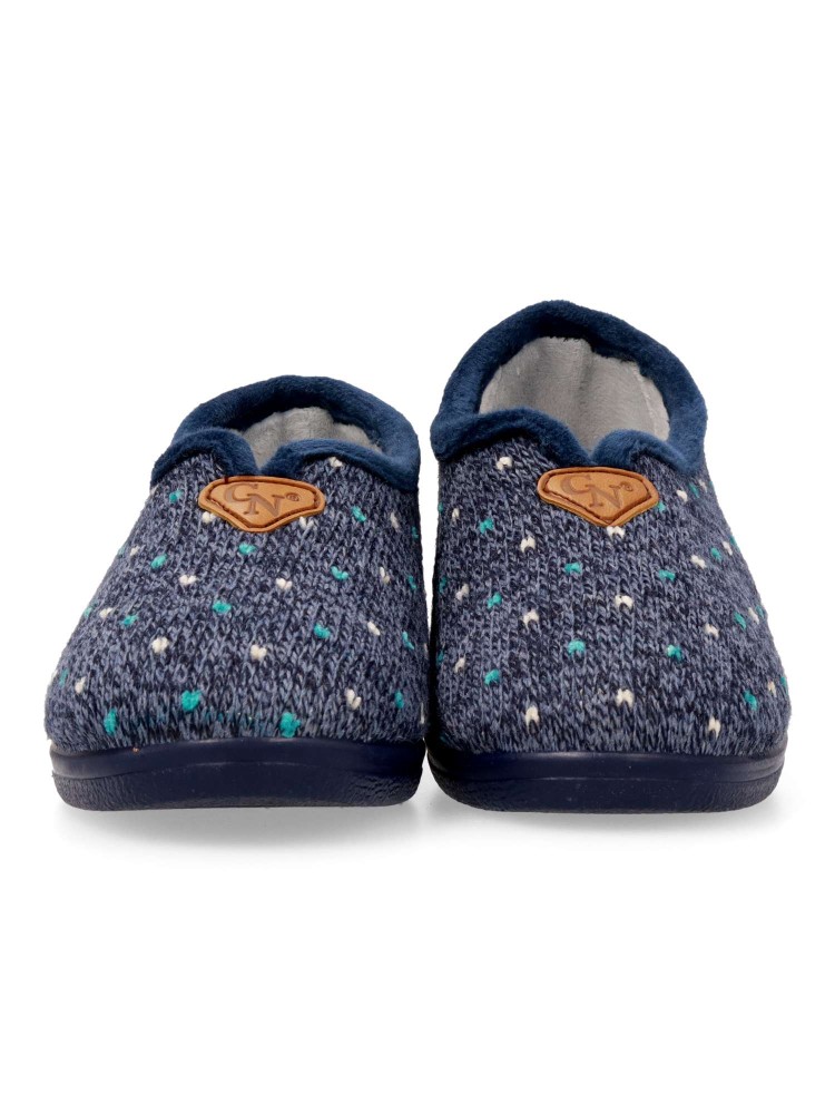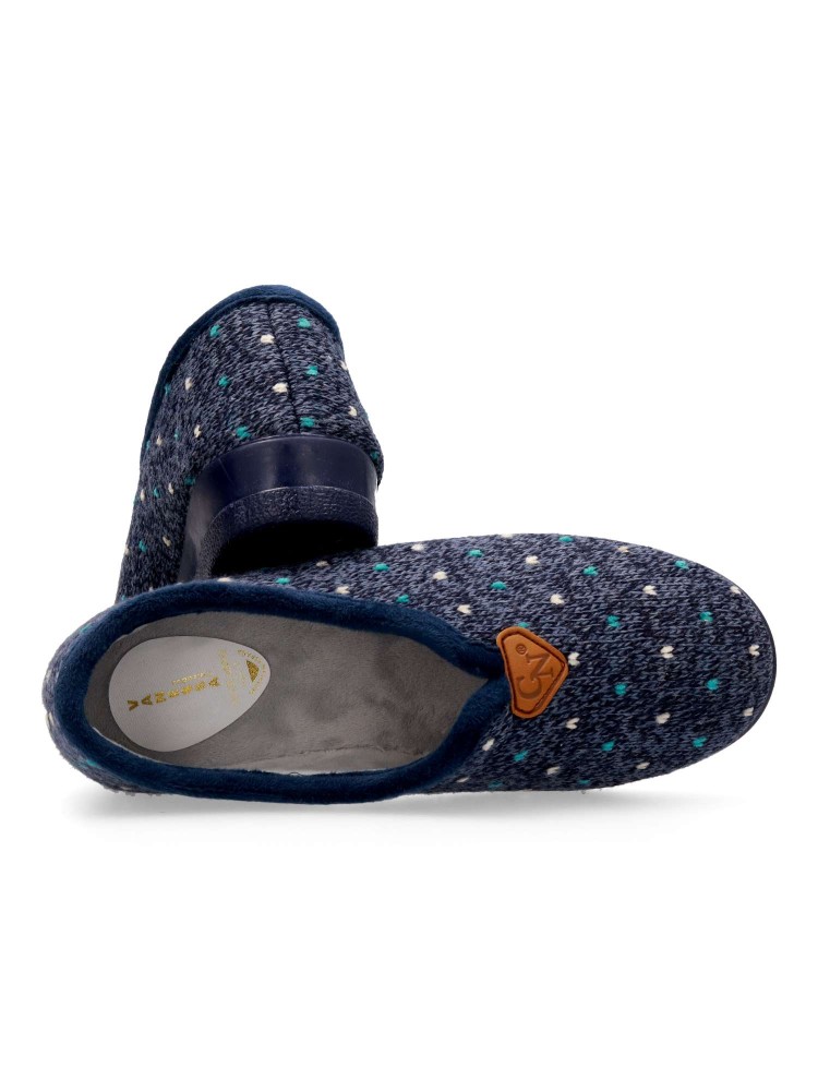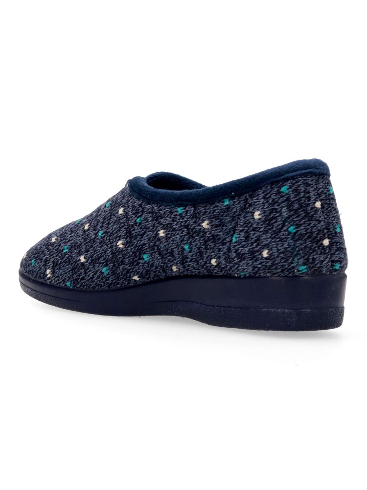 Zapatilla de casa para mujer. Color azul. Fabricada en textil lana suave, con suela de caucho antideslizante, flexible y ligera. Plantilla acolchada. Zapatilla cerrada que te ofrece confort y te abriga en los días más fríos. Hecho en España.