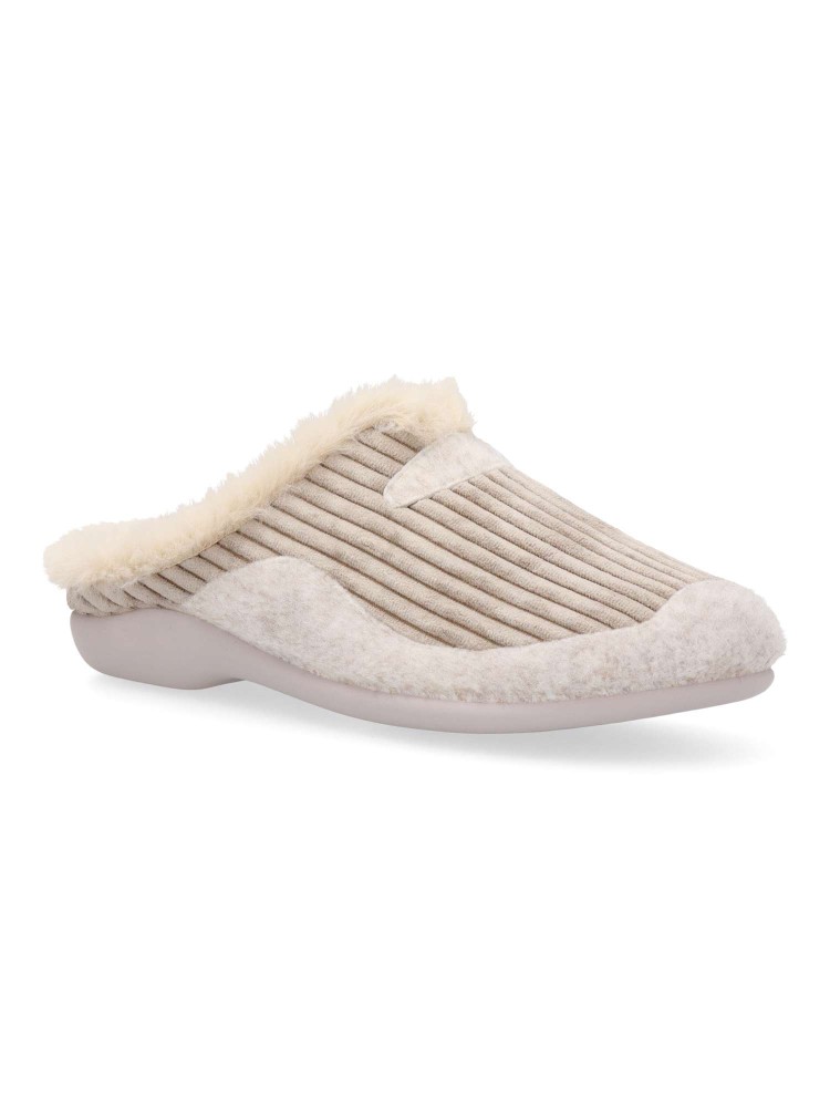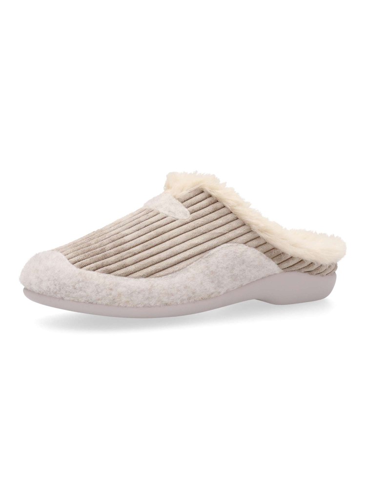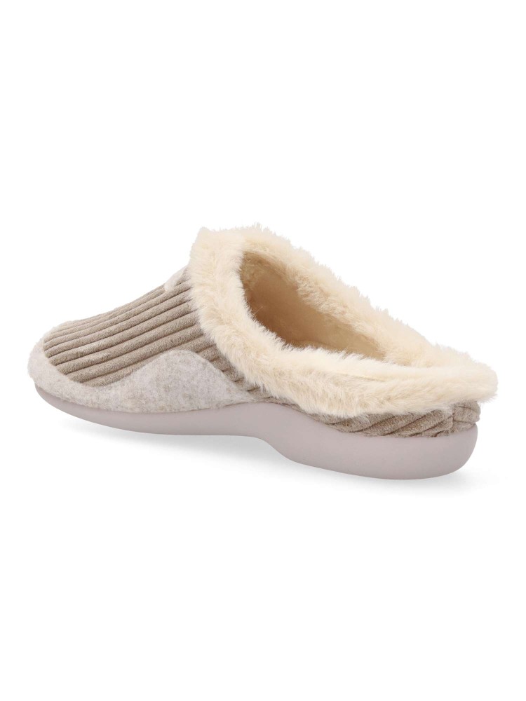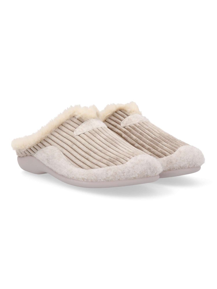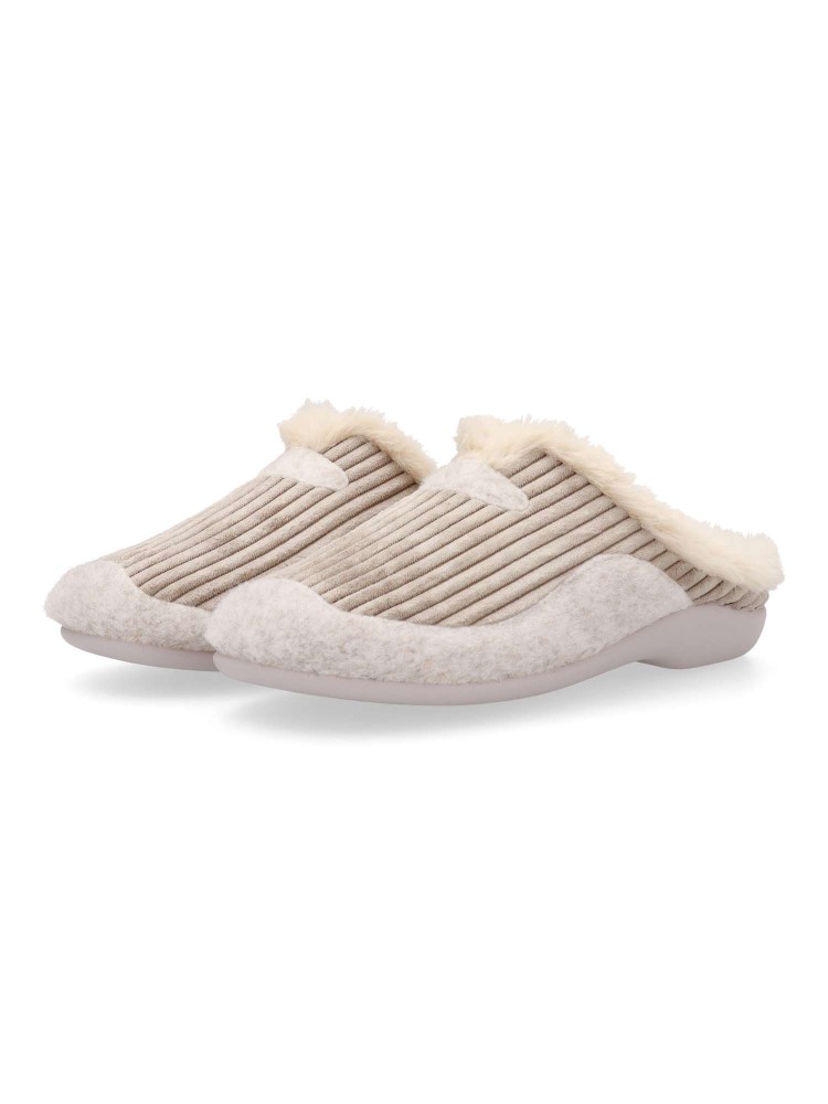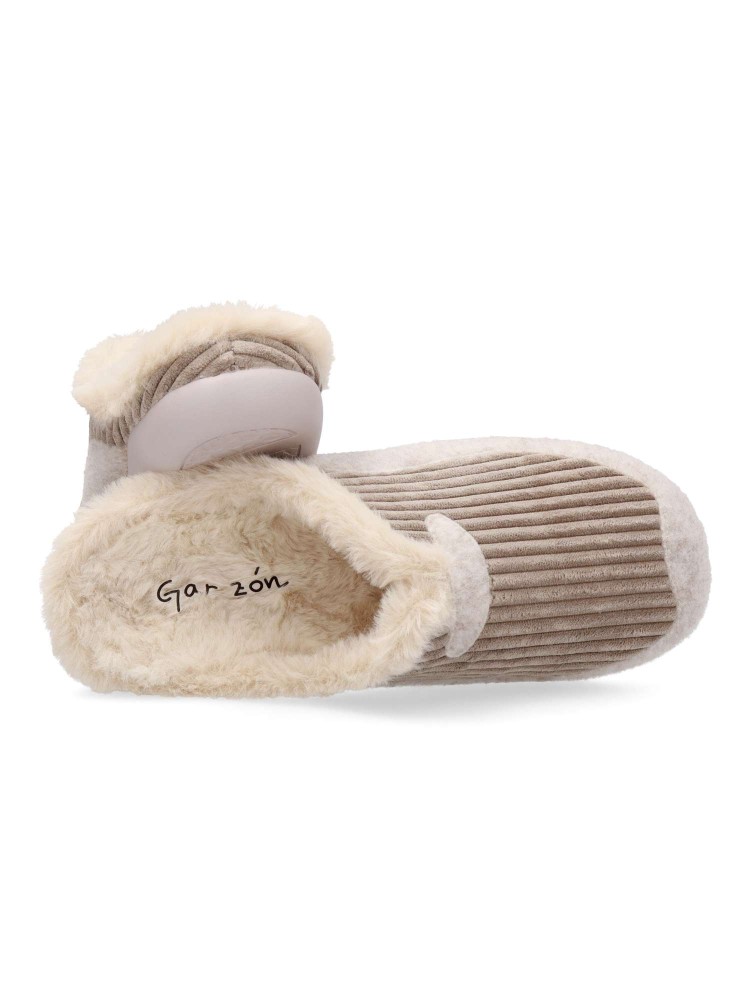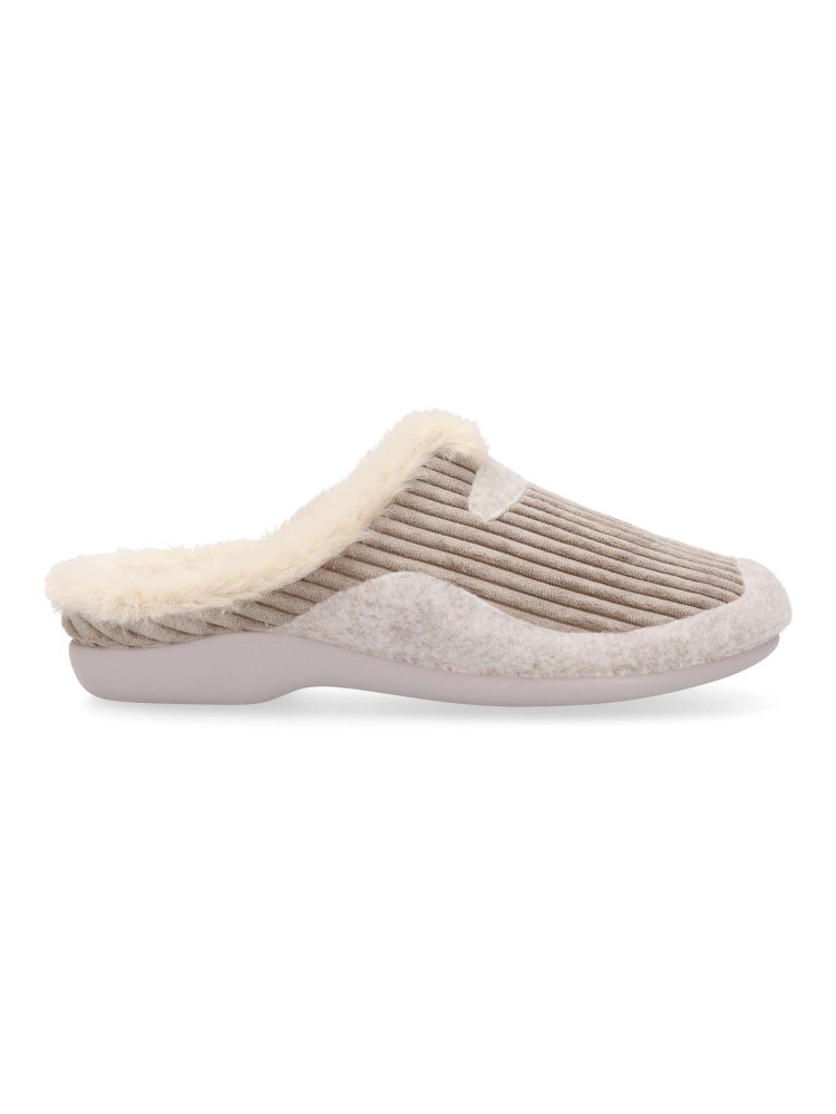 Zapatilla de casa para mujer. Disponible en color taupe. Piso de goma flexible y antideslizante. Plantilla acolchada. Modelo cómodo y abrigado para los días más fríos. FARM (ZUECO CHAPA - BANDA). Hecho en España.