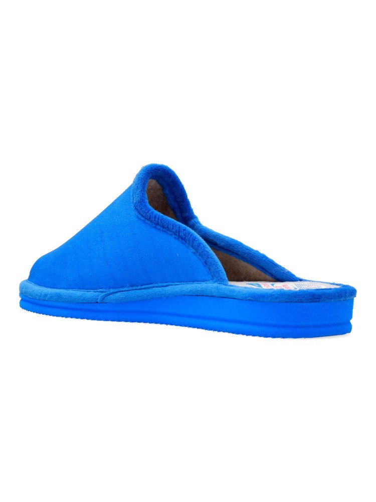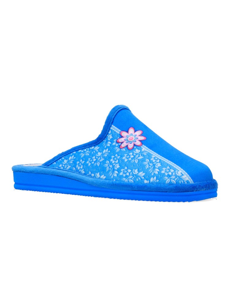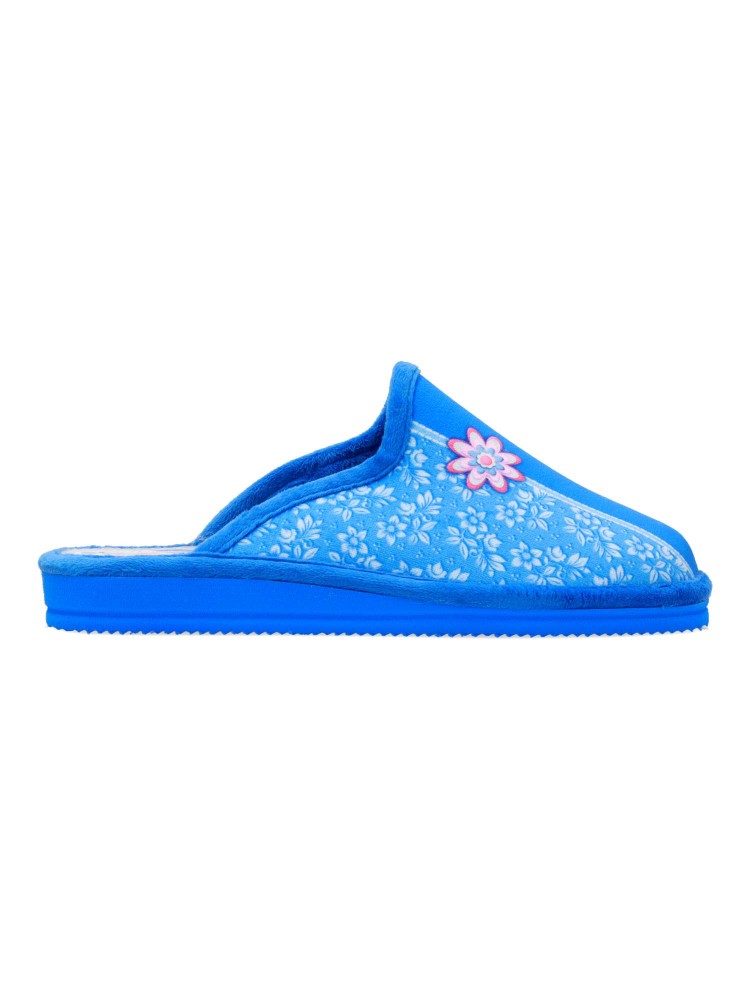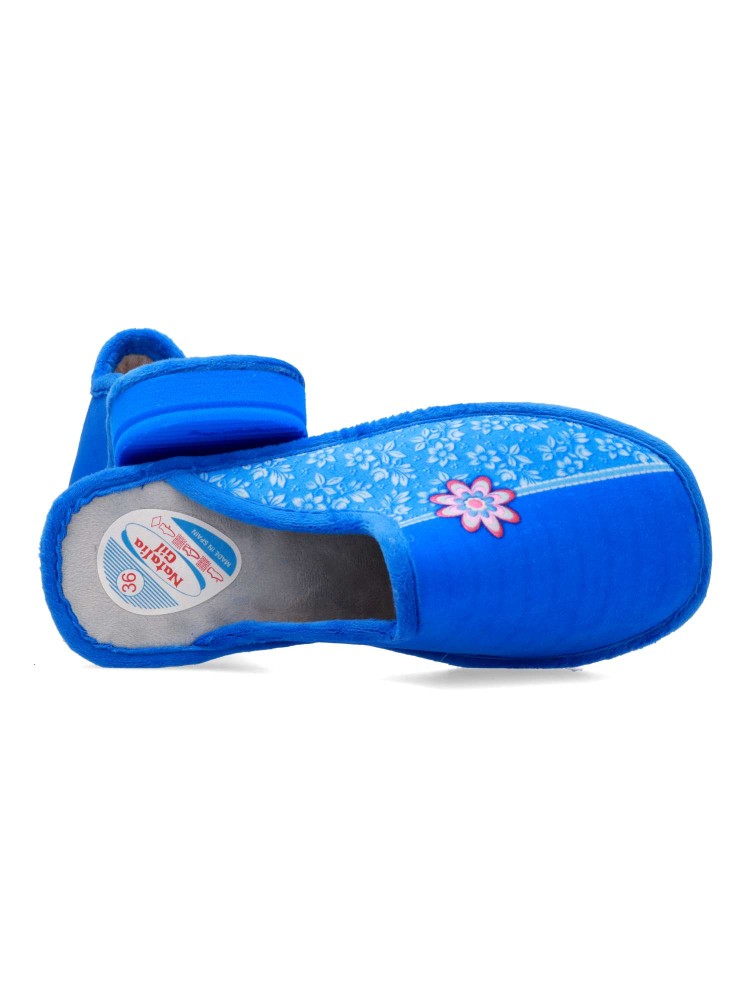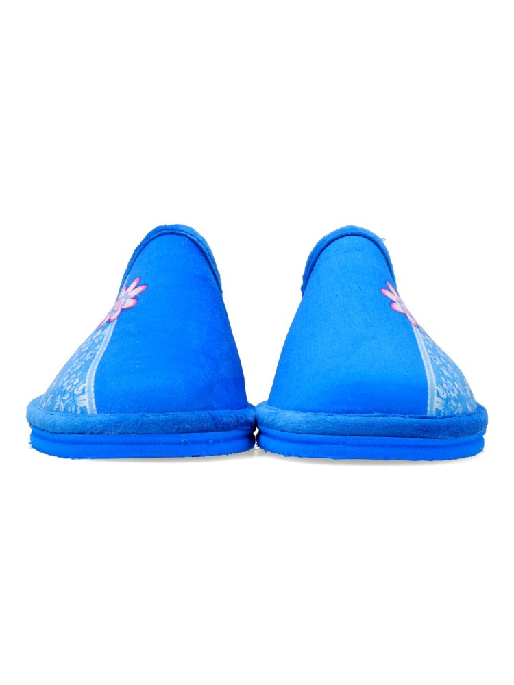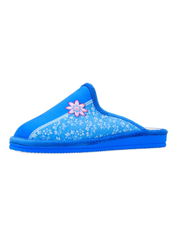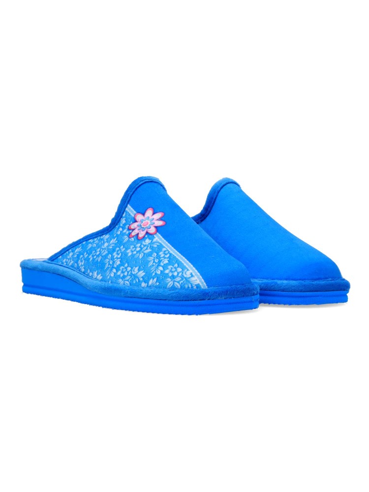 Zapatilla de casa para mujer. Disponible en color francia. Fabricada en textil suave, con suela de goma EVA (especial parquet). Detalle estampado flores. Modelo ligero, cómodo y abrigado para los días más fríos. Hecho en España.